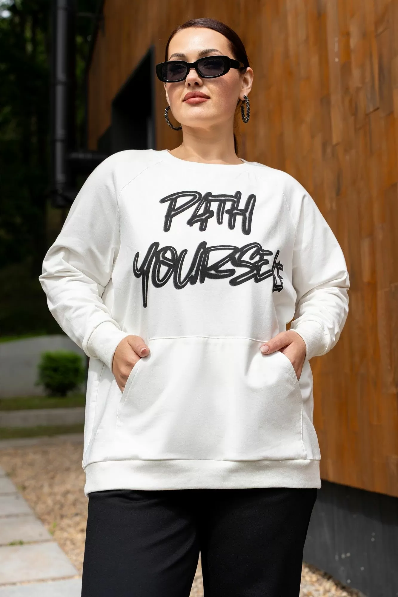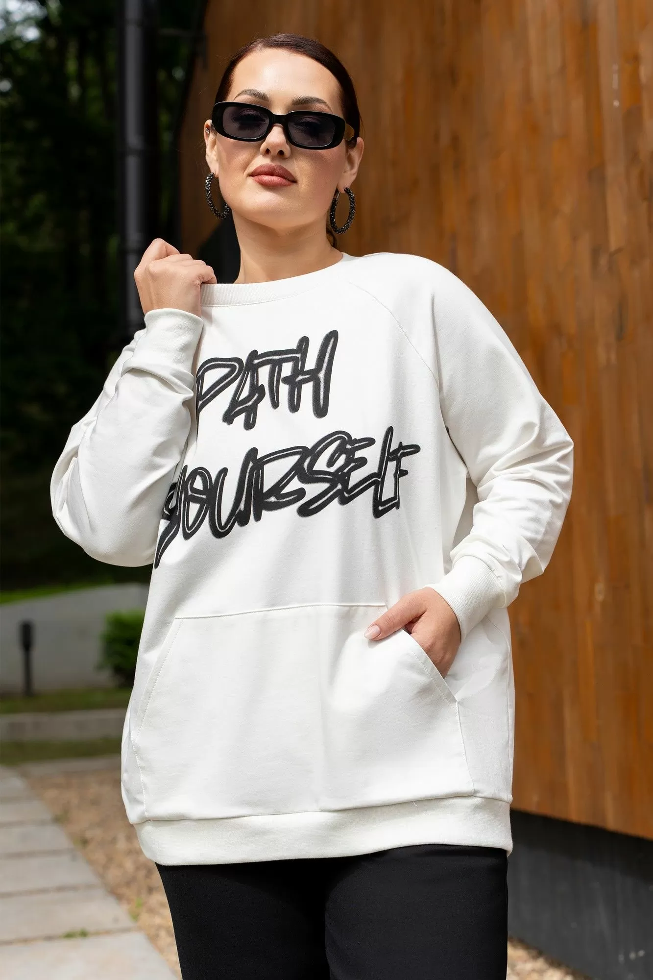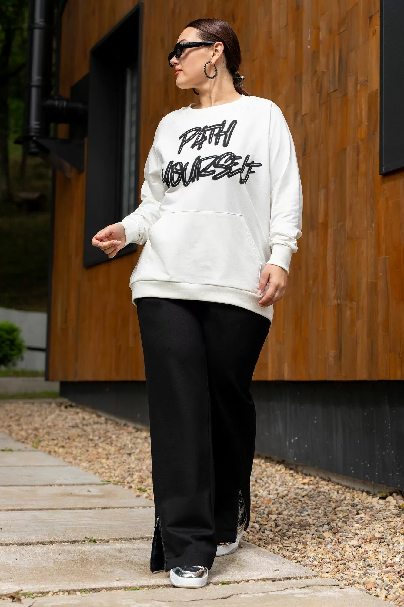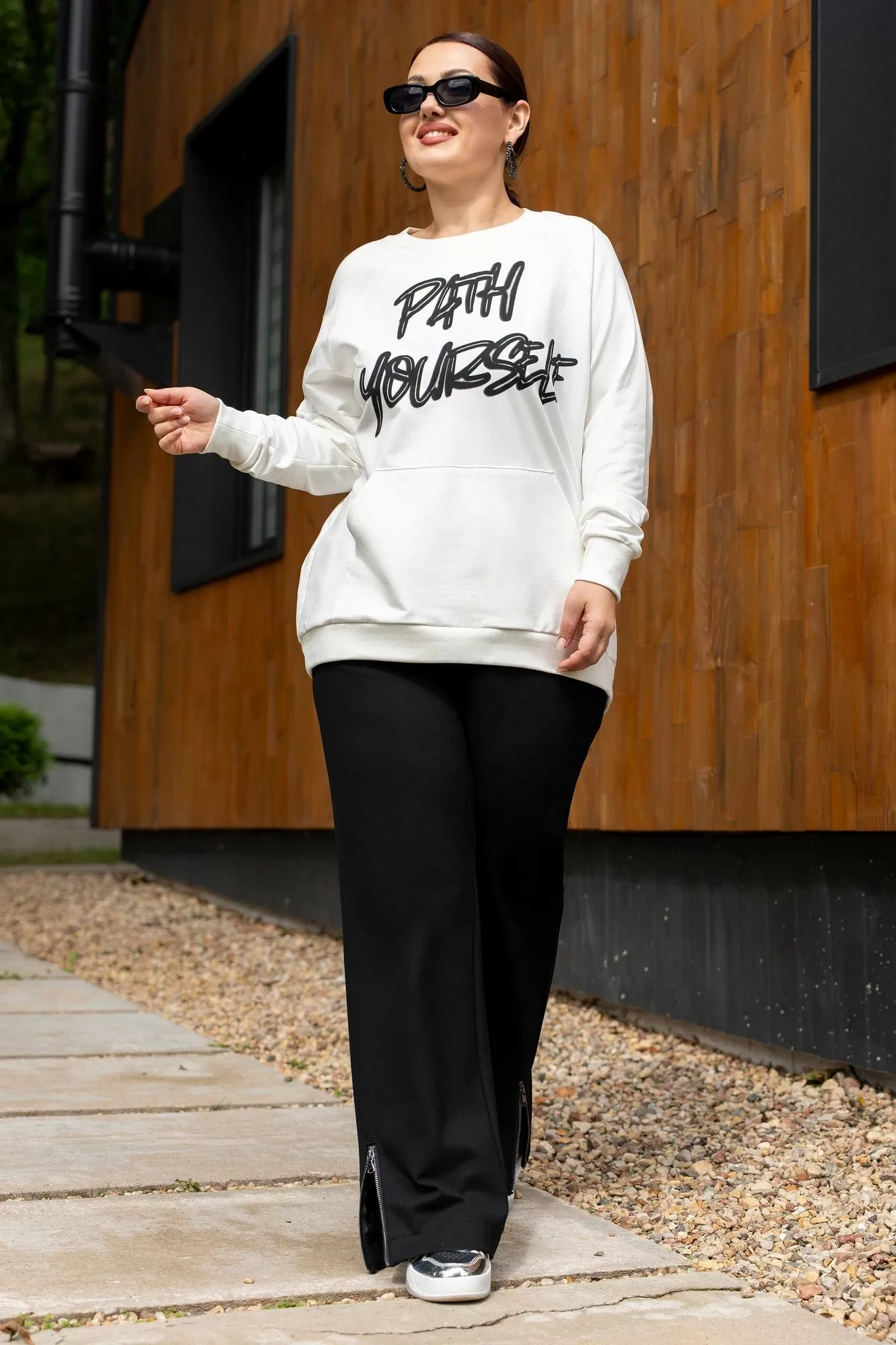 Костюм женский джемпер и брюки из трикотажа. Джемпер прямого кроя с дизайнерской печатью , полочка с накладным карманом.Джемпер с притачными рукавами и манжетами. Брюки женские прямого силуэта, пояс на резинке.Боковые карманы на молниях.По низу брюк обработаны разрезы на молниях.