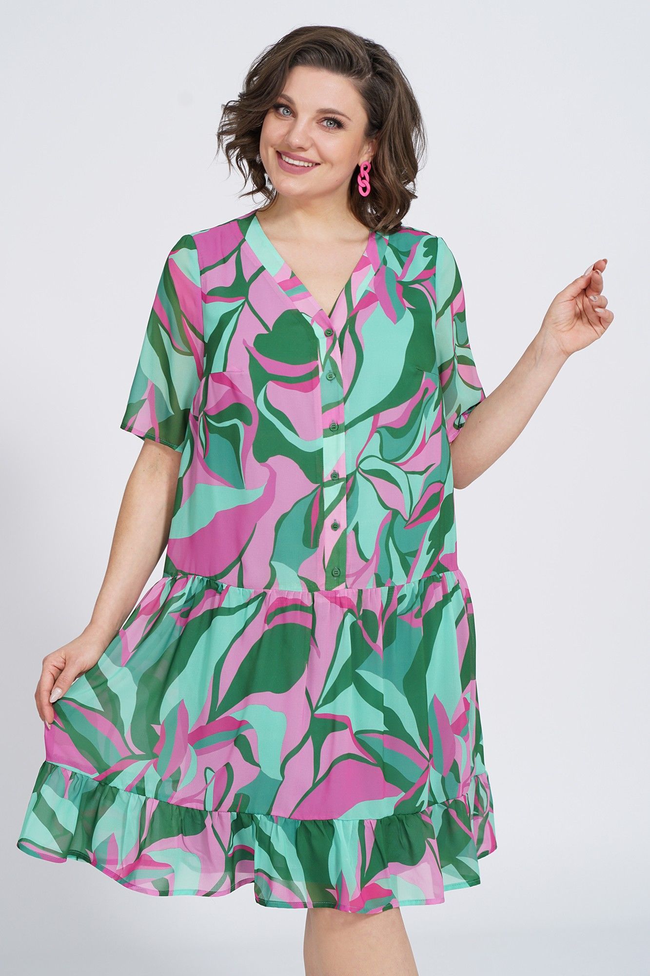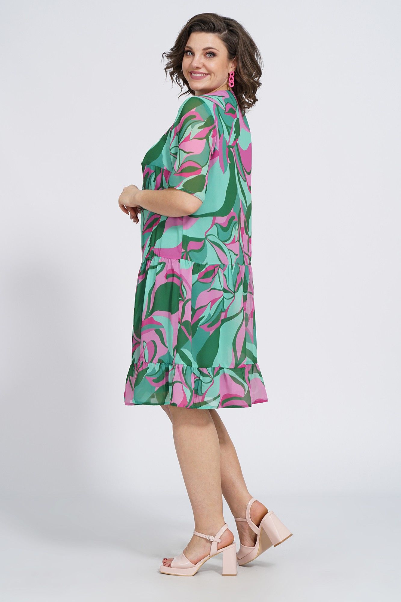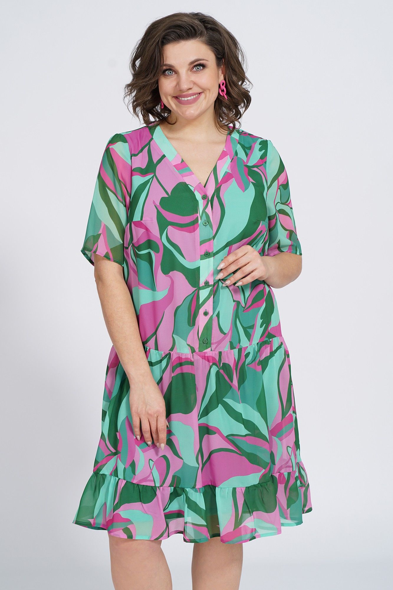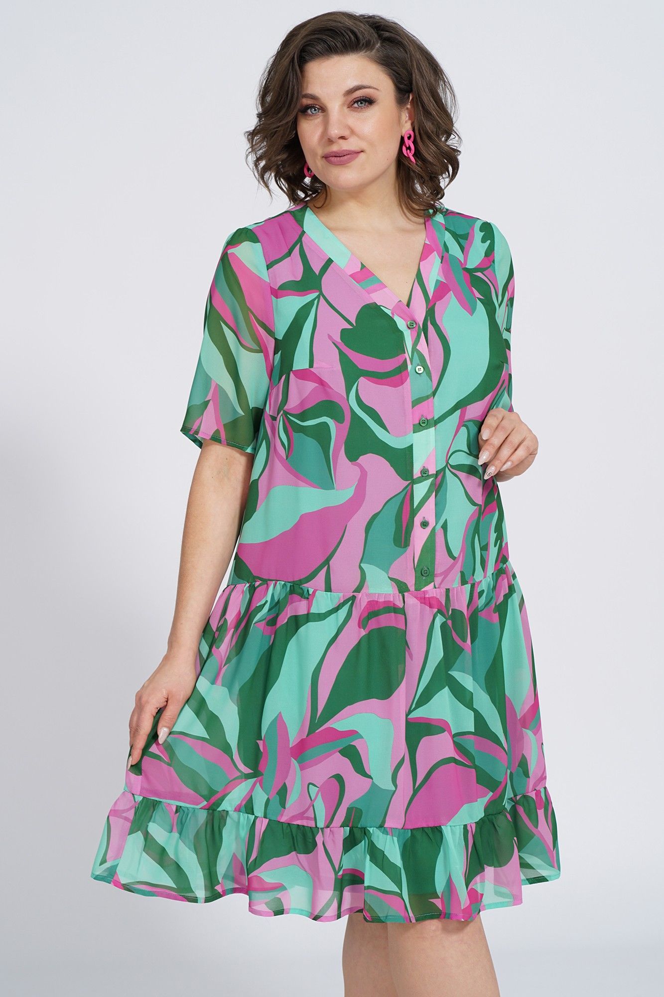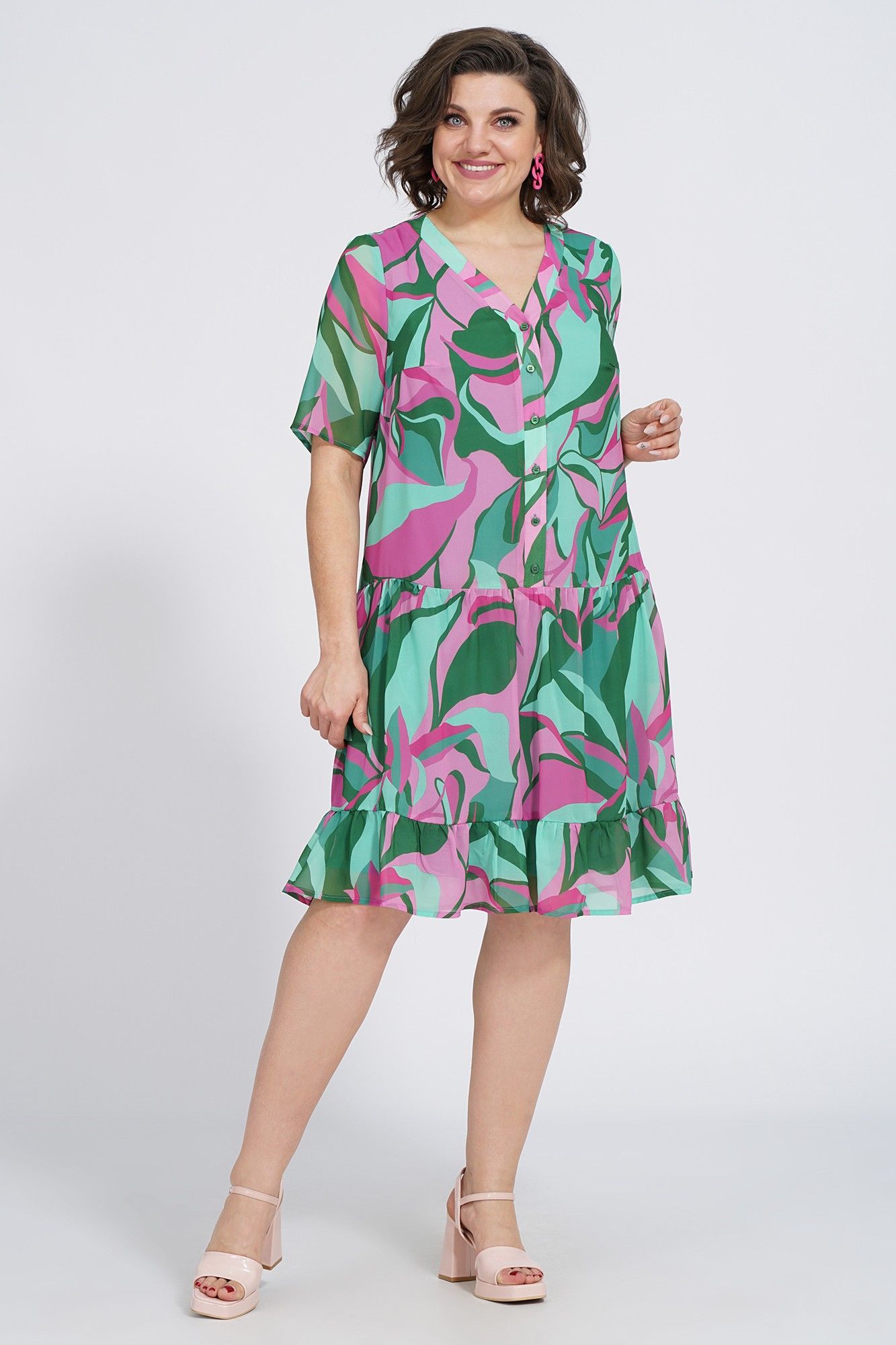 Платье женское силуэта А- образной формы, на подкладке, ниже линии талии, понизу с двумя притачными оборками разной ширины по шву соединения собраны на сборку. С застёжкой по притачной планке на петли и пуговицы. Перед с нагруными выточками. Рукава втачные, одношовные, короткие.
