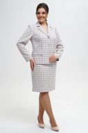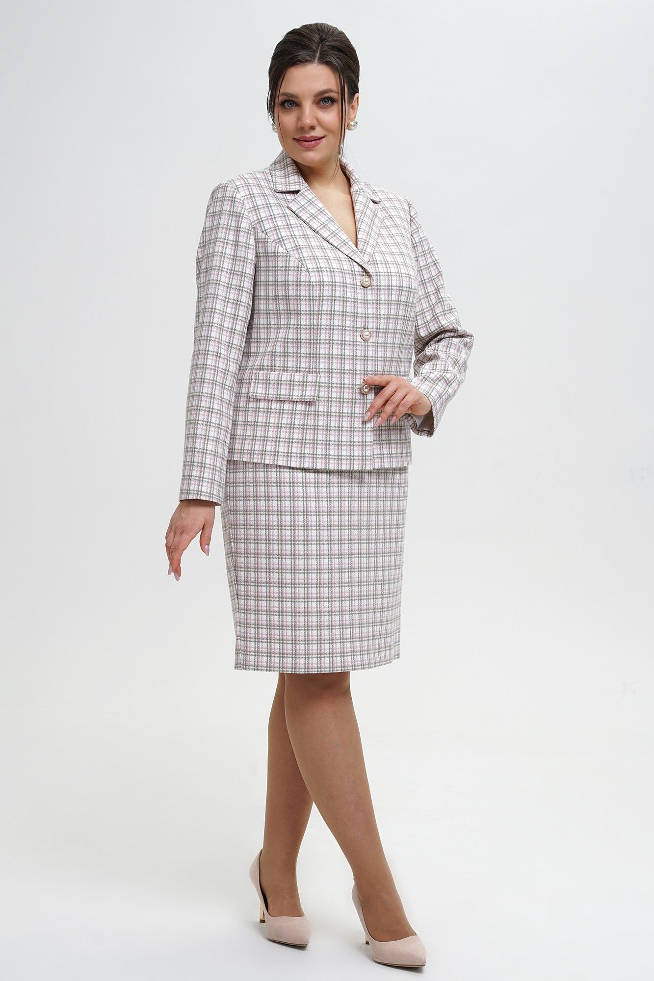 Жакет полуприлегающего силуэта, на подкладке, с застёжкой на петли, пуговицы. Перед с отложными лацканами, рельефными швами и декоративными клапанами. Спинка со средним швом и рельефными швами. Рукава втачные, двухшовные, длинные. Воротник отложной с отворотом. Юбка полуприлегающего силуэта, книзу чуть заужена, на подкладке, на притачном поясе по боковым на резинке, с застёжкой на потайную молнию по среднему шву спинки и петлю, пуговицу по краю пояса. Переднее полотнище с талевыми выточками. Заднее с талевыми выточками и средним швом заканчивающийся шлицей