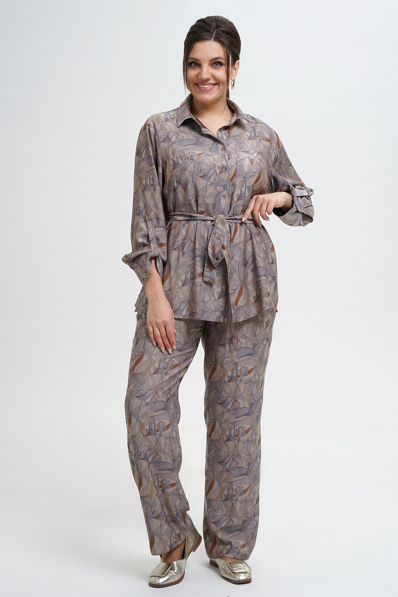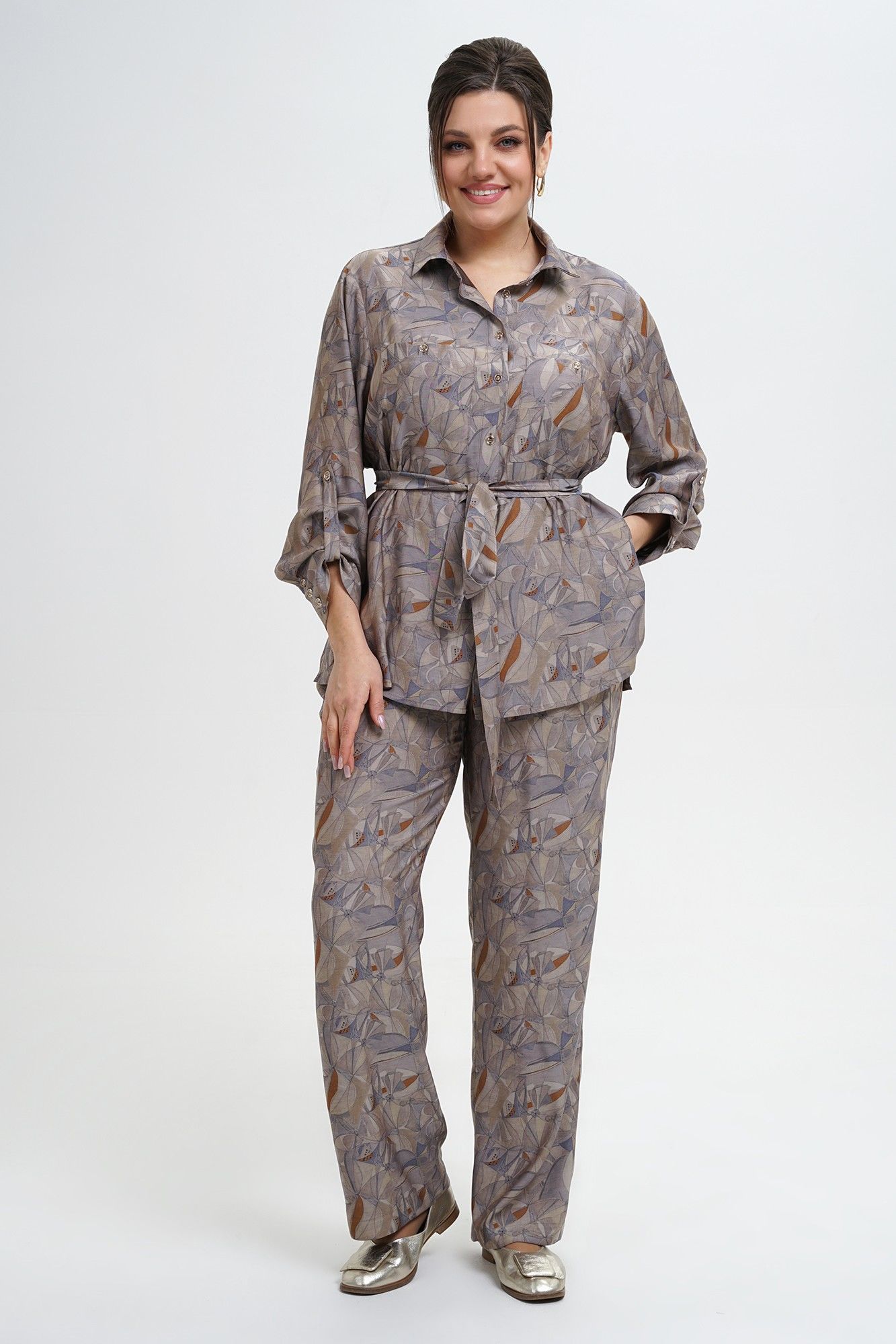 Блузка прямого, свободного силуэта, в дополнении пояс, с застёжкой на петли, пуговицы, по боковым разрезы. Перед с нагрудными выточками, накладными карманами пристёгивающиеся на петлю, пуговицу. Спинка с притачной кокеткой и мягкой встречной складкой. Рукава втачные, одношовные, длинные, понизу с разрезом, мягкой складкой и притачными манжетами на петли, пуговицы, с патой фиксируемая длину рукава на петлю, пуговицу. Воротник стояче отложной на отрезной стойке на петлю, пуговицу. Брюки прямого, свободного силуэта, с притачным поясом на резинке. Передние части с косыми боковыми карманами.