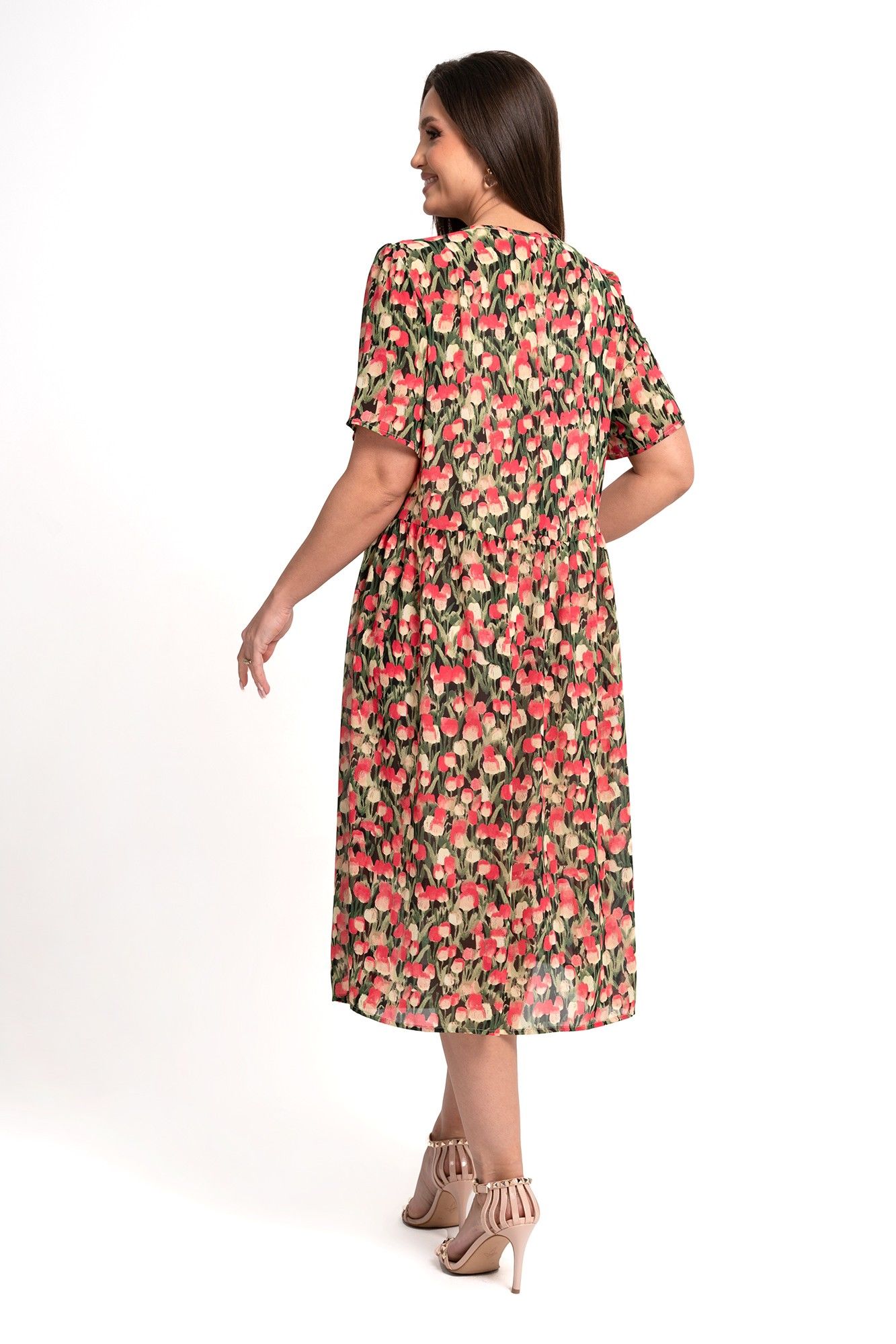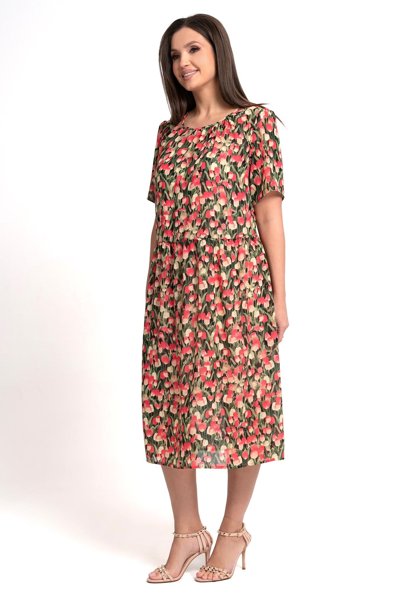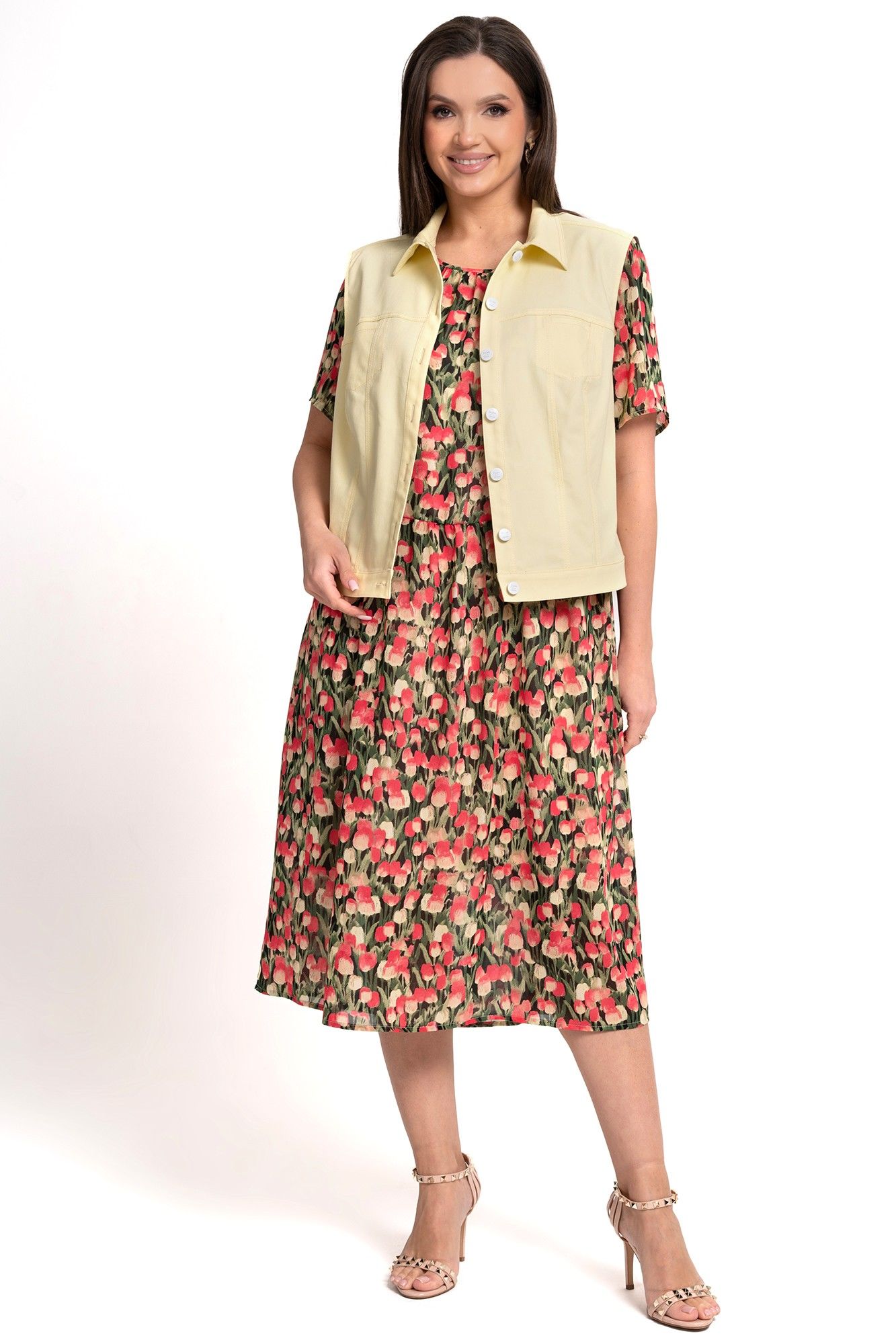 Комплект женский двух-предметный состоящий из жилета и платья. Жилет полуприлегающего силуэта, с центральной застёжкой по притачной планке на пробивные петли и пробивные пуговицы, понизу с притачным поясом. Перед вверху с притачными кокетками, рельефными швами, с нагрудными карманами по средней части в шве соединения с кокеткой. Спинка с притачной кокеткой верху и рельефными швами. Воротник отложной. Платье на подкладке, отрезное ниже линии талии, нижняя часть, собранная по шву соединения на сборку. Перед с нагрудными выточками. Спинка верхняя часть со средним швом. Рукава втачные, одношовные, короткие по окату со сборкой. Подкладка: Полуприлегающего силуэта, на узких бретелях с фиксируемой длиной. Перед с нагрудными выточками. Спинка со средним швом.