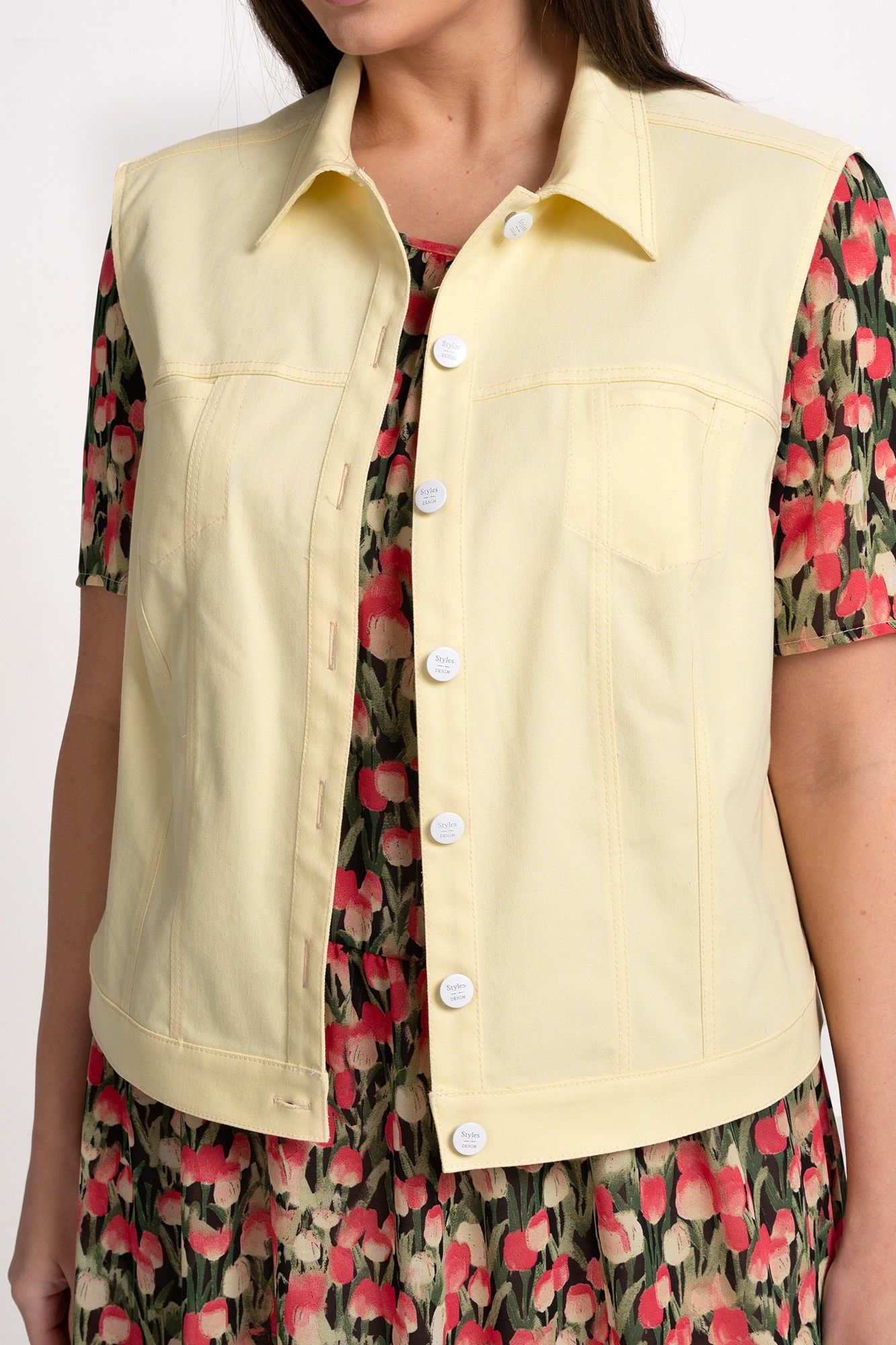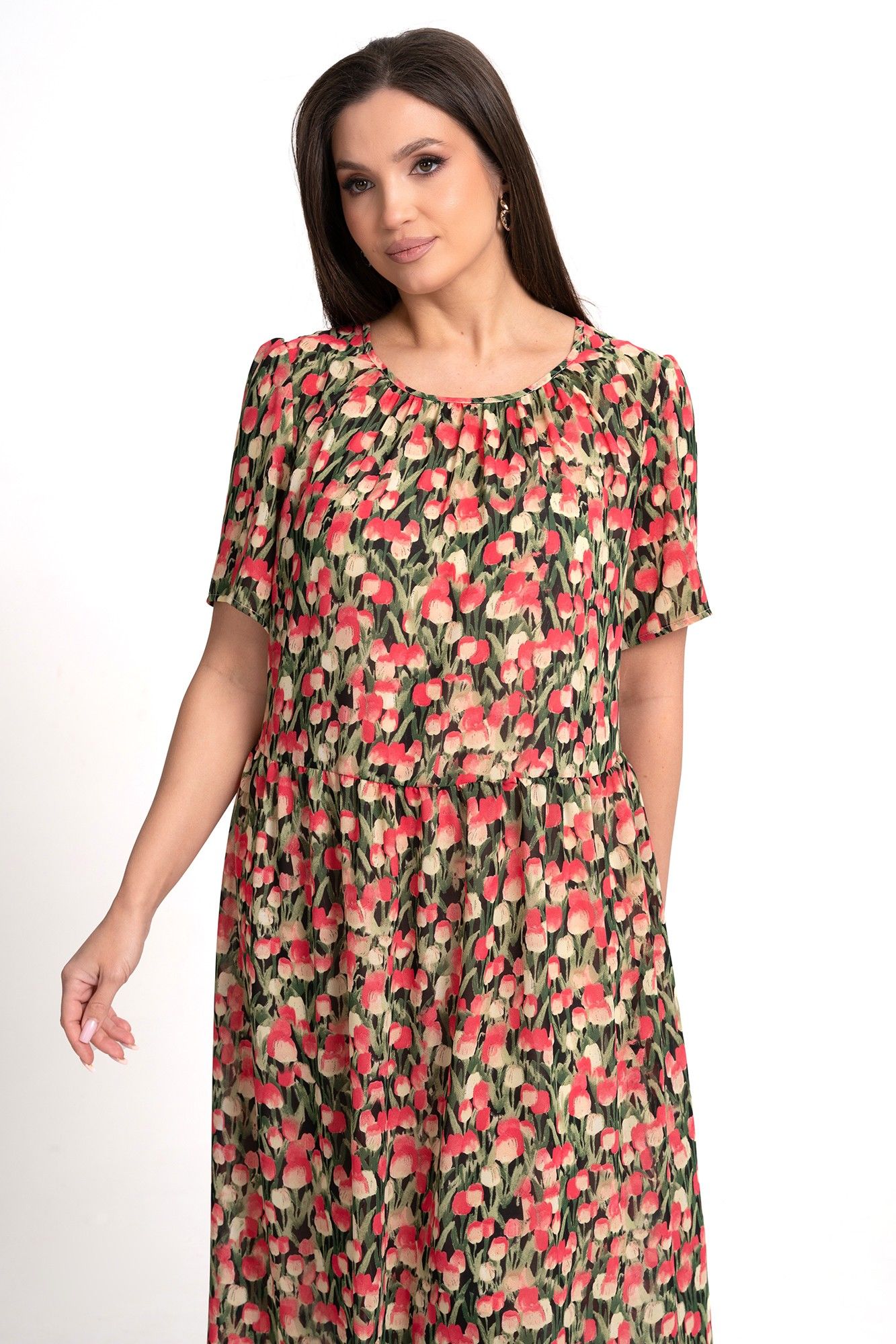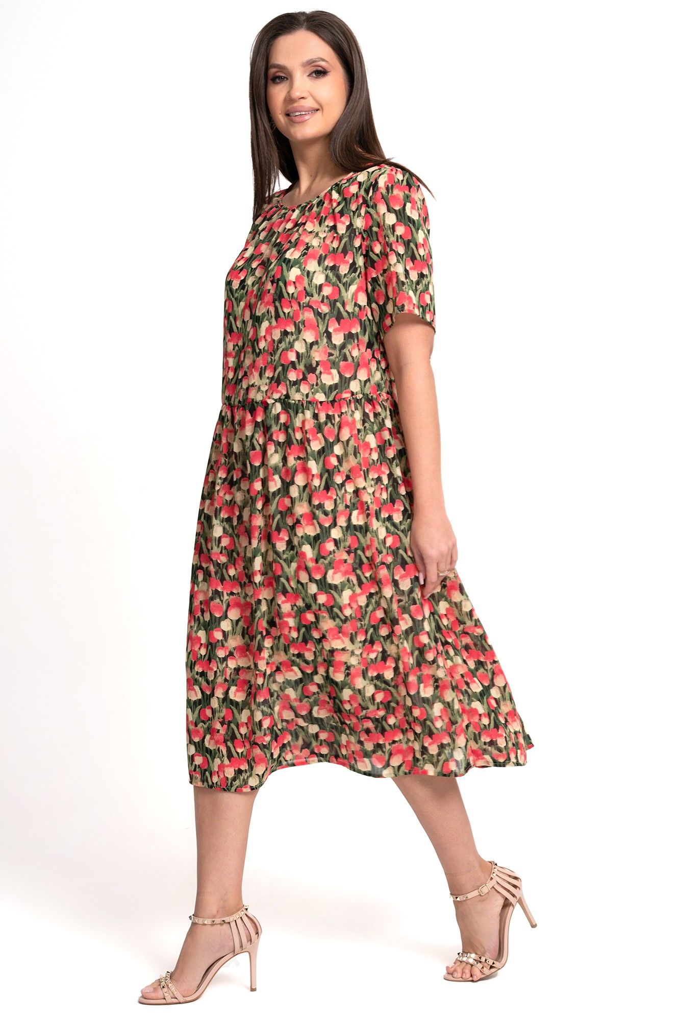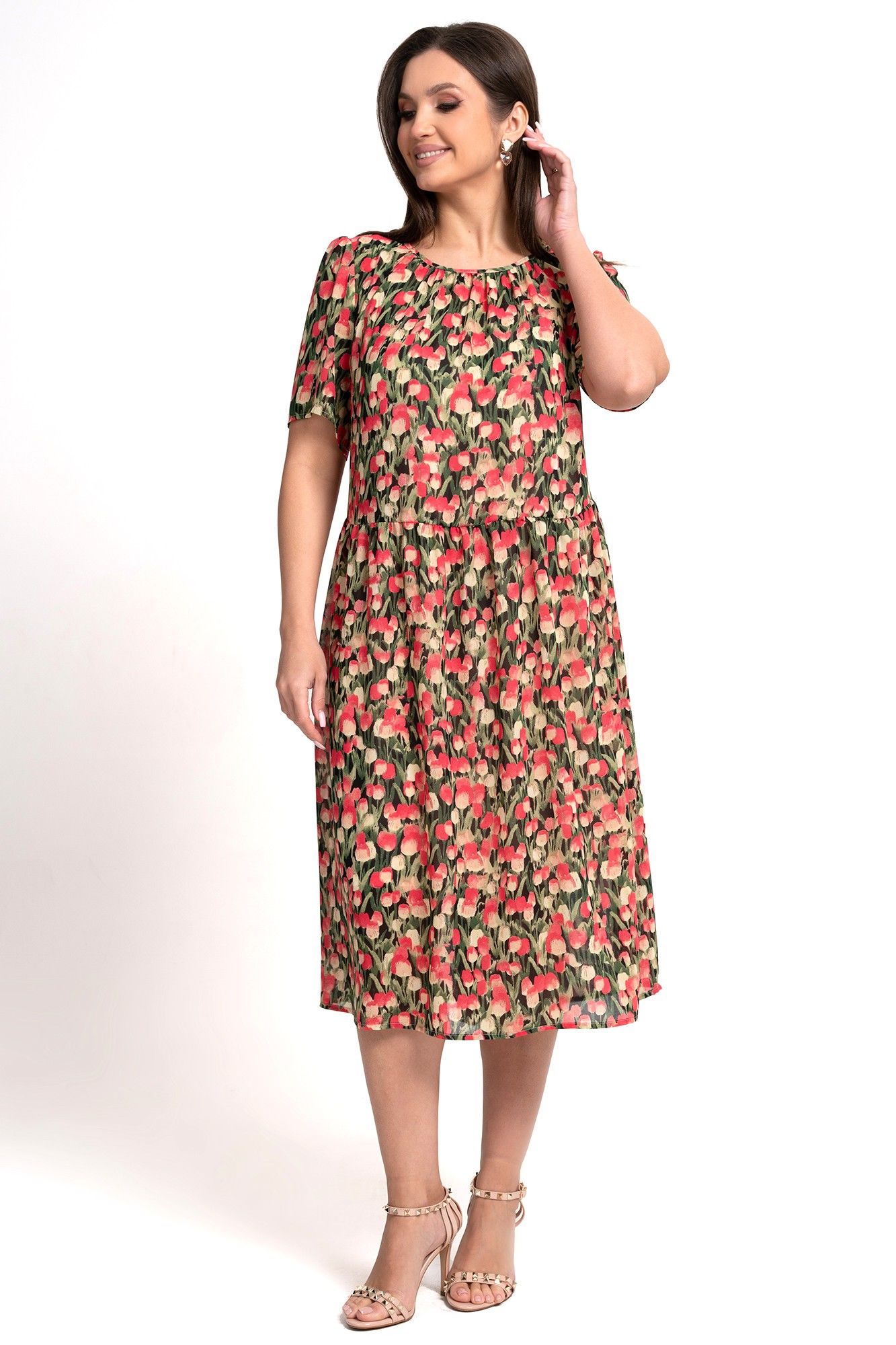 Комплект женский двух-предметный состоящий из жилета и платья. Жилет полуприлегающего силуэта, с центральной застёжкой по притачной планке на пробивные петли и пробивные пуговицы, понизу с притачным поясом. Перед вверху с притачными кокетками, рельефными швами, с нагрудными карманами по средней части в шве соединения с кокеткой. Спинка с притачной кокеткой верху и рельефными швами. Воротник отложной. Платье на подкладке, отрезное ниже линии талии, нижняя часть, собранная по шву соединения на сборку. Перед с нагрудными выточками. Спинка верхняя часть со средним швом. Рукава втачные, одношовные, короткие по окату со сборкой. Подкладка: Полуприлегающего силуэта, на узких бретелях с фиксируемой длиной. Перед с нагрудными выточками. Спинка со средним швом.