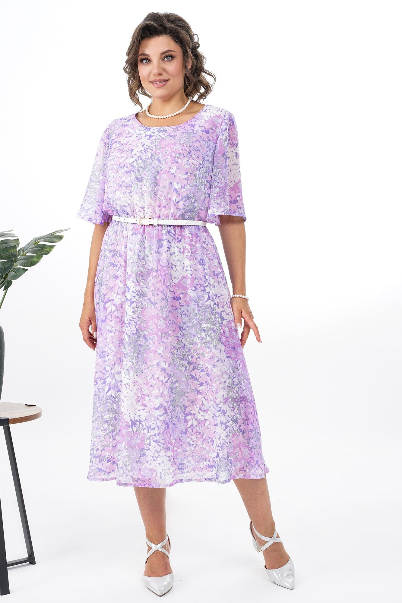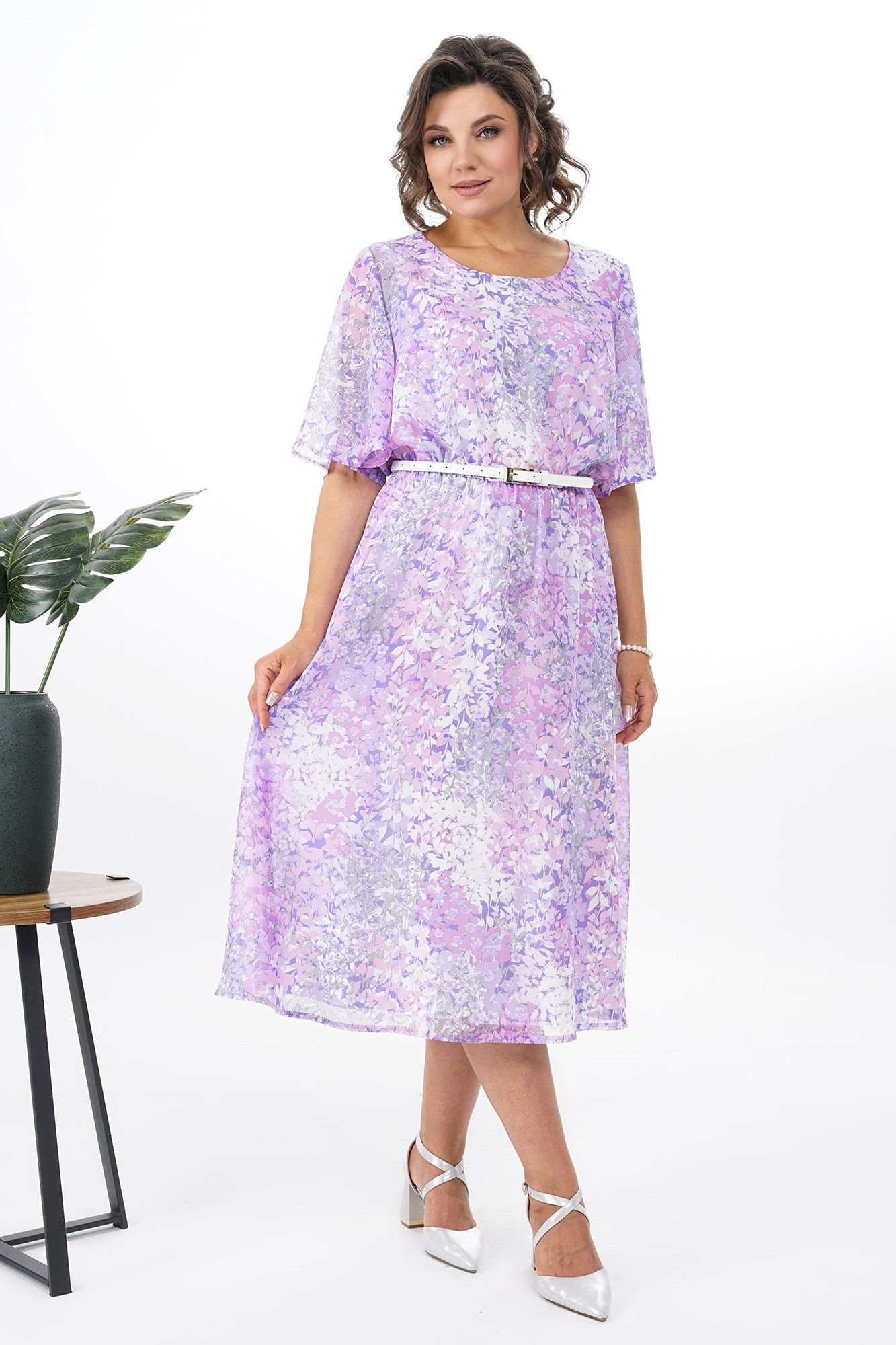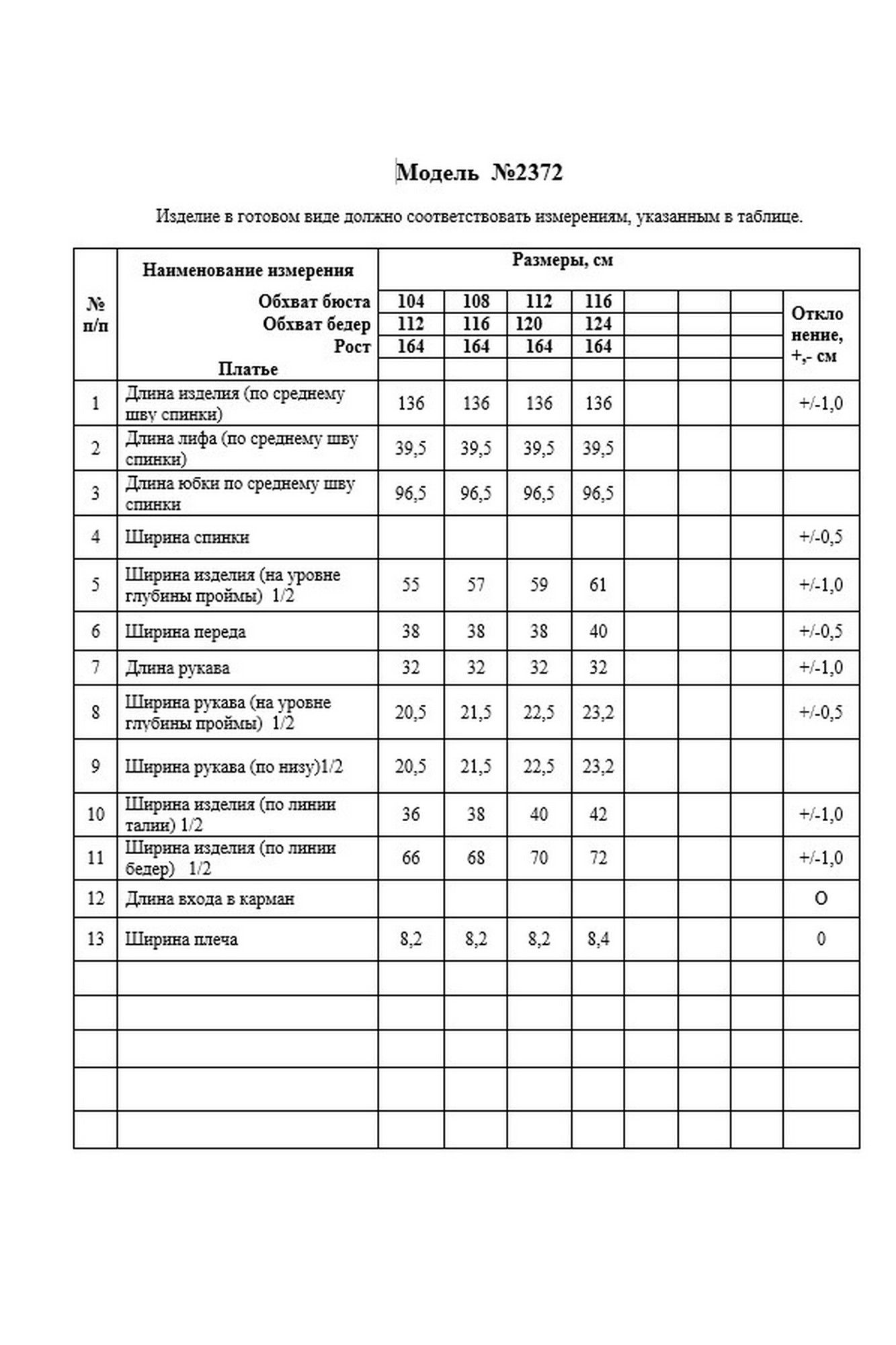 Платье на подкладке, отрезное по линии талии, степень прилегания фиксирует эластичная тесьма, с разрезом по среднему шву спинки и застёжкой на навесную петлю и пуговицу. Перед с нагрудными выточками. Спинка со средним швом. Рукава втачные, одношовные, короткие, книзу расширенные. В дополнении ремень.