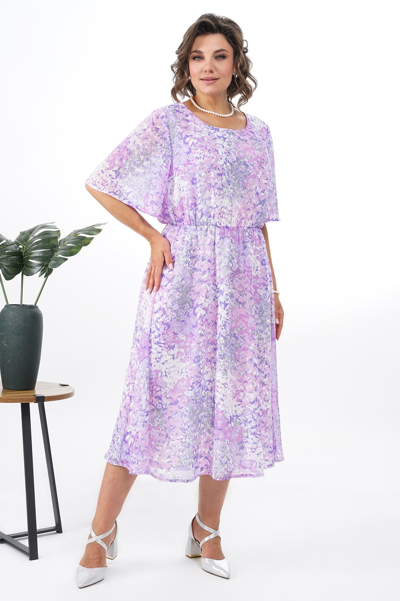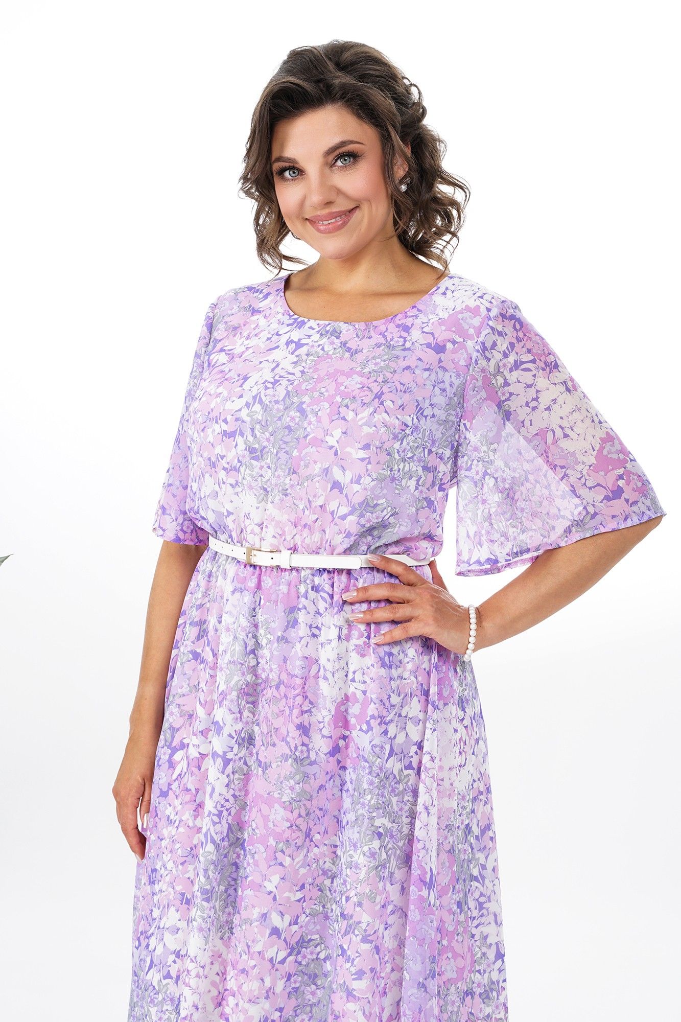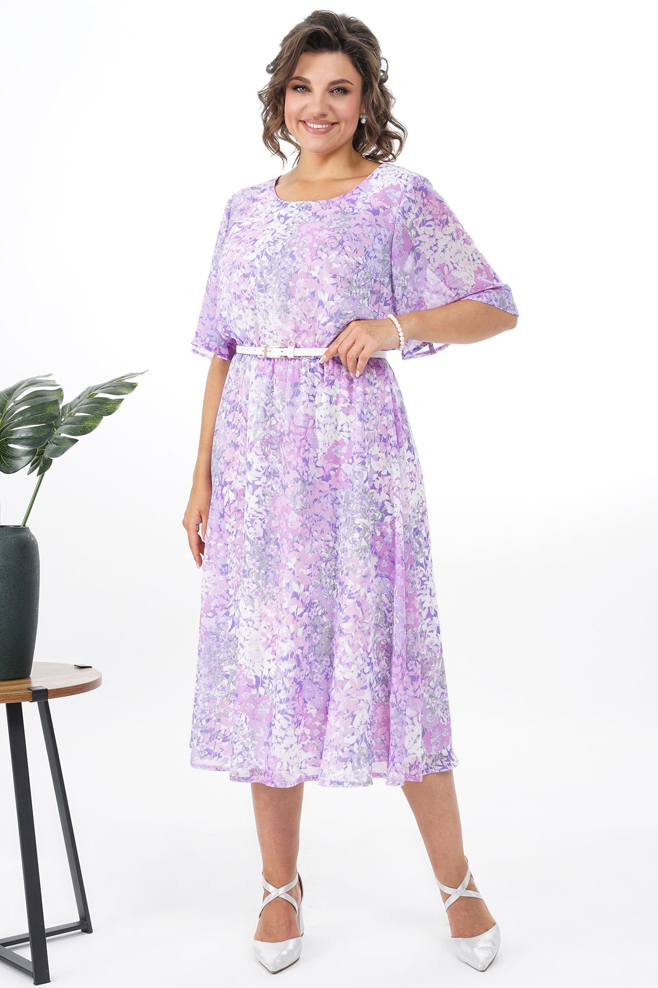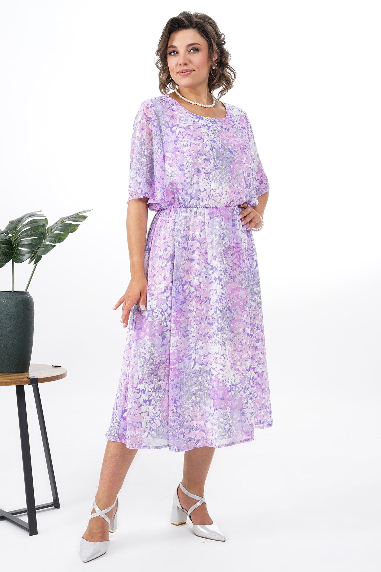 Платье на подкладке, отрезное по линии талии, степень прилегания фиксирует эластичная тесьма, с разрезом по среднему шву спинки и застёжкой на навесную петлю и пуговицу. Перед с нагрудными выточками. Спинка со средним швом. Рукава втачные, одношовные, короткие, книзу расширенные. В дополнении ремень.
