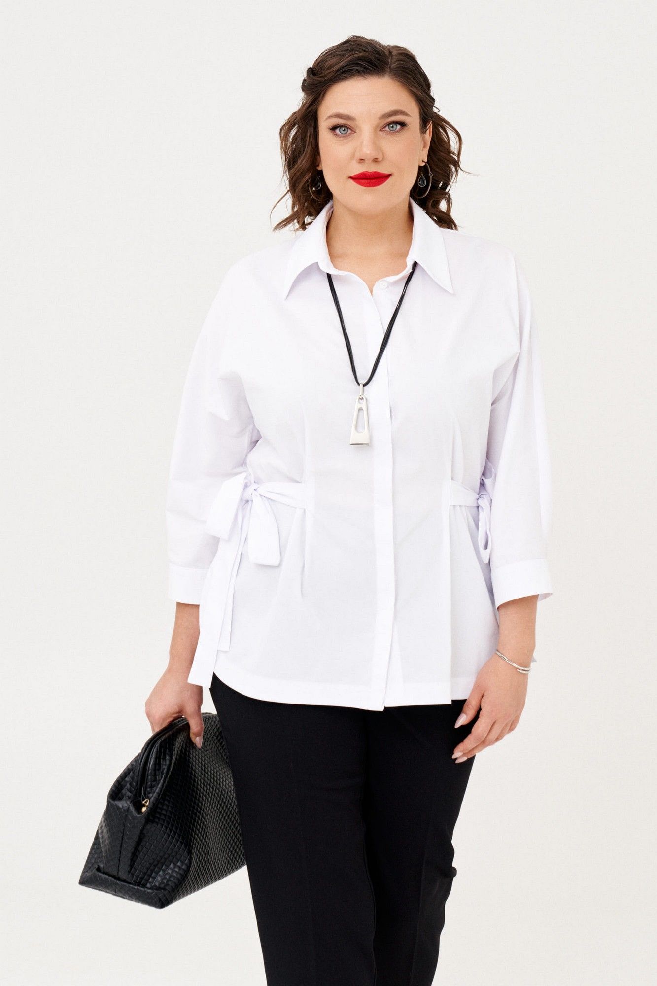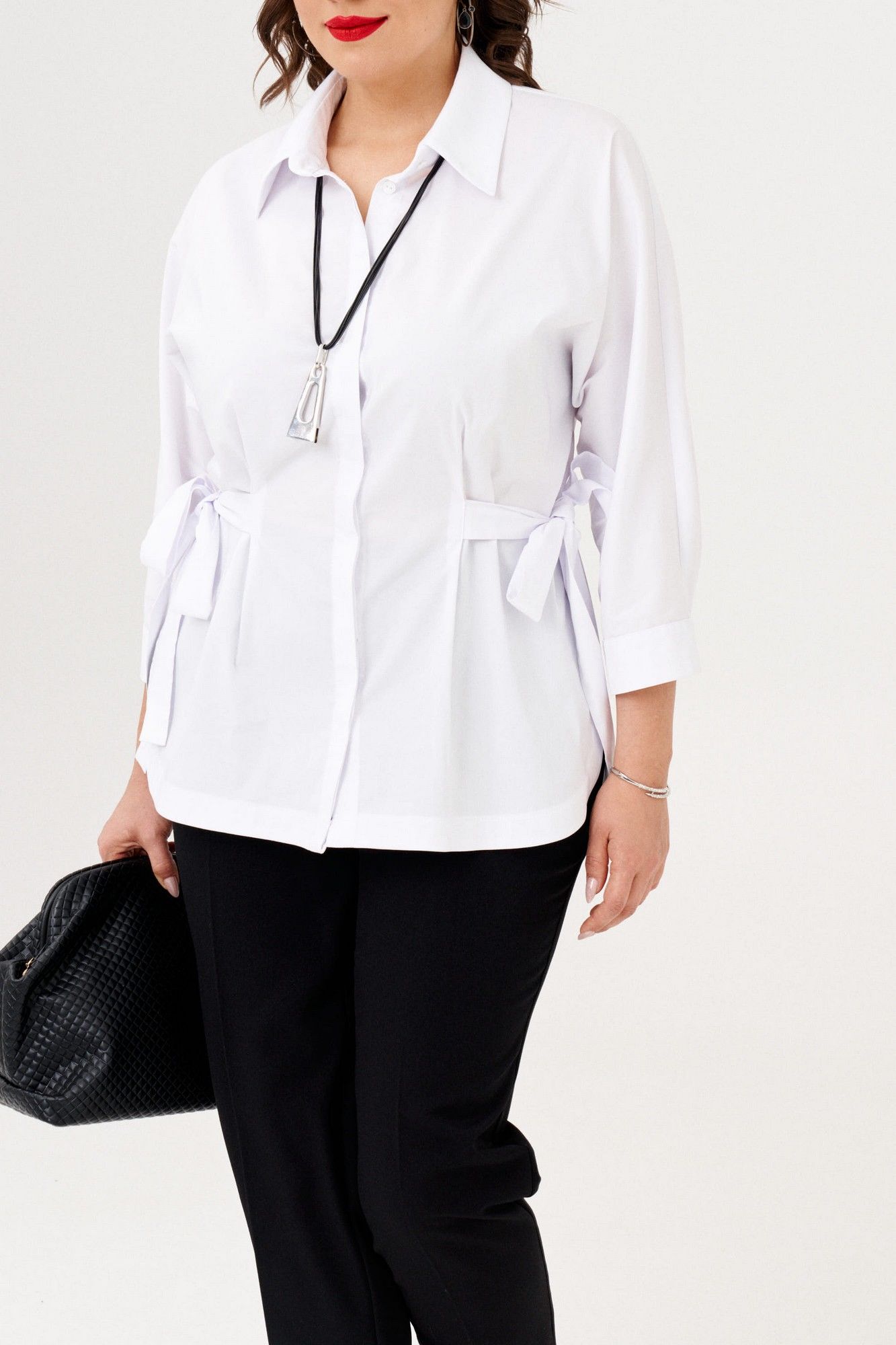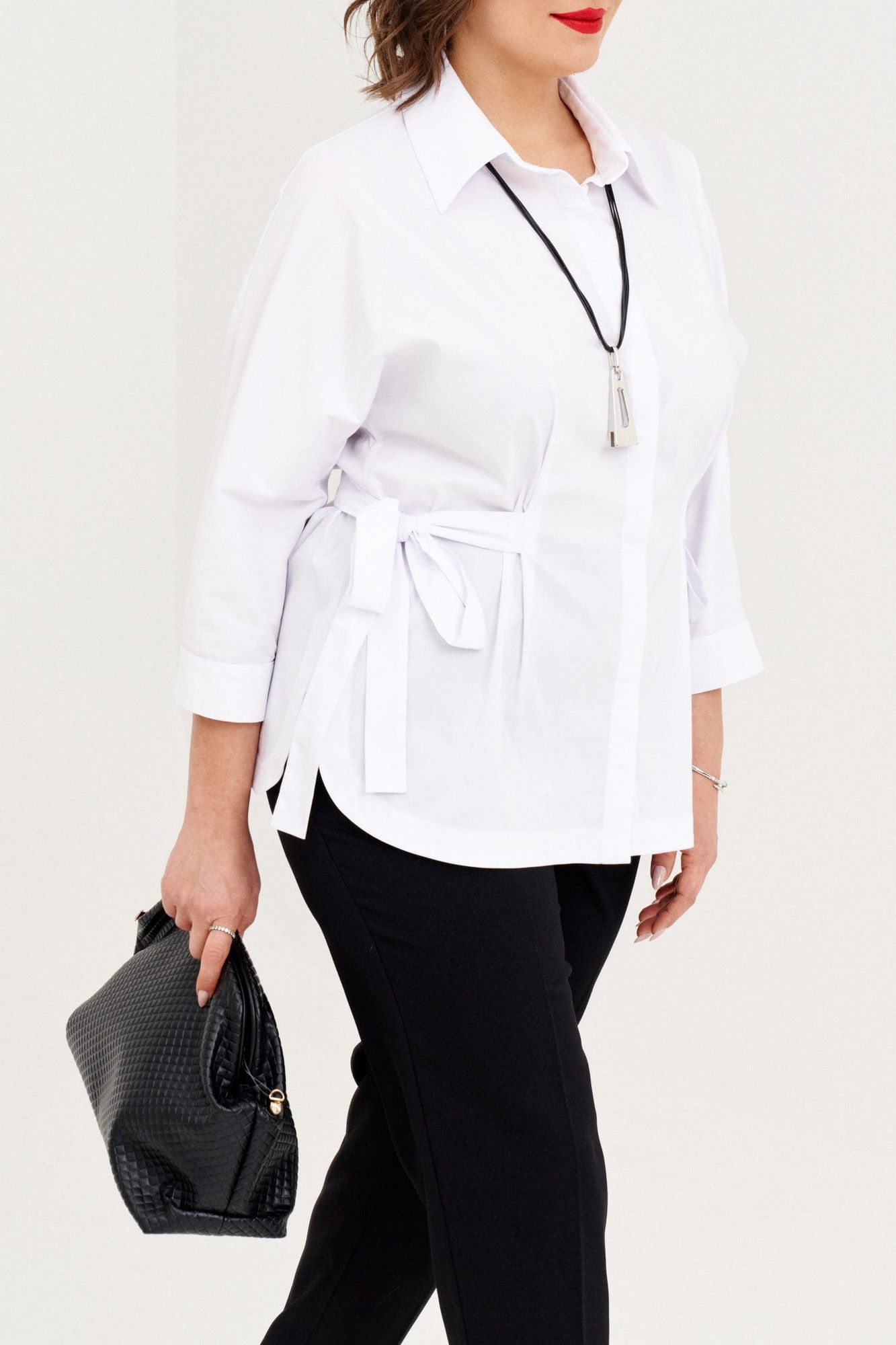 Ориганальная женская рубашка свободного покроя. Рукав цельнокройный, 3/4, заканчивается притачной манжетой на застежке.Низ фигурной формы.По переду потайная застежка на петлии пуговицы. Воротник на обрезной стойке. Линию талии можно подчеркнуть поясом. В 50 размере: ОГ 114см, ОБ 120 см, длина 69 см; в 52 размере: ОГ 118 см, ОБ 124см, длина 69см; в 54 размере: ОГ 122 см, ОБ 128см, длина 69 см.