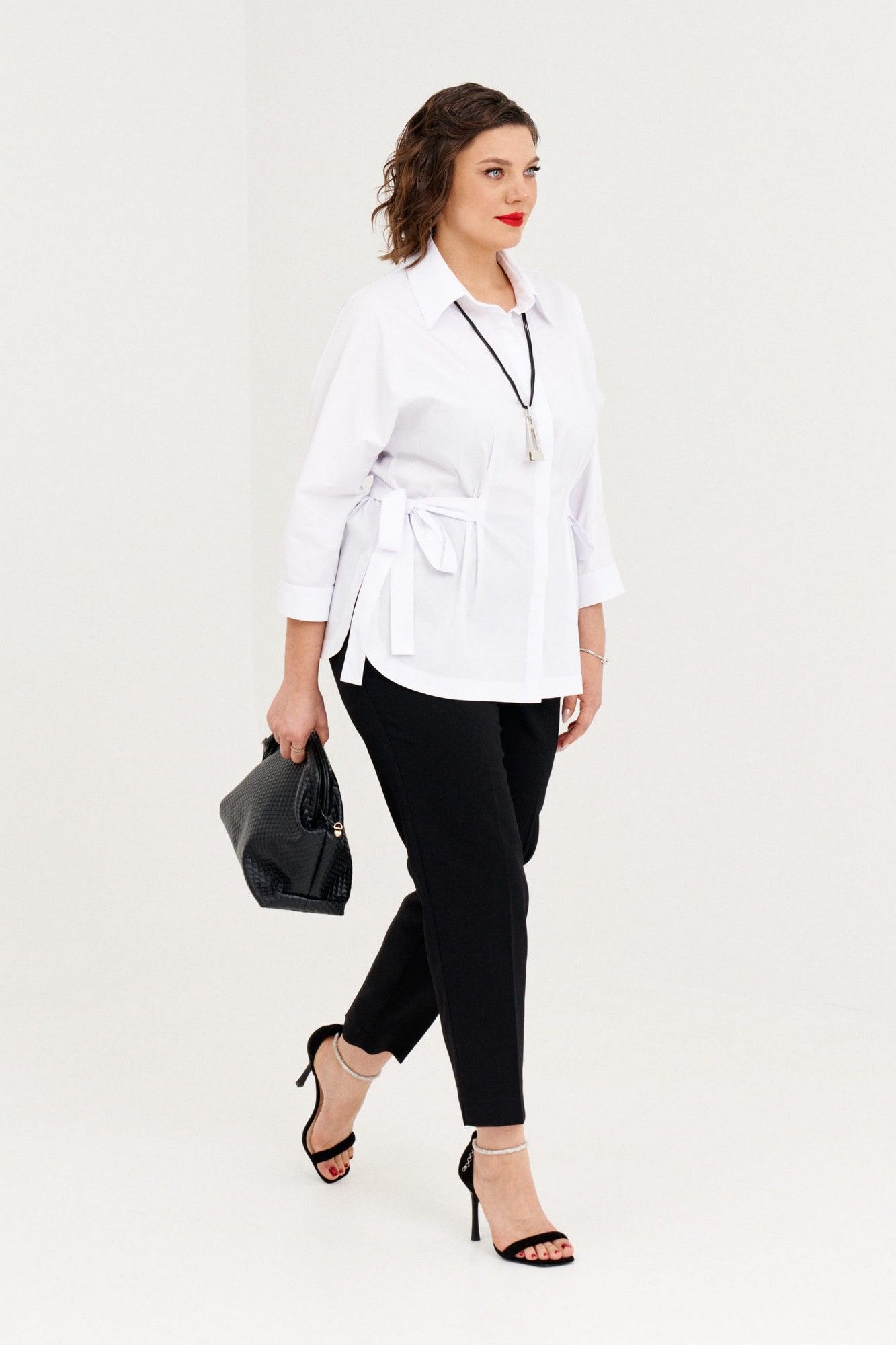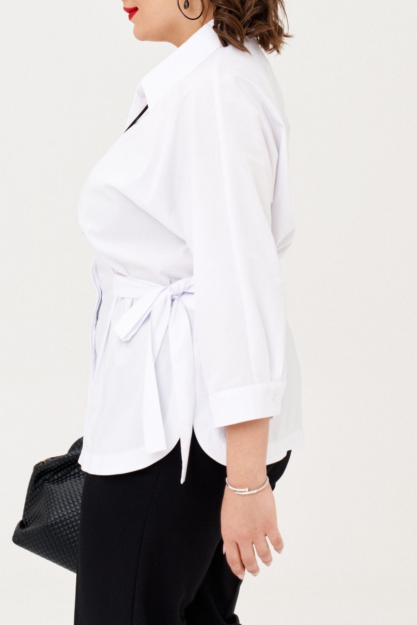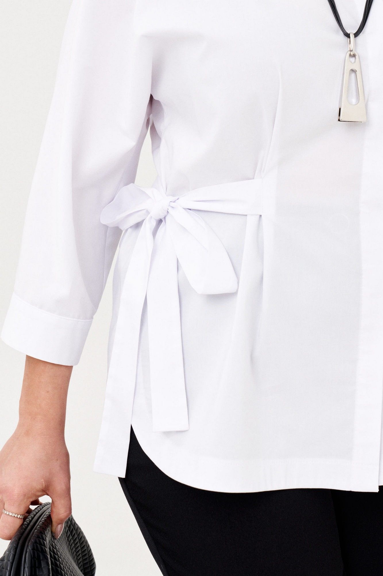 Ориганальная женская рубашка свободного покроя. Рукав цельнокройный, 3/4, заканчивается притачной манжетой на застежке.Низ фигурной формы.По переду потайная застежка на петлии пуговицы. Воротник на обрезной стойке. Линию талии можно подчеркнуть поясом. В 50 размере: ОГ 114см, ОБ 120 см, длина 69 см; в 52 размере: ОГ 118 см, ОБ 124см, длина 69см; в 54 размере: ОГ 122 см, ОБ 128см, длина 69 см.