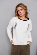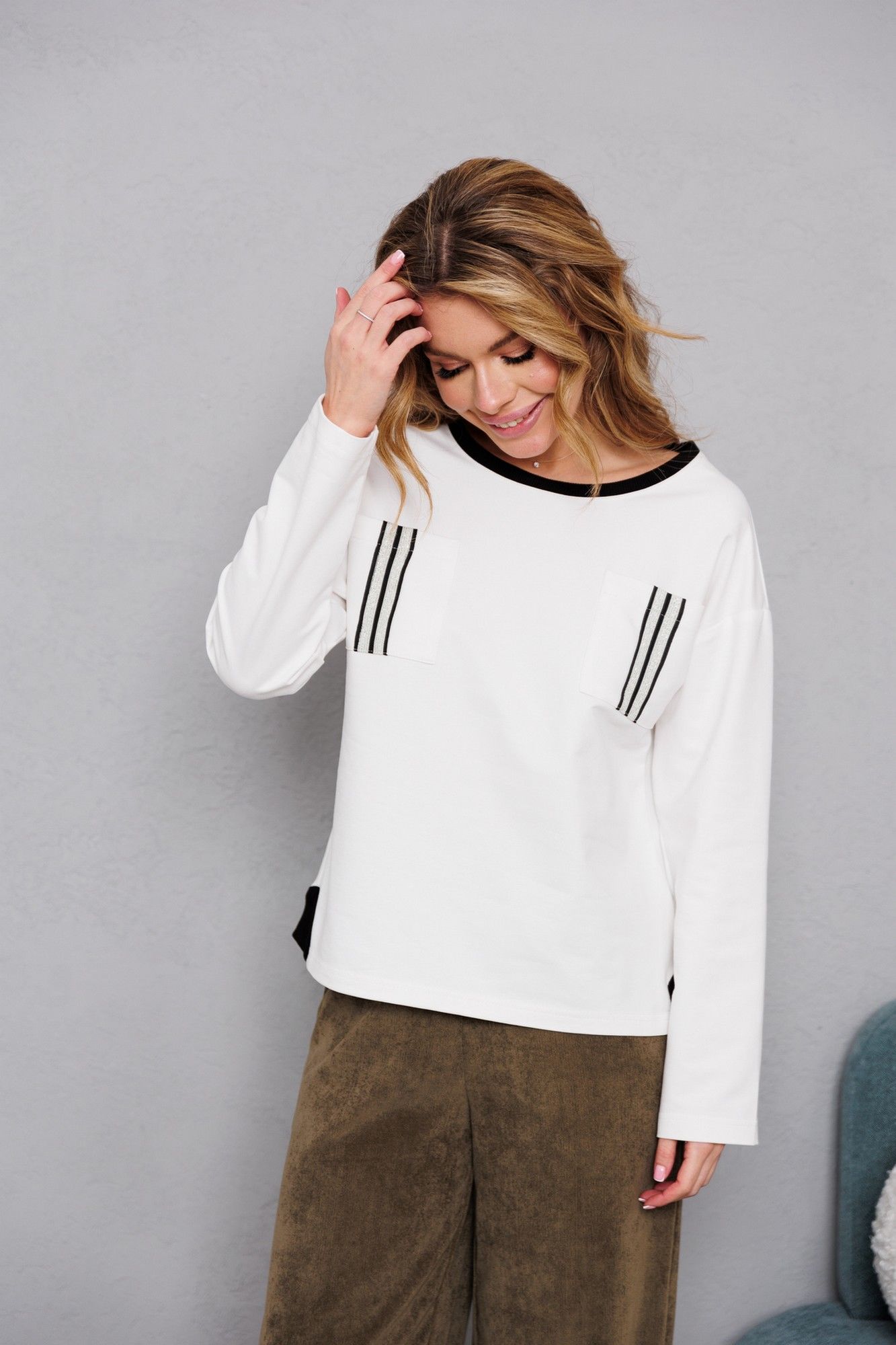 Хлопковая трикотажная блузка с отделкой контрастной тесльмой на краманах.