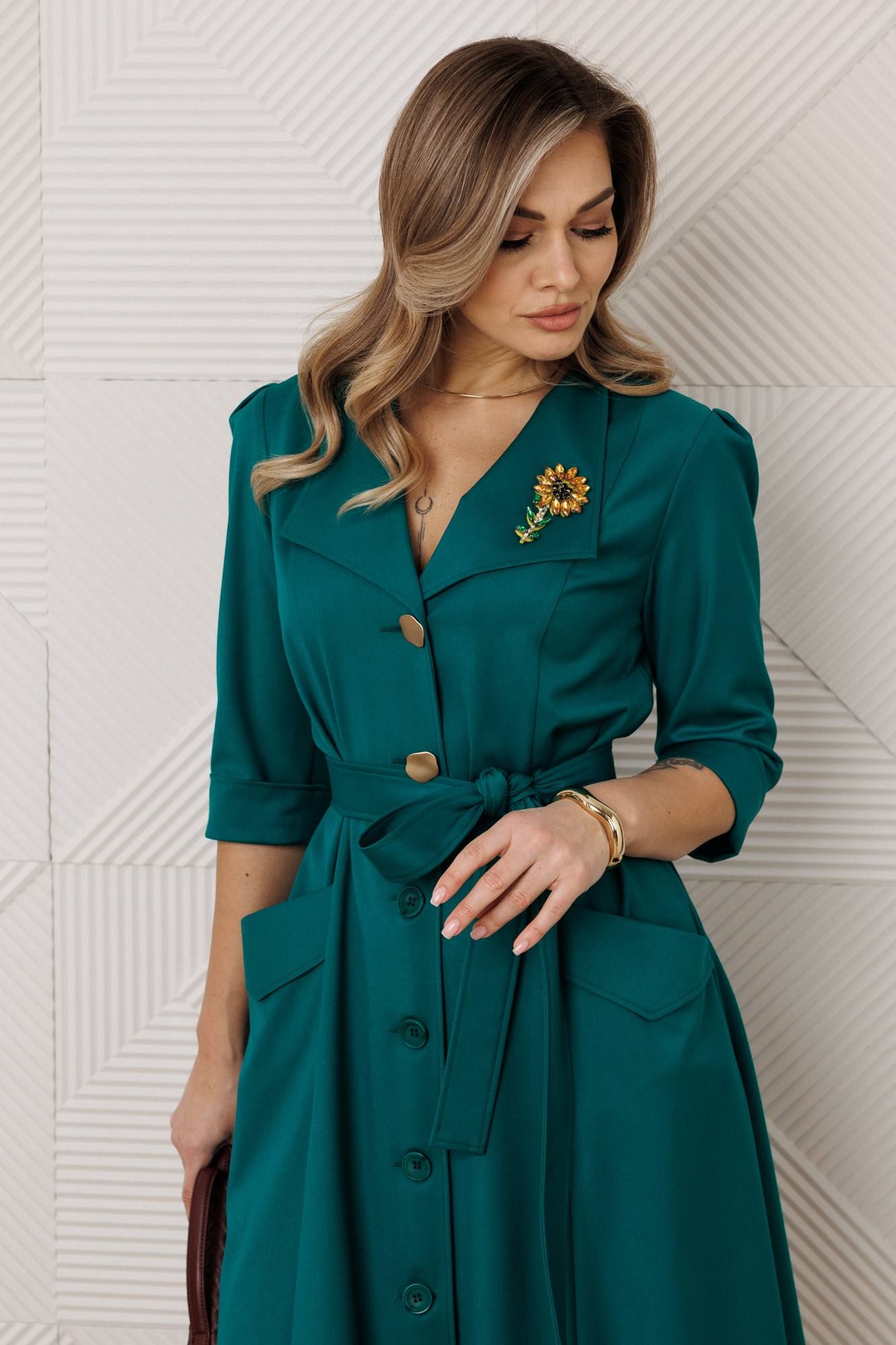 Бренд белорусской женской одежды больших размеров Anastasia представляет красивое, дизайнерское, платьев романтичном стиле для женщин плюс сайз. Платье полуприлегающего силуэта с рельефами, выходящими из плечевого шва, и переходящими в юбку-гаде. Застежка на петли и пуговицы. Воротник стояче-отложной опаш. По полочке идут карманы с клапанами. Рукав 3/4 длины с отложной манжетой и складками по плечу. В качестве декора идет разный дизайн пуговиц и пришивная брошь. Подчеркнуть талию можно с помощью пояса, который идет в комплекте. В этом платье вы будете центром внимания в любой компании. Благодаря женственному силуэту вы будете всегда ощущать себя красивой и модной. .Все модели от Anastasia – это уникальные изделия, которые выполняются исключительно малыми партиями. Добавьте красоты и изящества в свой гардероб с нашей новой коллекцией! ВНИМАНИЕ: брошь может отличаться от фото. Длина платья: (48-52)- 115 см, (54-56)-116см, (58-62)-118см. Длина рукава: (48-52)-42 см, (54-56)-43см, (58-62)-45см