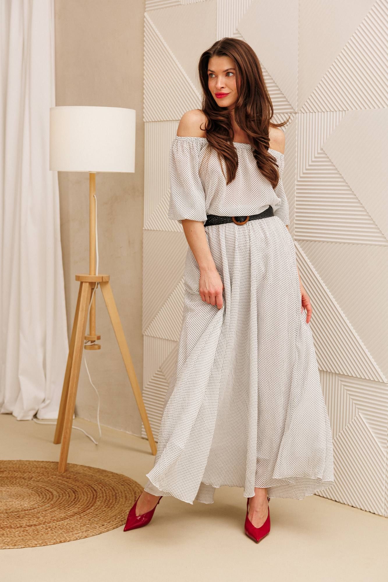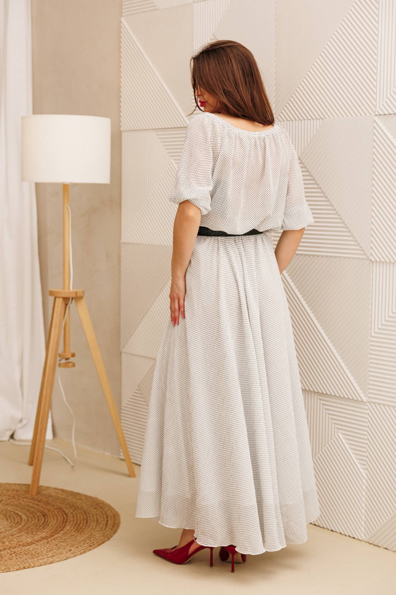 Платье макси из жатого шифона в горошек свободного силуэта - лучший выбор на лето. Рукав реглан 3/4 длины, низ на резинке. Горловина собрана на резинку. Платье отрезное по линии талии, на резинке. Юбка полусолнце на хлопковой подкладке. В комплект входит съемный пояс. ВНИМАНИЕ! Пояс может отличаться от фото. Длина юбки: 93см . Длина рукава: 43см. Длина спинки: 42см.