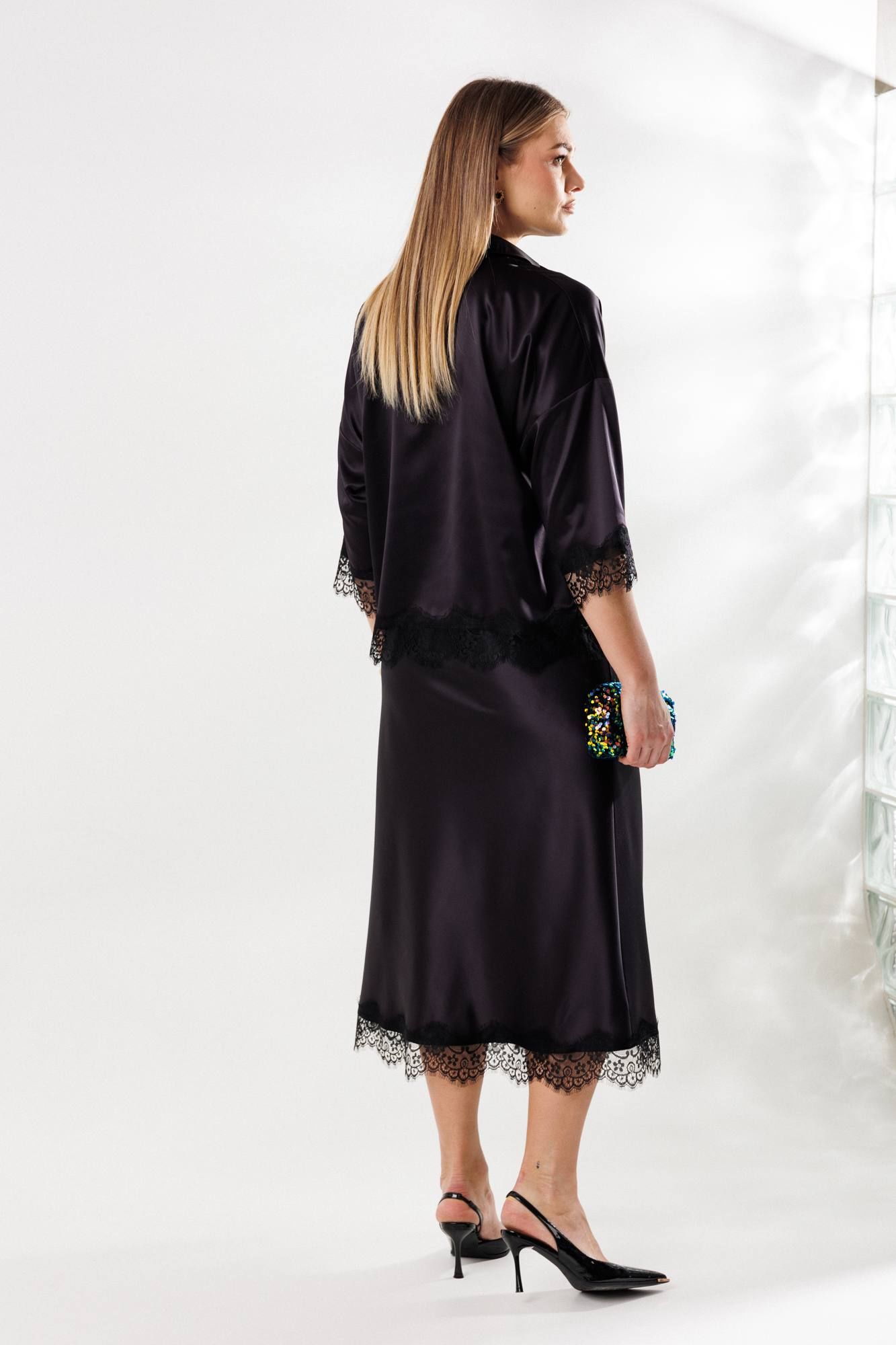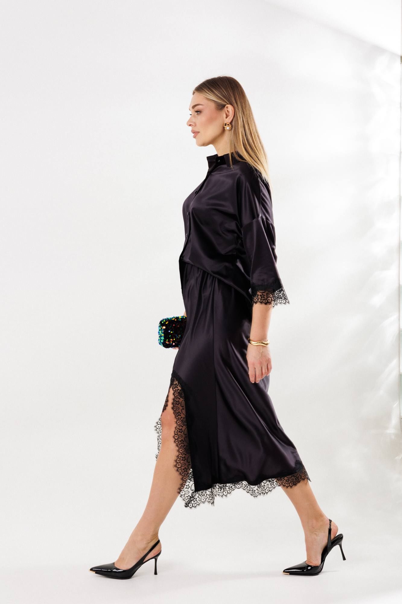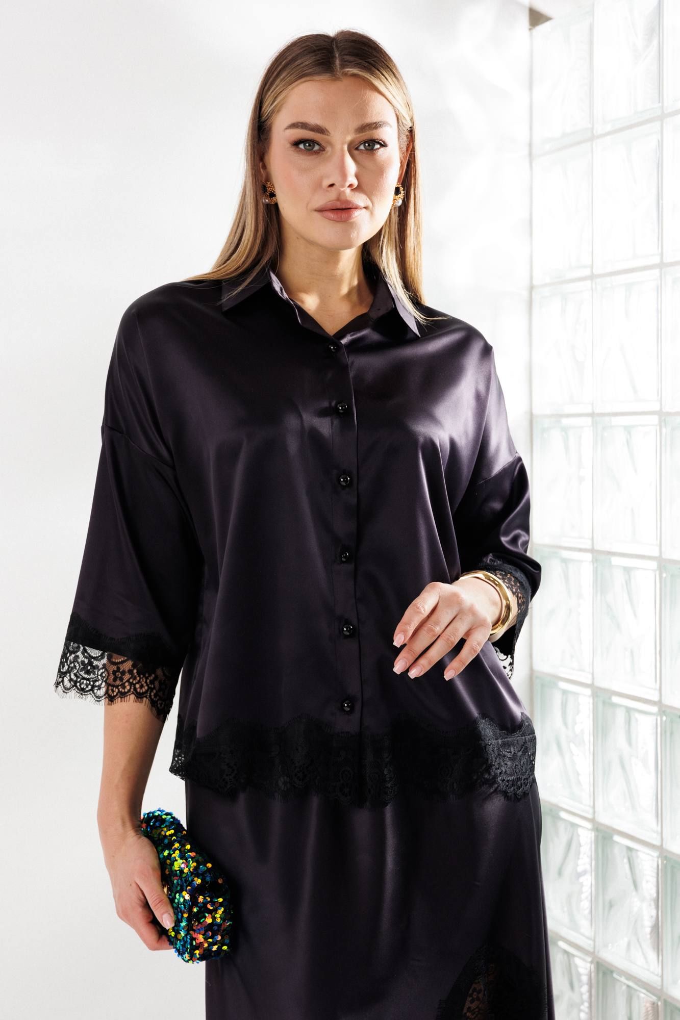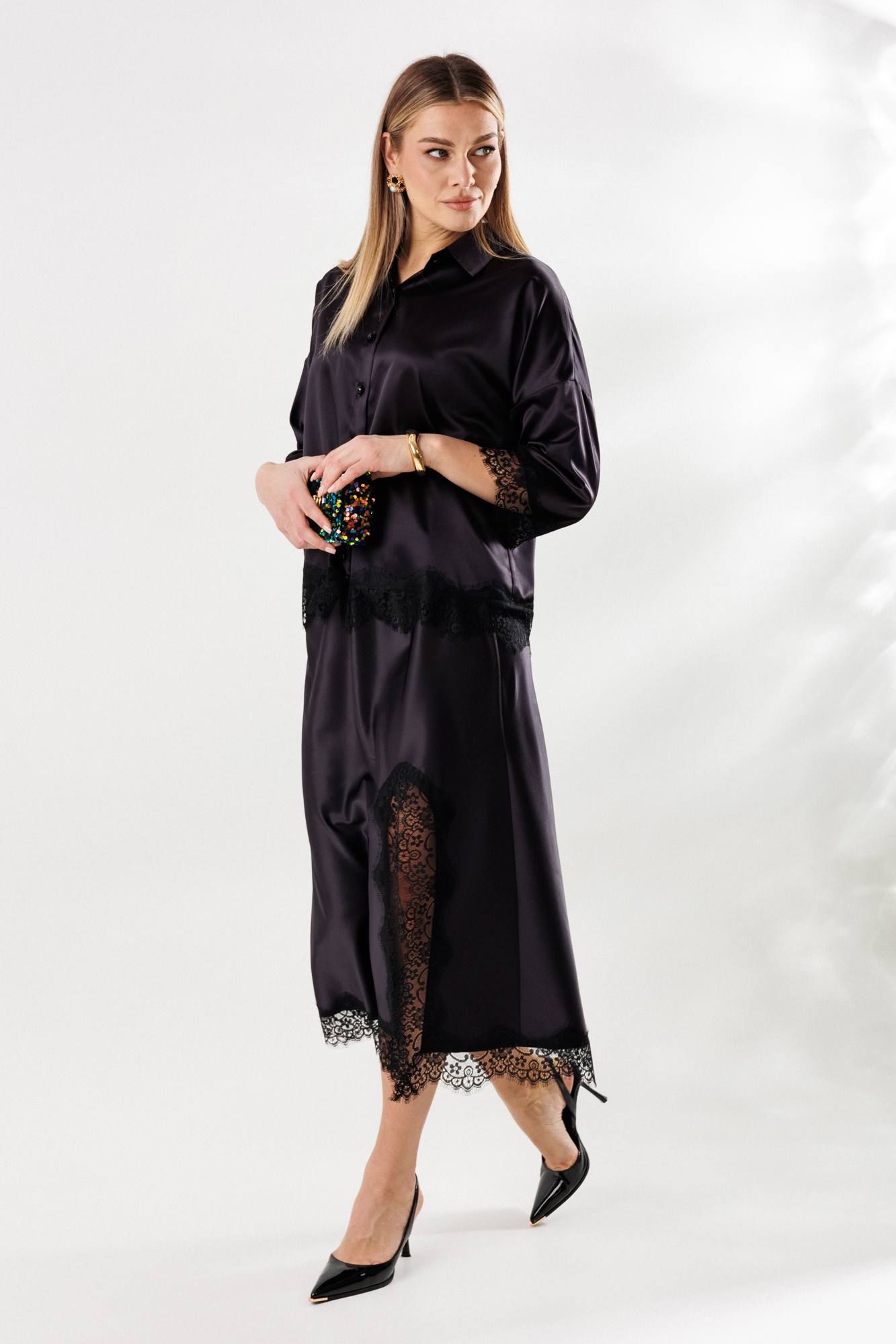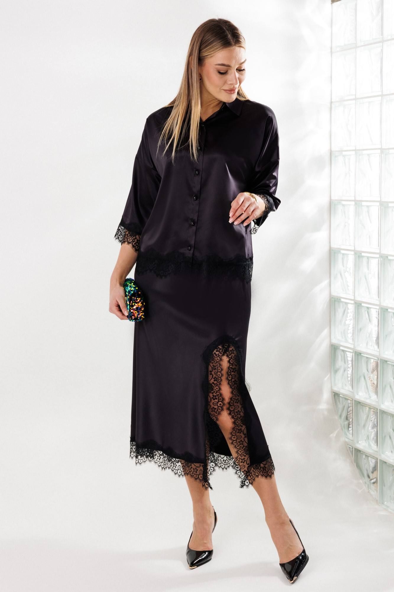 Женский элегантный костюм от Anastasia, подходящий для нарядной и повседневной носки. Костюм женский 2-х предметный из атласной ткани с отделкой из деликатного кружева (блузка, юбка). Ажурное кружево, деликатно украшающее низ костюма, добавляет образу романтичности и утонченности. Отлично подойдет на любой тип фигуры, подчеркнет вашу женственность. Блузка прямого силуэта со спущенным плечом. Застежка- планка на петли и пуговицы. Воротник на отрезной стойке. Рукав одношовный, втачной, 3/4 длины. Юбка косая с разрезом по колену длины миди выполнена из мягкого атласа, который приятно струится по фигуре, создавая женственный и изысканный силуэт. Пояс на резинке. Юбка с кружевом внизу станет идеальным выбором для создания как повседневных, так и праздничных образов. Длина блузки с крудевом (50-54)- 59см, (56-60)- 62см . Длина рукава с кружевом (50-60)- 29см. Длина юбки с кружевом (50-60)- 90 см.