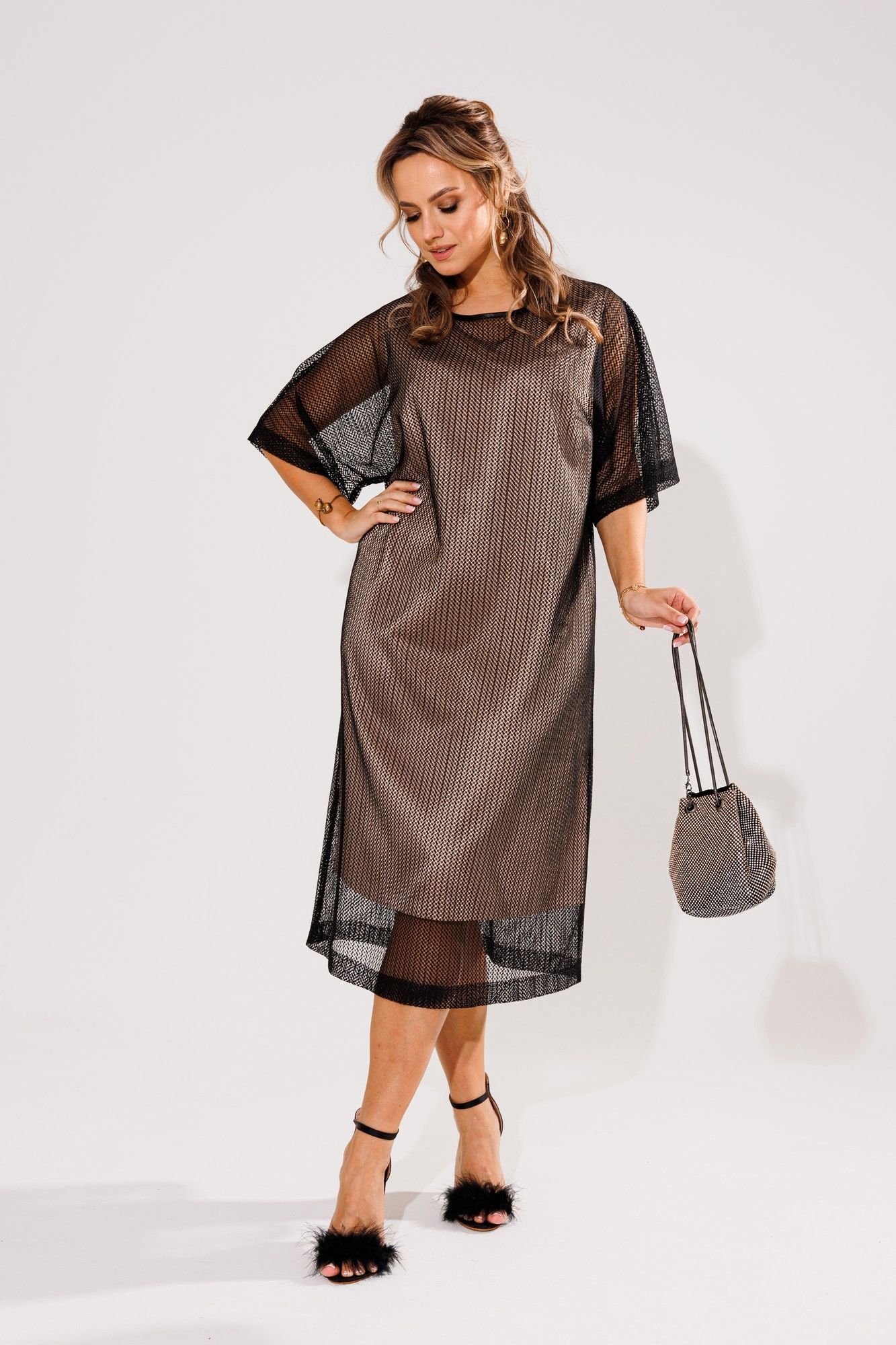Изысканное и роскошное платье, состоящее из атласного основного платья, дополненного эффектной сеткой. Сочетание золота и черного создает великолепный контраст, придавая образу невероятную изысканность. Это не просто платье – это инвестиция в ваш элегантный стиль. Подчеркните свою утонченность, дополнив лук великолепным поясом с перьями 1194 от Анелли. Будьте готовы к бескрайним комплиментам на любом мероприятии, ведь вы будете блистать и сиять. Замеры: Размер 54: Платье: ОГ-116; ОТ-116; ОБ-124; ДИ-98; Накидка: ОГ-120; ОТ-120; ОБ-126; ДИ-112; ДР-40; ОП-50; Размер 56: Платье: ОГ-118; ОТ-118; ОБ-126; ДИ-99; Накидка: ОГ-124; ОТ-124; ОБ-130; ДИ-112; ДР-41; ОП-52; Размер 58: Платье: ОГ-122; ОТ-122; ОБ-132; ДИ-100; Накидка: ОГ-130; ОТ-130; ОБ-136; ДИ-113; ДР-41; ОП-54; Размер 60: Платье: ОГ-128; ОТ-128; ОБ-138; ДИ-100; Накидка: ОГ-134; ОТ-134; ОБ-140; ДИ-114; ДР-41; ОП-56; Размер 62: Платье: ОГ-132; ОТ-132; ОБ-142; ДИ-101; Накидка: ОГ-138; ОТ-138; ОБ-144; ДИ-115; ДР-41; ОП-56; Размер 64: Платье: ОГ-136; ОТ-136; ОБ-146; ДИ-102; Накидка: ОГ-142; ОТ-142; ОБ-148; ДИ-116; ДР-41; ОП-56;