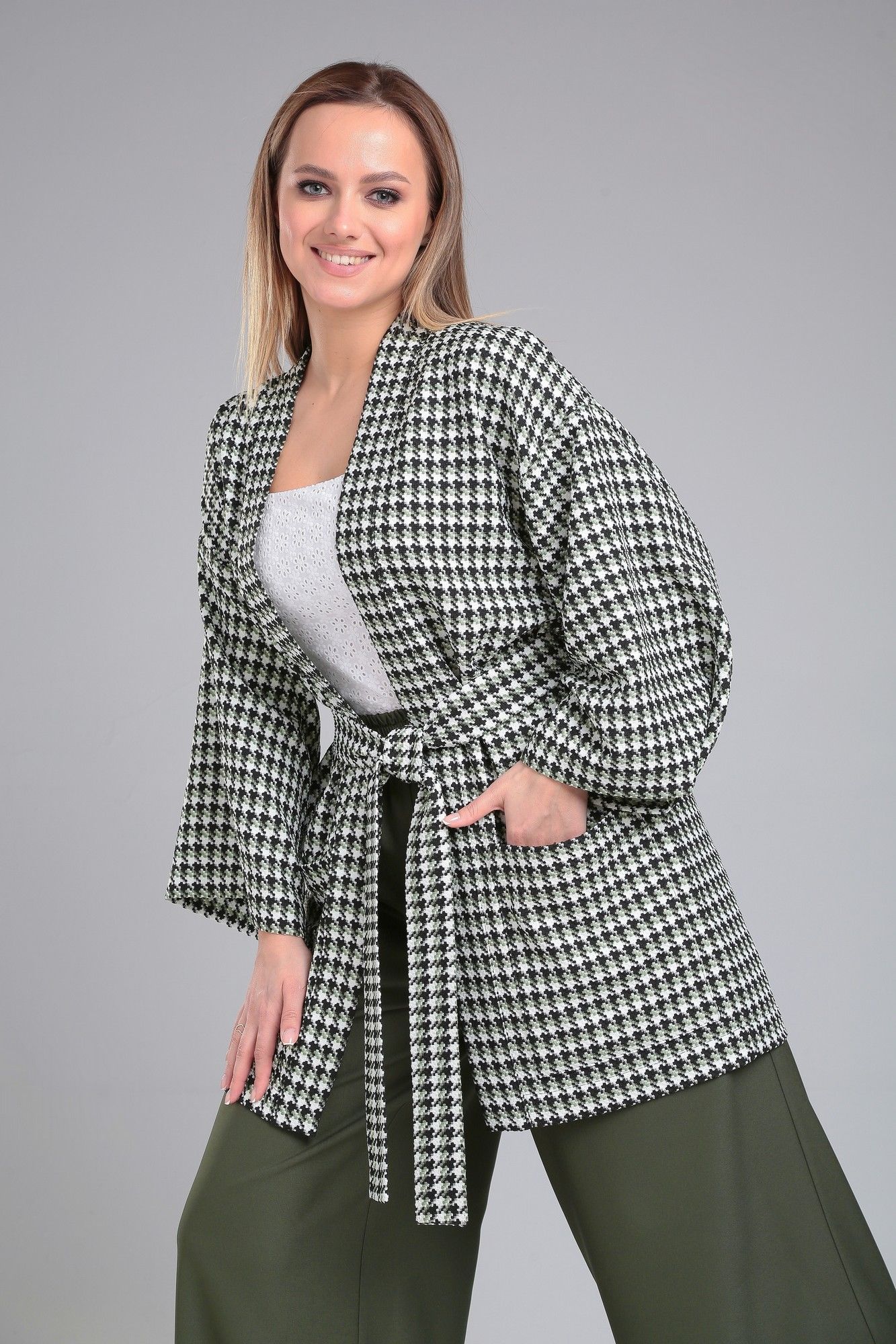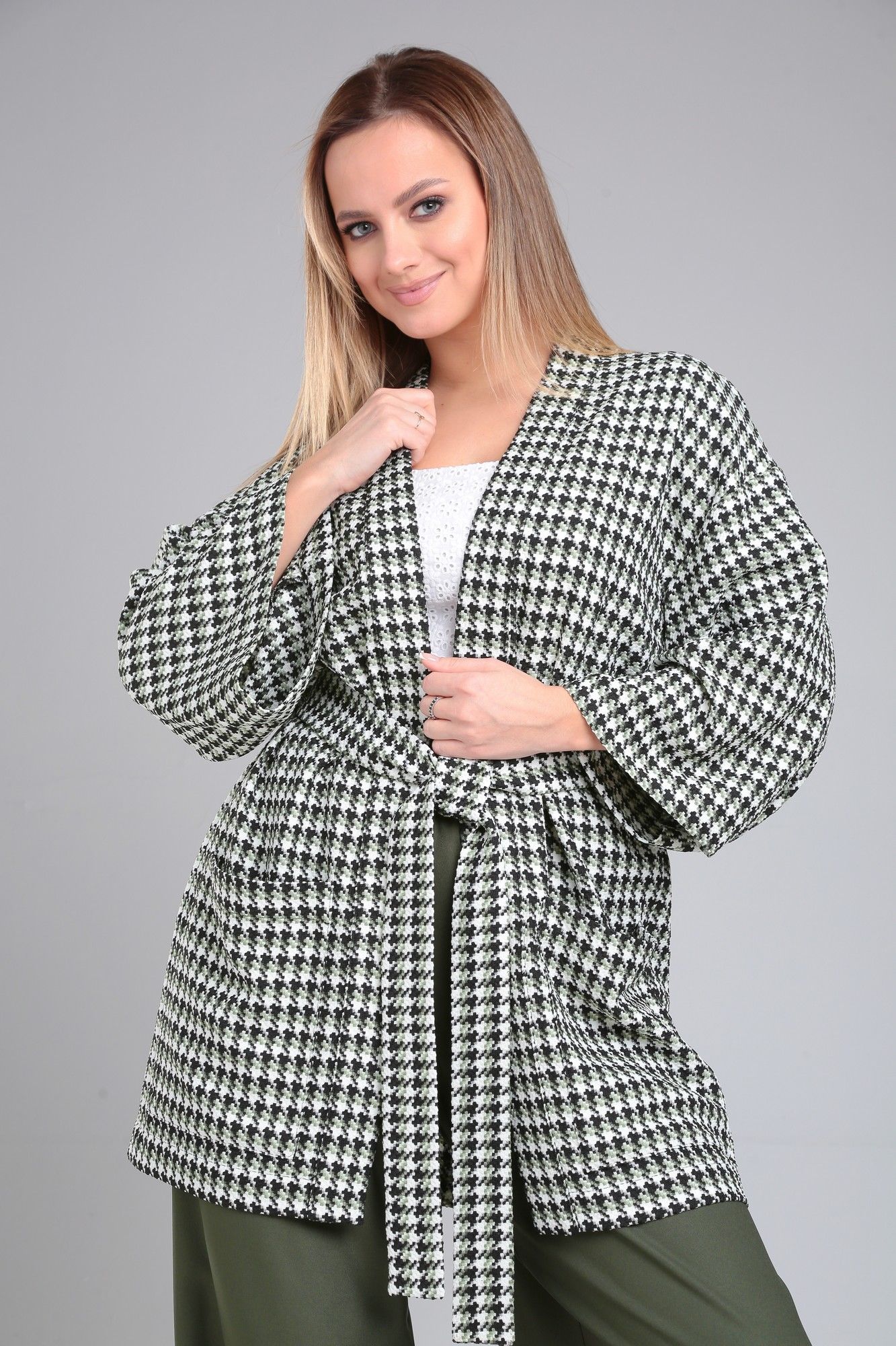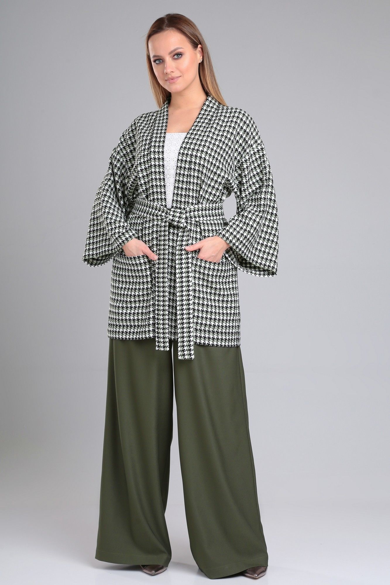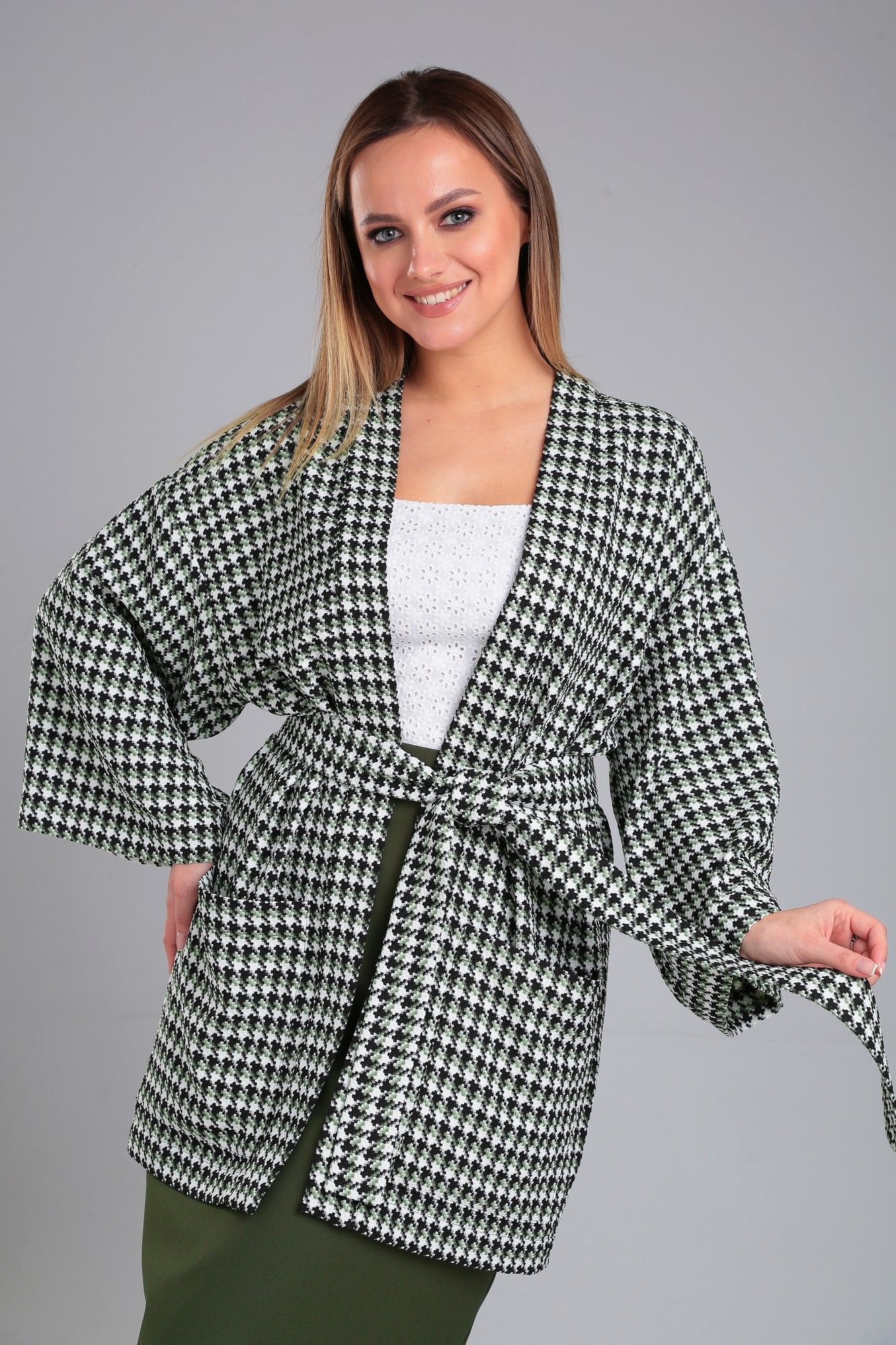 Свободный мягкий жакет-кимоно без подкладки с принтом отлично впишется в ваш деловой и повседневный гардероб. Лёгкий и удобный жакет не будет сковывать движения и придётся вам по вкусу. Идеально подойдет к любым брюкам, юбкам и джинсам. Комфортный жакет прямого силуэта, без застежки. Вырез горловины V-образной формы. Край борта полочки обработан притачной планкой. По переду большие накладные карманы. Рукав широкий, длиной ¾, со спущенным плечевым швом. В комплекте завязывающийся пояс из основной ткани. Длина жакета: 75 см Длина рукава от горловины: 61 см