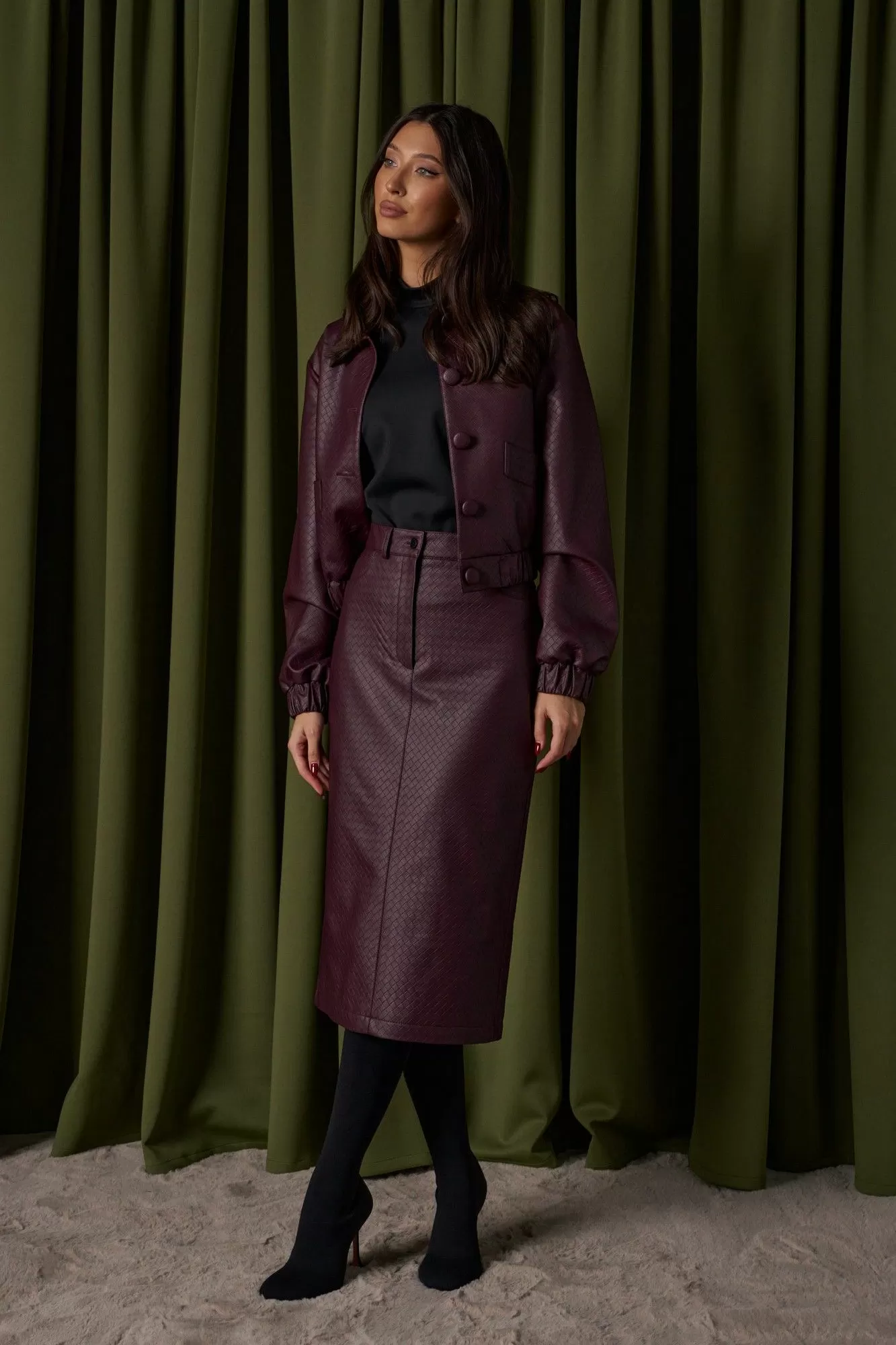 Юбка прямого кроя выполнена из фактурной эко-кожи бордового цвета. Характеристики: прямой крой, пояс стабильный со шлевками, на брендированной подкладке, застёжка центральная пуговица, молния, по передней части изделия прорезные карманы, по заднему полотну накладные карманы. Длина 75 см. В среднем шве разрез 32 см.