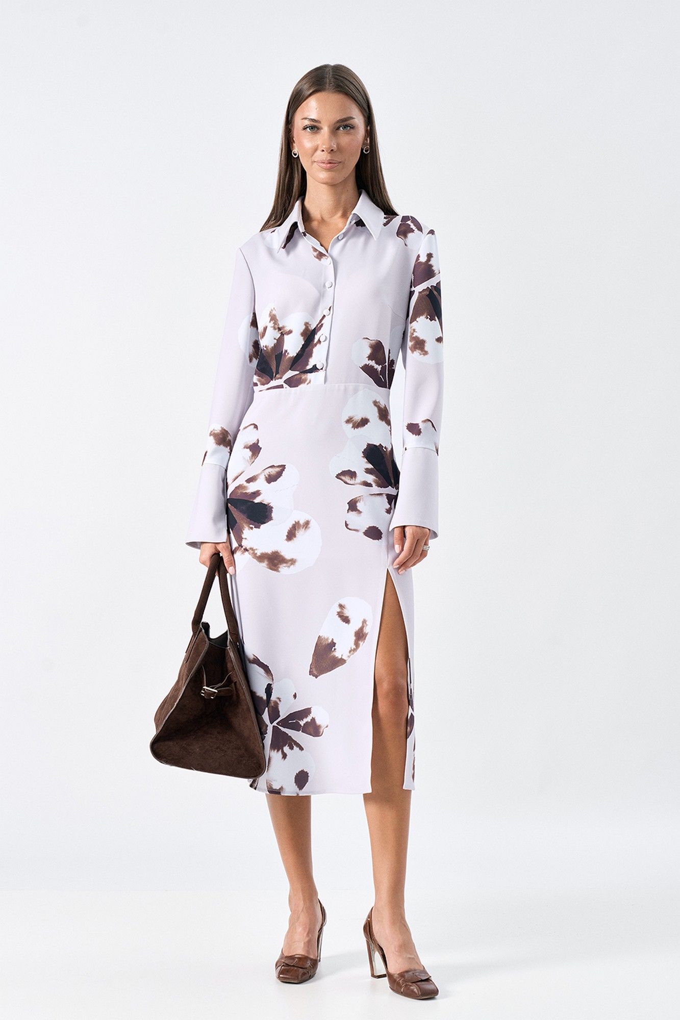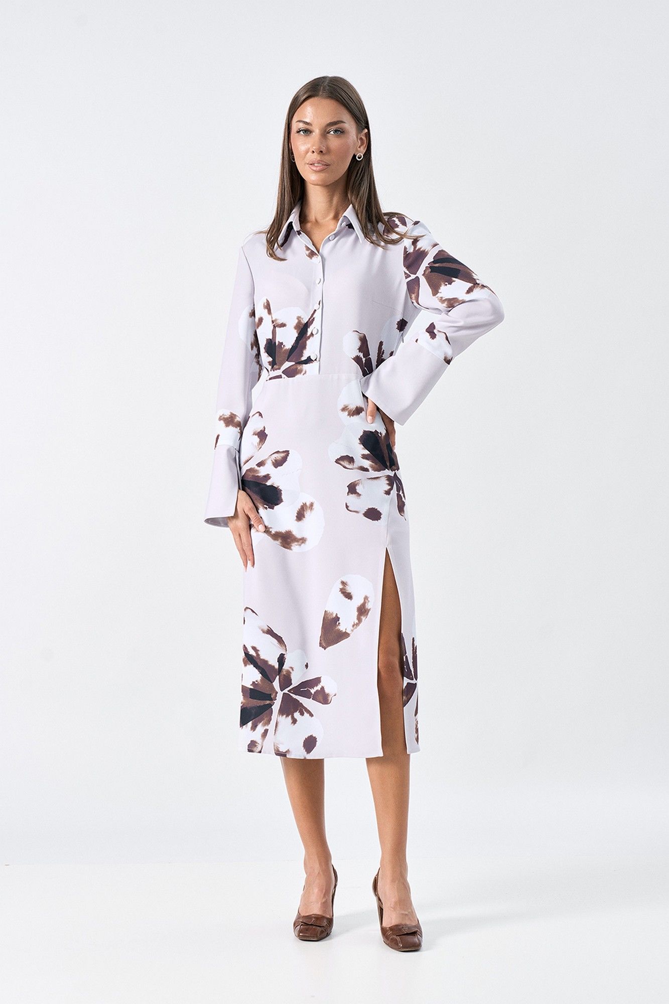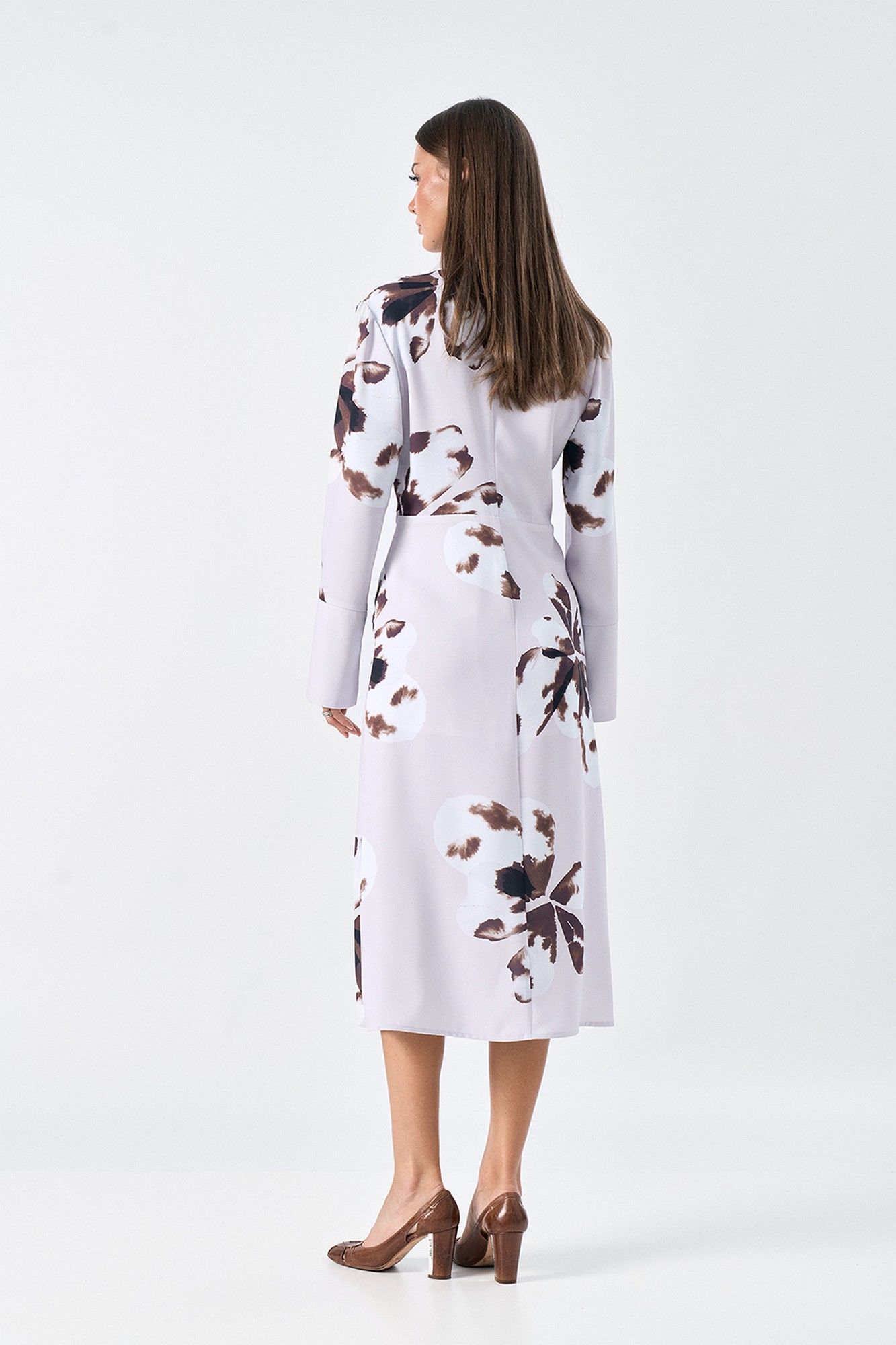 Платье полуприлегающего силуэта из легкой костюмной ткани. Воротник-рубашечного типа. Рукав длинный, втачного покроя. Застежка центральная на петли и пуговицы , в боковом шве обработана застежка на потайную тесьму-молнию. Длина спинки 118, 118, 118, 118 Ширина изд на уровне проймы 50, 52, 54, 56 Длина рукава 62, 62, 62, 62 Ширина изд по линии талии 41, 43, 45, 47 Ширина изд на уровне линии бедер 53, 55, 57, 59