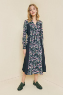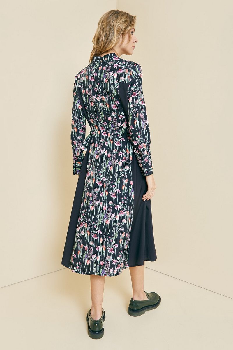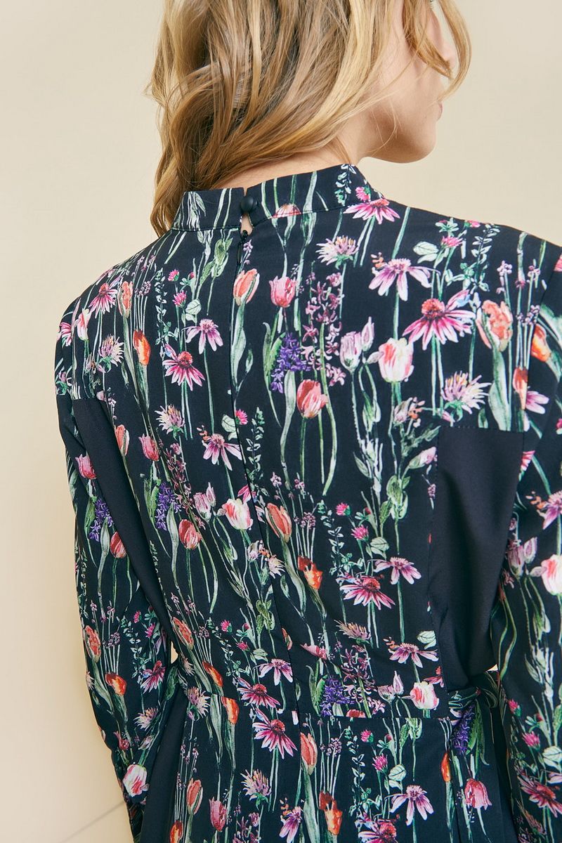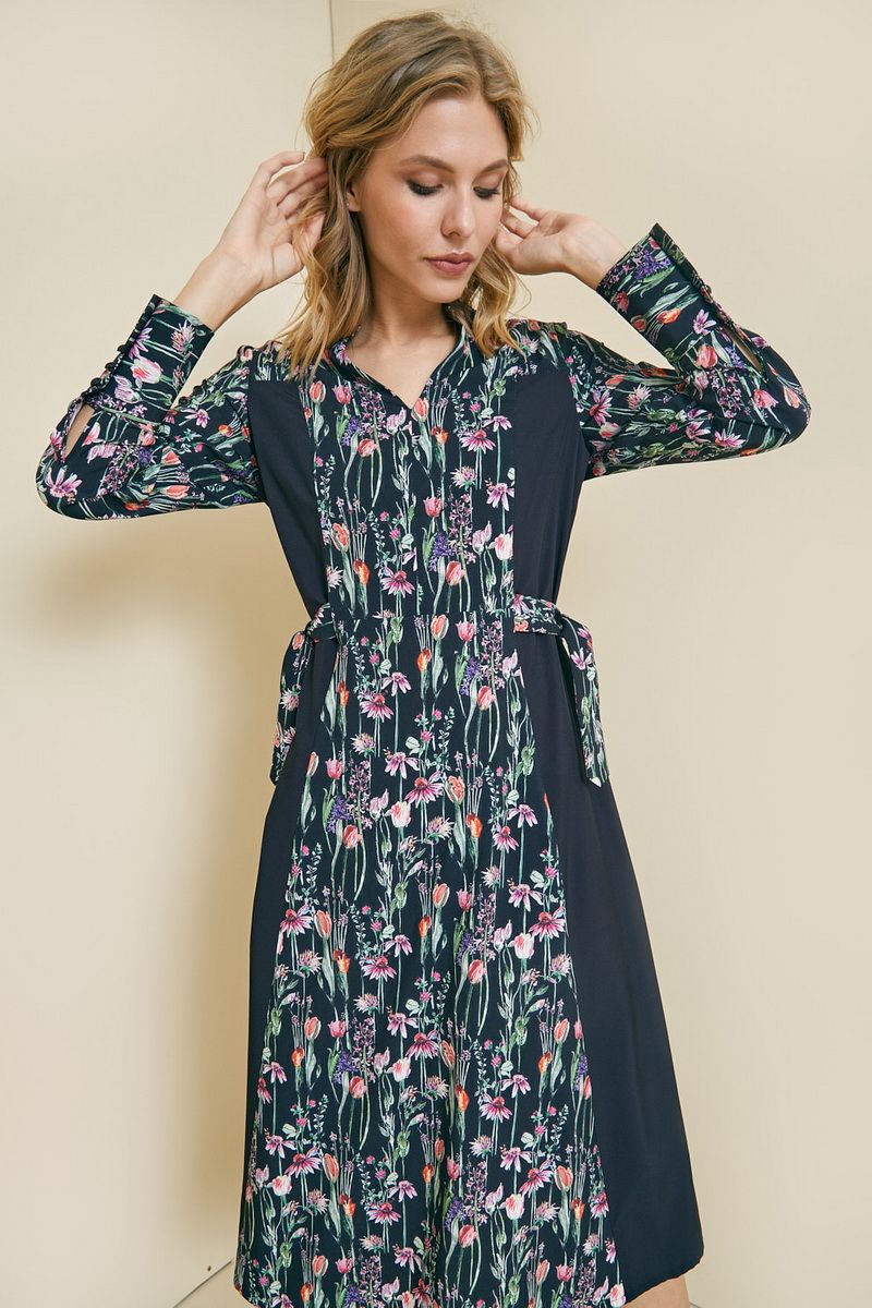 Платье полуприлегающего силуэта с вертикальными рельефами. Горловина V-образной формы, воротник-стойка, рукав длинный, втачной с манжетой. На спинке обработана застежка на потайную тесьму-молнию. Изделие на подкладке. Есть в нашей коллекции и нарядные вещи. Отбельное место занимают платья, которые нельзя записать в разряд праздничные, но и назвать их повседневными тоже сложно. Одно из них перед вами. Яркий цветочный принт привносит в образ краски, чёрные вставки уравновешивают излишнюю яркость. Возможно отличие фотографии по оттенку, связанное с разной цветопередачей монитора. Длина по центру спинки : , 117см., 117см., 117см., 117см., 117см., 117см. По груди : , 49см., 51см., 53см., 55см., 57см., 59см. По бедрам : , 55см., 57см., 59см., 61см., 63см., 65см. По талии : , 47см., 49см., 51см., 53см., 55см., 57см. Длина рукава : , 60см., 60см., 60см., 60см., 60см., 60см. Ширина рукава : , 16.3см., 17см., 17.7см., 18.3см., 19см., 19.7см