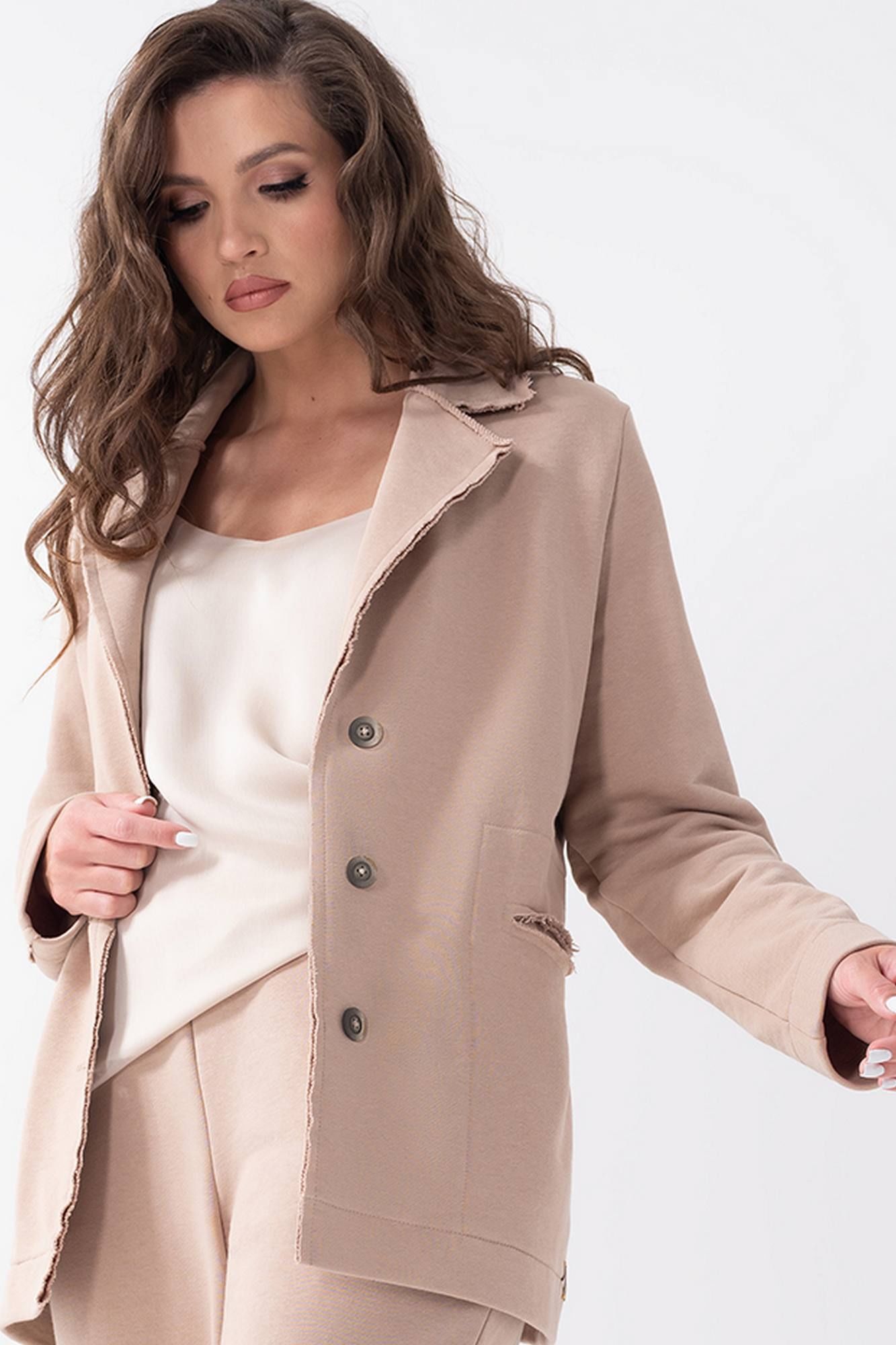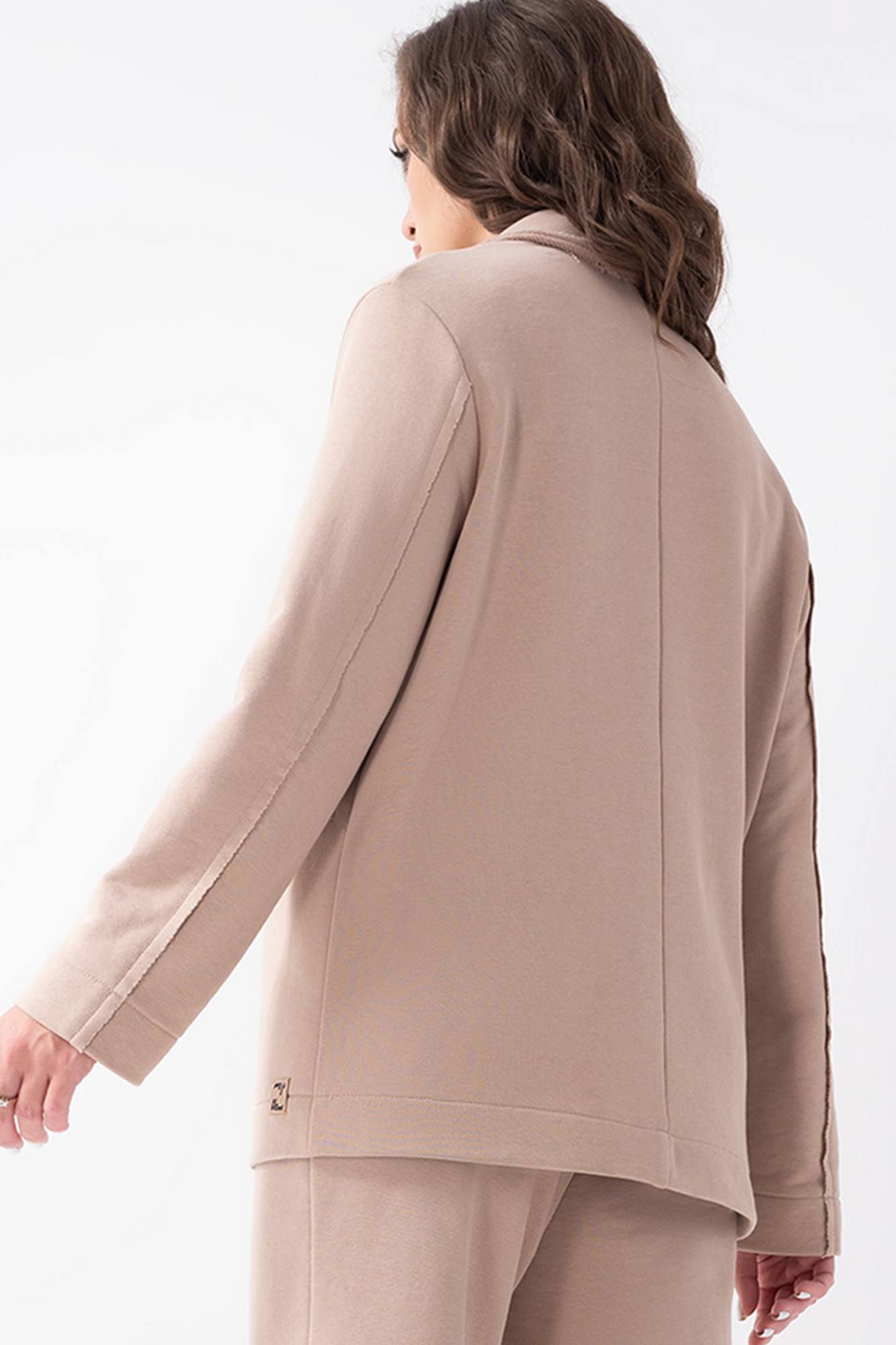 Трикотажные брюки слегка зауженные книзу, с поясом на резинке, в боковых швах - карманы.Низ брюк обработан современным методом: тесьмой и отворотом с необработанным краем. Длина изделия по боковому шву в размерах 44-50 - 103 см, в 52-58р - 105 см.