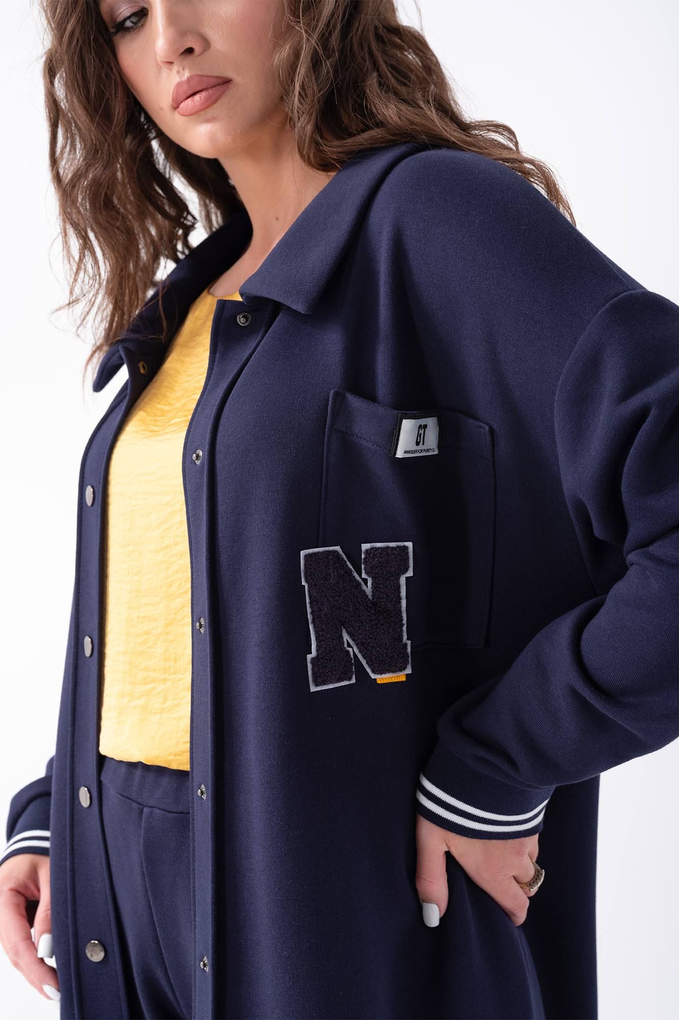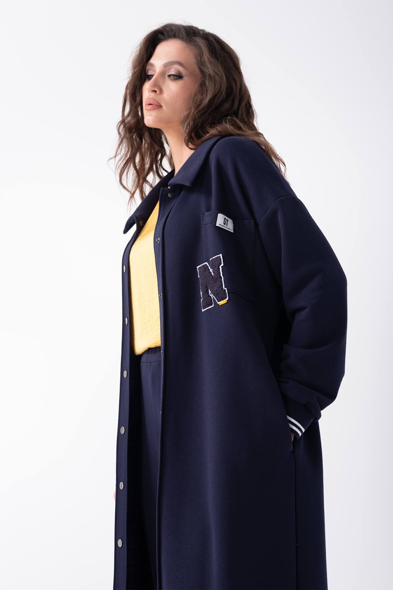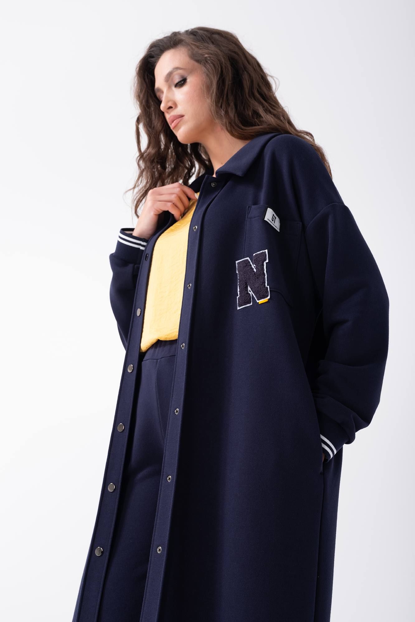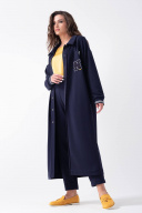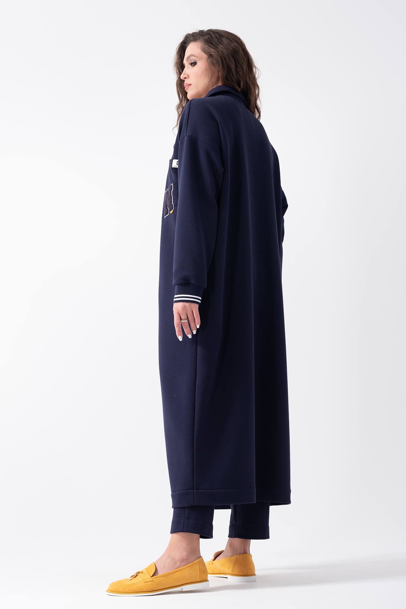 Длинный женский кардиган прямого силуэта без подкладки. Выполнен из трикотажной ткани средней плотности. Воротник рубашечного типа, застежка центральная на кнопки. На левой полочке накладной карман с декоративной нашивкой. Рукав втачной на спущенной пройме с отрезной манжетой. Длина изделия по спинке в 44-48р - 122 см, длина рукава - 50 см, ширина плеча -23 см. В 50-54р длина изделия по спинке -123 см, длина рукава - 51 см, ширина плеча - 24 см.