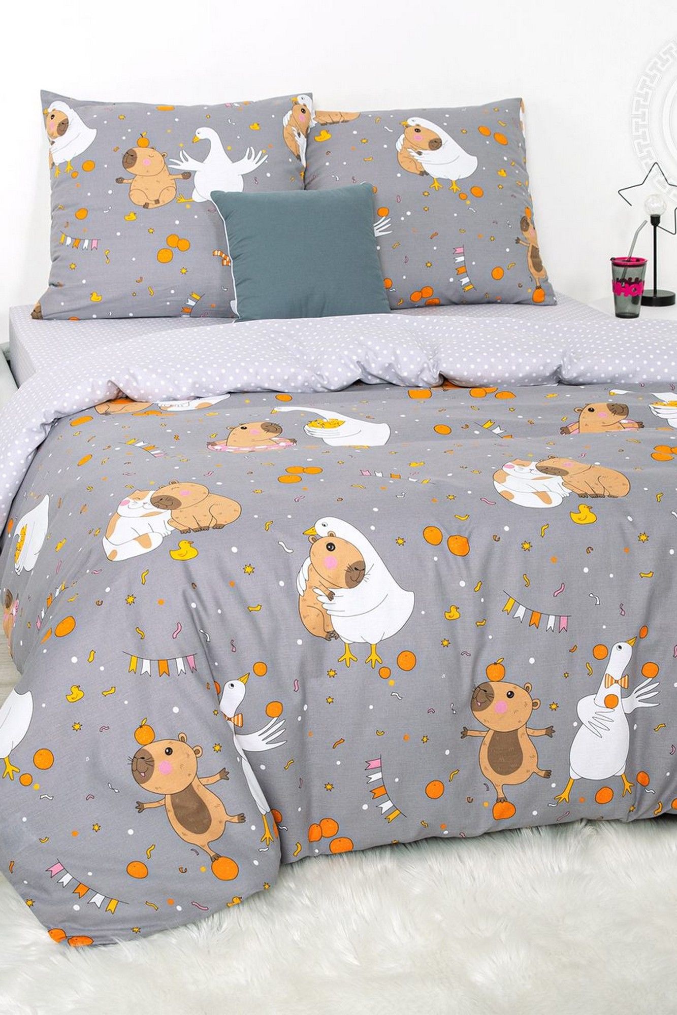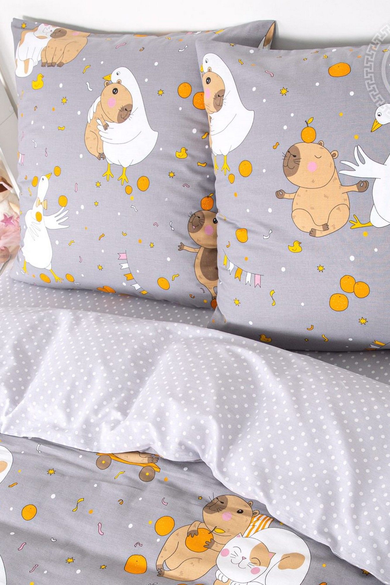Комплект постельного белья Премиум (бязь). Размер: 1,5-спальный Состав: 100% хлопок Тип ткани: Бязь Премиум Пододеяльник 1 шт: длина 215 см, ширина 143 см Простыня 1 шт: длина 215 см, ширина 150 см Наволочки 2 шт: 70*70 см Постельное белье с капибарой, гусями и котятами из поплина – настоящая находка для создания уютного уголка. Забавные и симпатичные герои, экологичные и гипоаллергенные материалы, нежные оттенки – комплект из 100% хлопка подарит каждому ребенку чудесные сны и пригласит мальчишек и девчонок в мир сказки. «Капигуси» – рисунок, который наполнен очарованием и мягкостью. Он украсит детскую комнату и принесет радостные эмоции/порцию обнимашек.