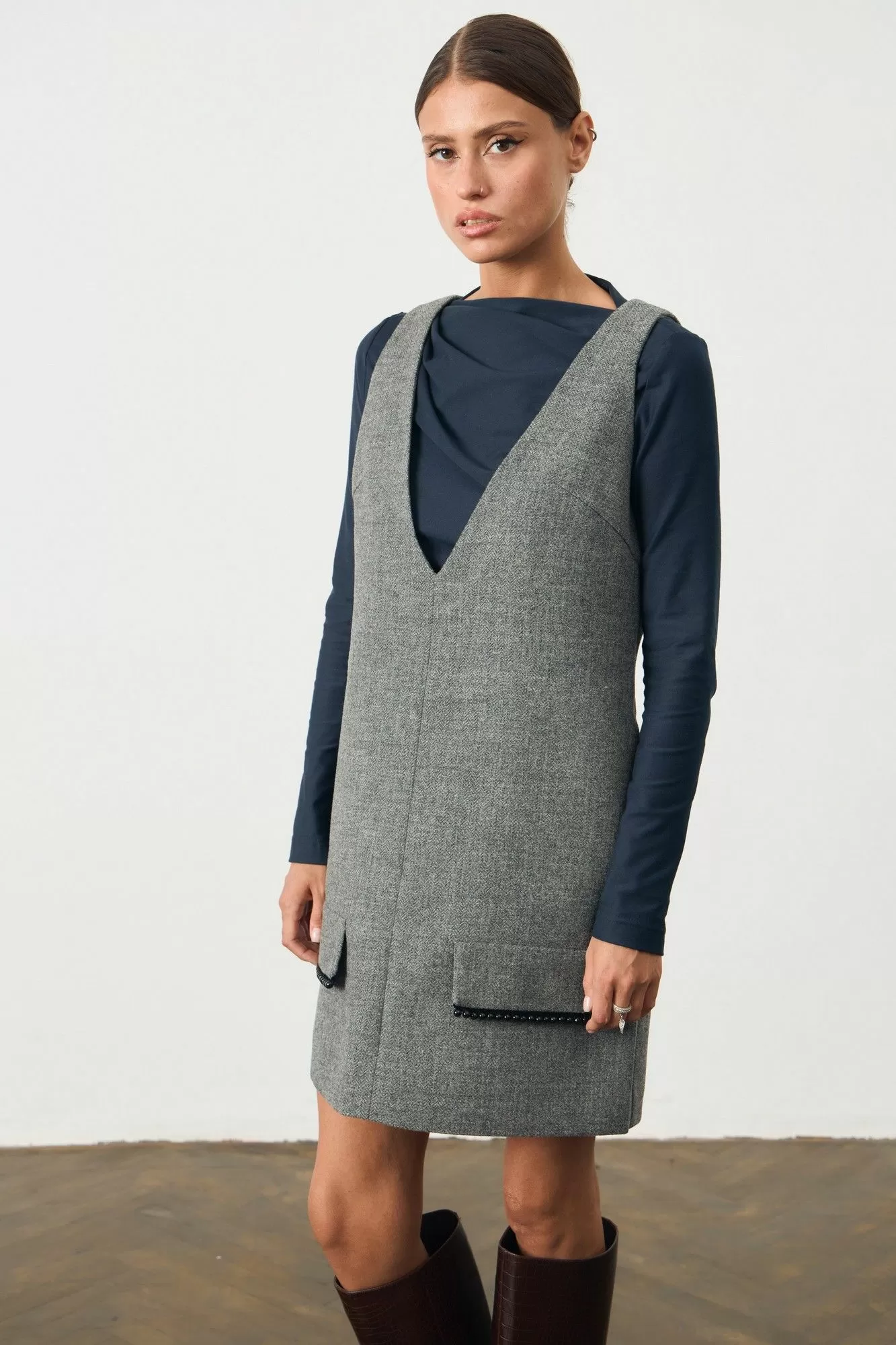 Платье в длине мини, выполнено из костюмной ткани в твидовом стиле. По переду v-образный вырез, по бокам по груди небольшие вытачки, по переду по низу изделия декоративные клапаны. Функциональные карманы внутри боковых швов изделия. Платье полностью на подкладке.