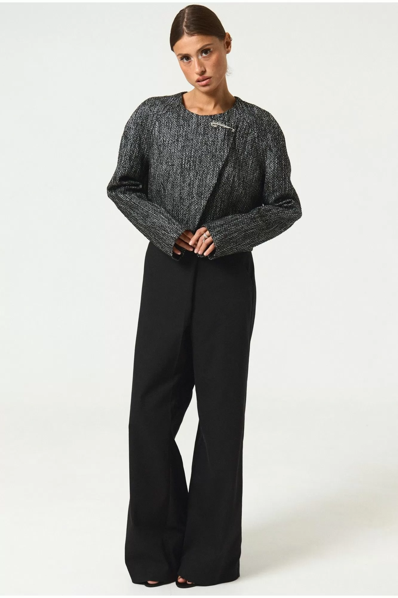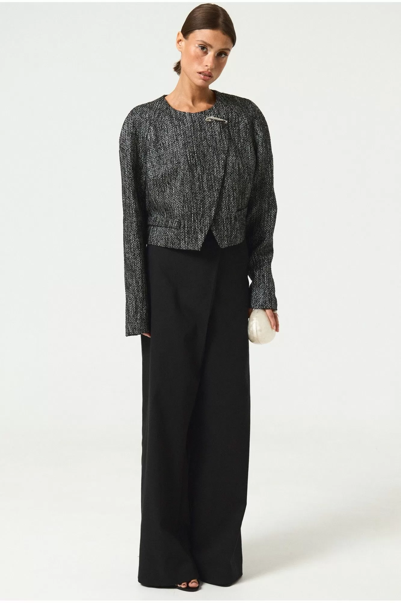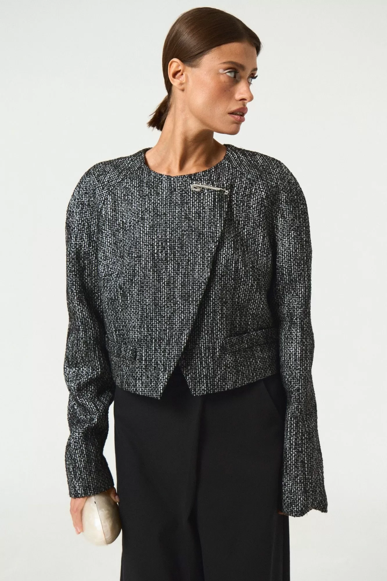 Укороченный жакет прямого силуэт. Рукав реглан. Вырез горловины округлый, без воротника. Двубортная застежка на обметанные петли и пуговицы