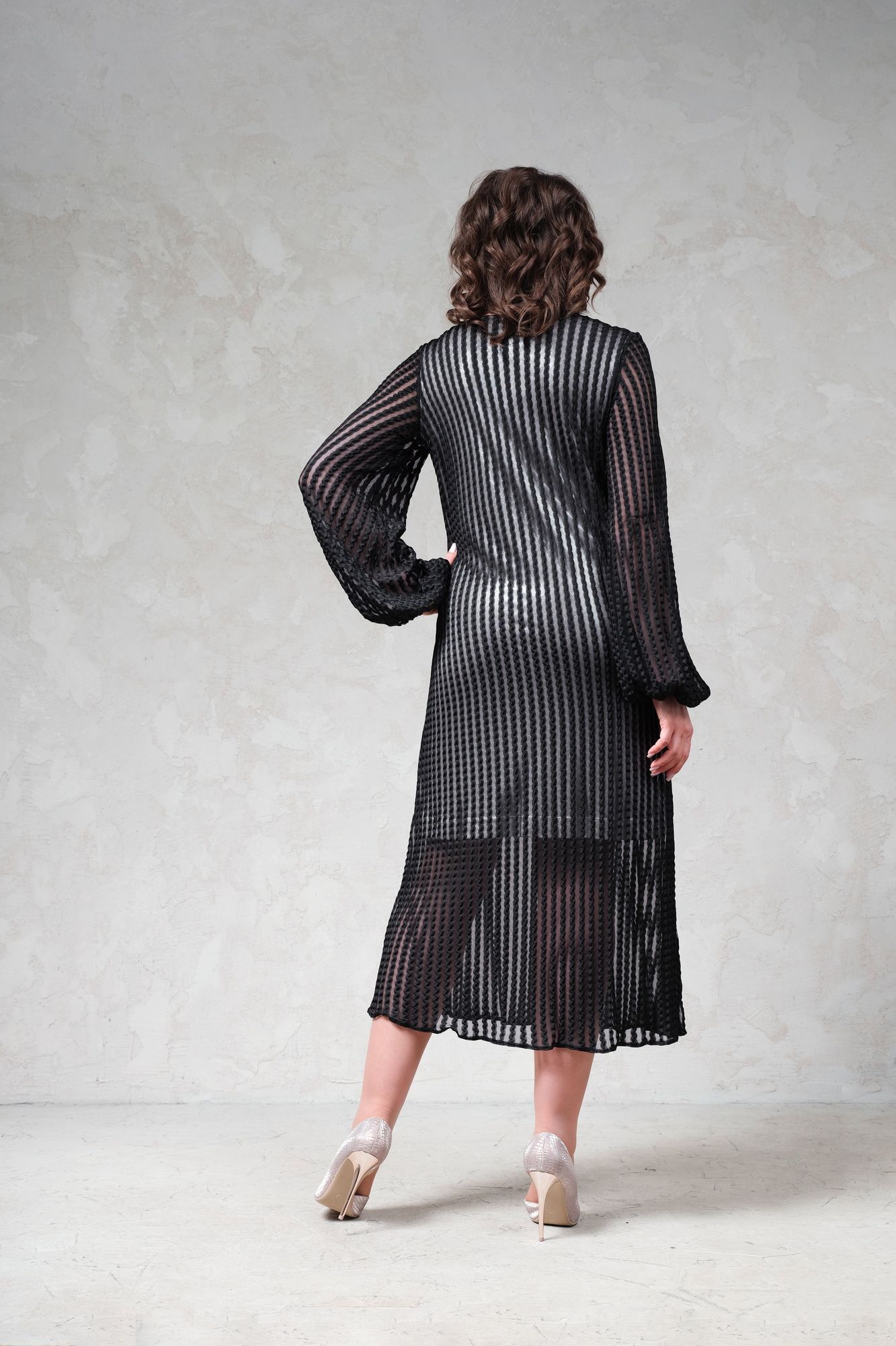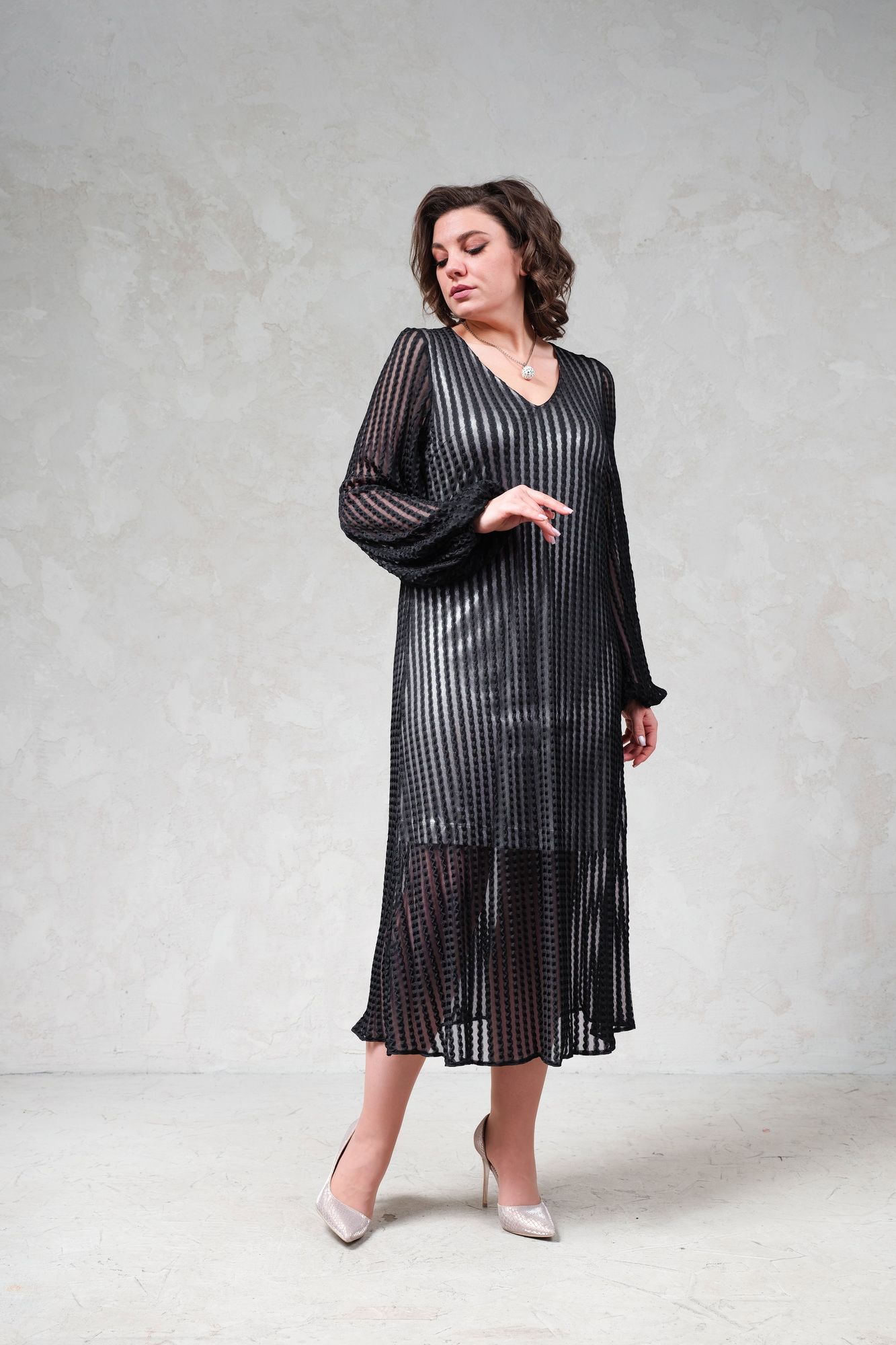 Вечернее кружевное платье свободного кроя. Основная ткань - мягкая трикотажная сетка с кружевом, хорошо тянется. Нижний слой платья трикотаж средней плотности с матовым блеском. Длина изделия по спинке 125 см, длина рукава 70 см(с учетом напуска). Рукав свободный, низ на резинке.