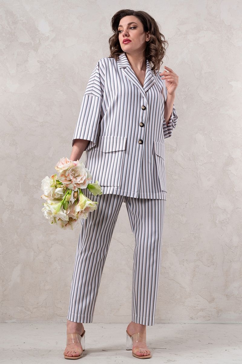 Стильный комплект двойка: брюки+жакет. Ткань костюмно-плательная средней плотности, немного тянется. Брюки классического кроя, застежка на молнию и пуговицу спереди. На переде удобные карманы. Жакет свободного кроя, застежка на пуговицы спереди. На переде удобные карманы. Рукав втачной на спущенной пройме. Изделие без подклада. Длина жакета 80 см, брюк 102 см