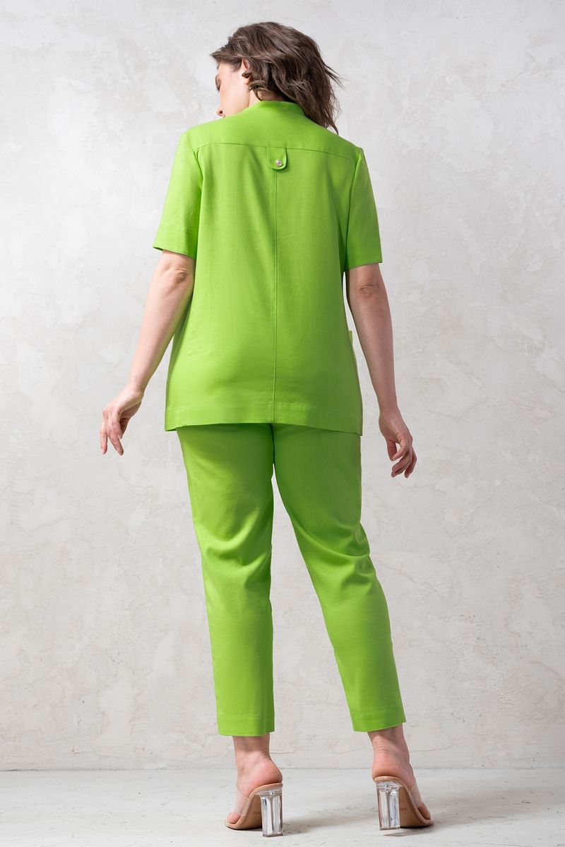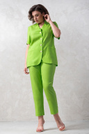 Комплект-двойка: брюки+жакет. Жакет полуприлегающего силуэта из натуральной льняной ткани насыщенного цвета. Воротник со стойкой и отложными лацканами. Застежка на пуговицы. По переду функциональные накладные карманы. Спинка с кокеткой и хлястиком. Рукав с небольшим полукруглым разрезом по низу, украшен пуговицой. Идеальный вариант для летнего гардероба. Брюки классические, немного зауженные к низу. Застежка на молнию и пуговицу спереди, пояс на резинке. В боковых швах удобные карманы. Длина жакета 73см, рукава 26(27) см, брюк 100 см