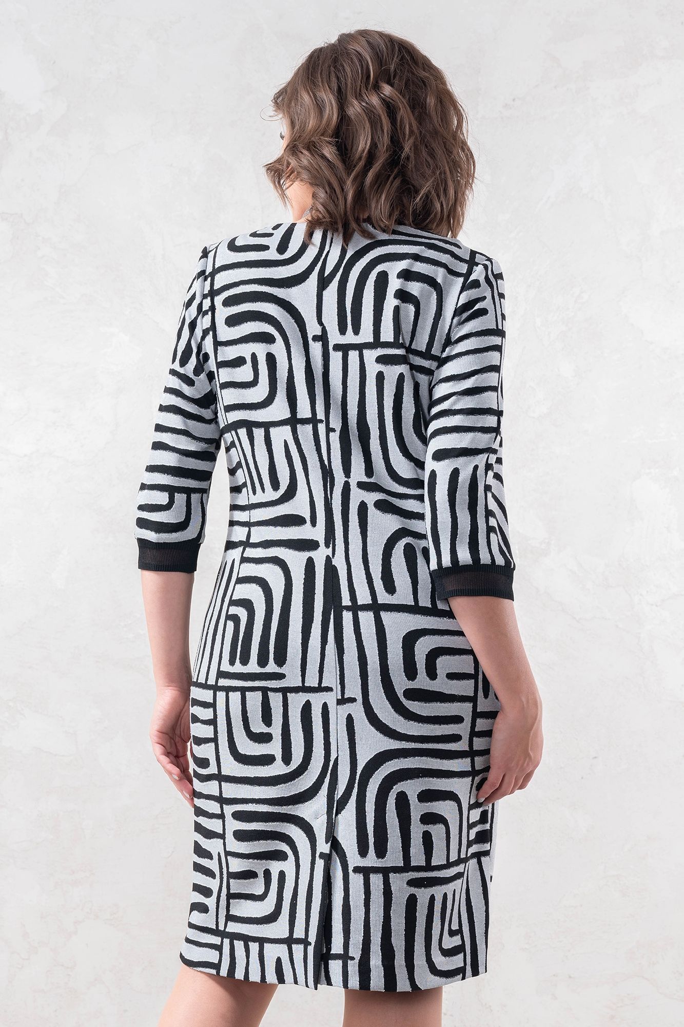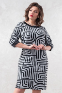 Элегантное трикотажное платье полуприлегающего силуэта. Мягкий трикотаж средней плотности, хорошо тянется. В среднем шве спинки шлица. Длина изделия по спинке в 48-50-52 размерах 99 см, в 54-56-58 размерах 103 см. Длина рукава в 48-50-52 размерах 43 см, в 54-56-58 размерах 45 см.
