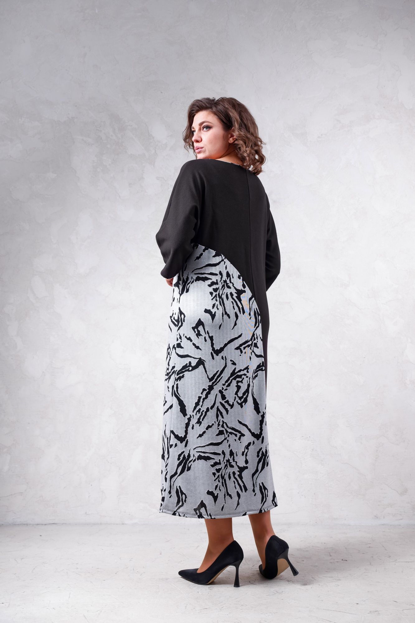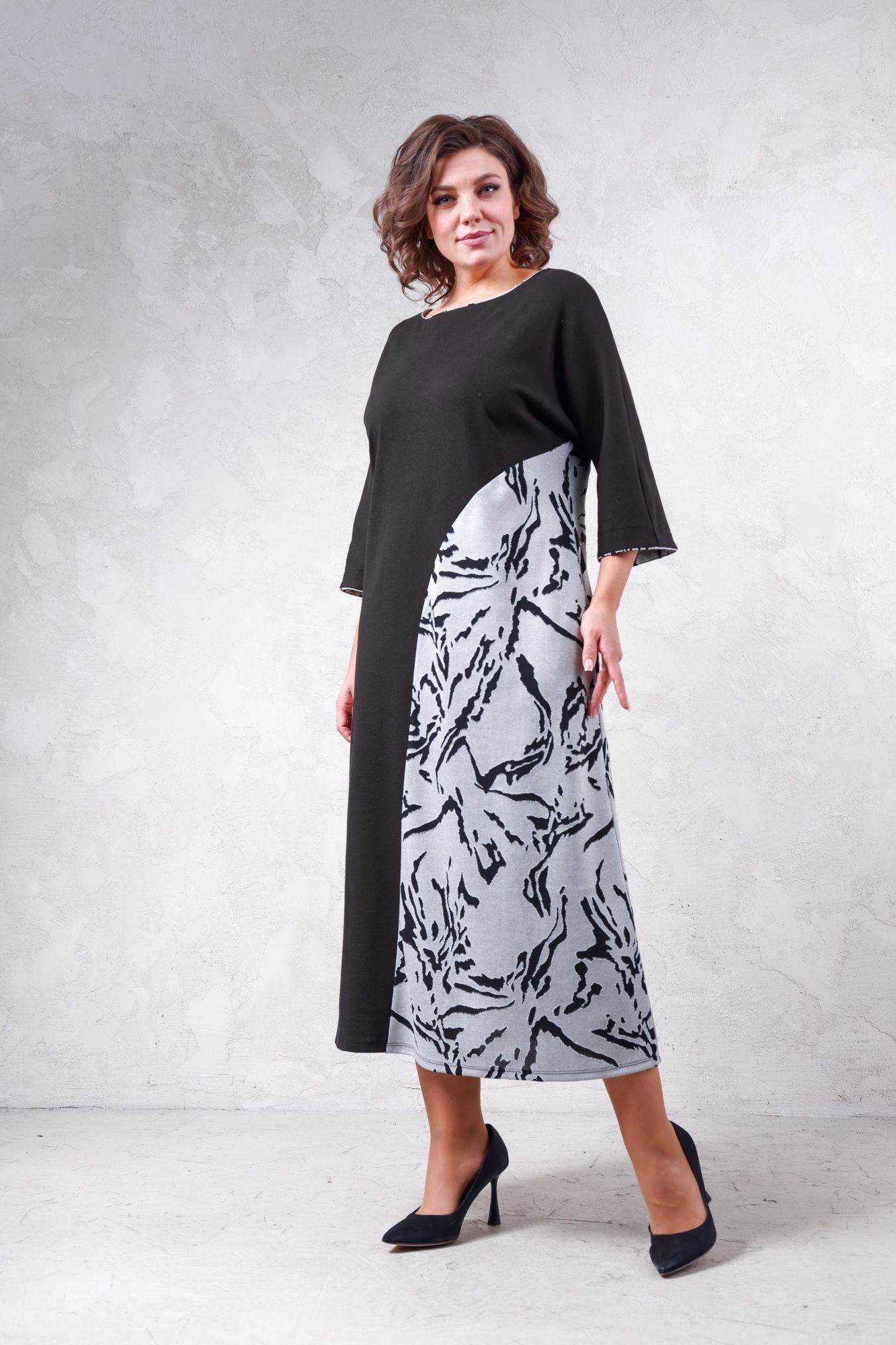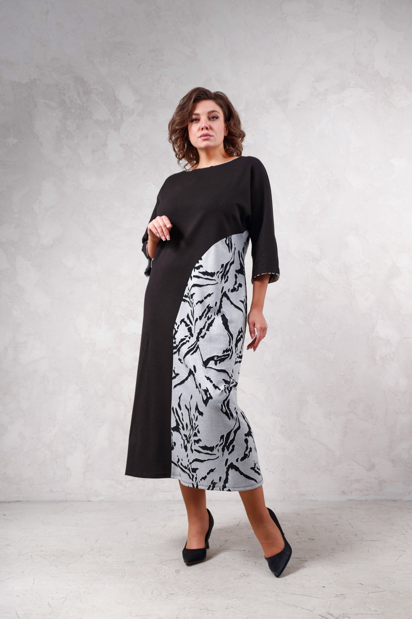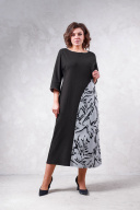 Платье женское из трикотажного полотна, длиной до середины икры. Свободного силуэта с целькройным рукавом 3/4. По левому боковому вставка из отдельной ткани. По центру переда печать, горловина полулодочка.