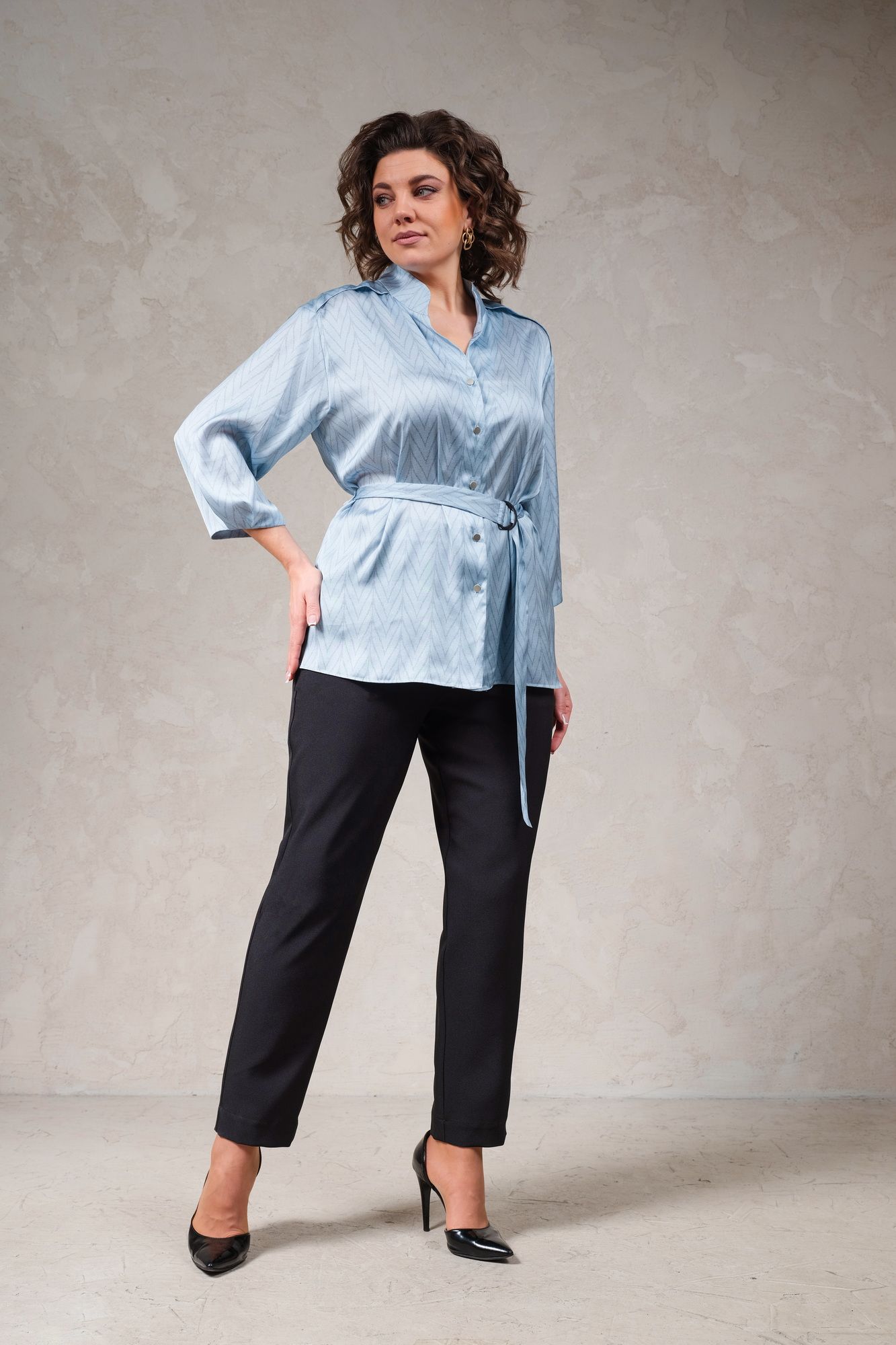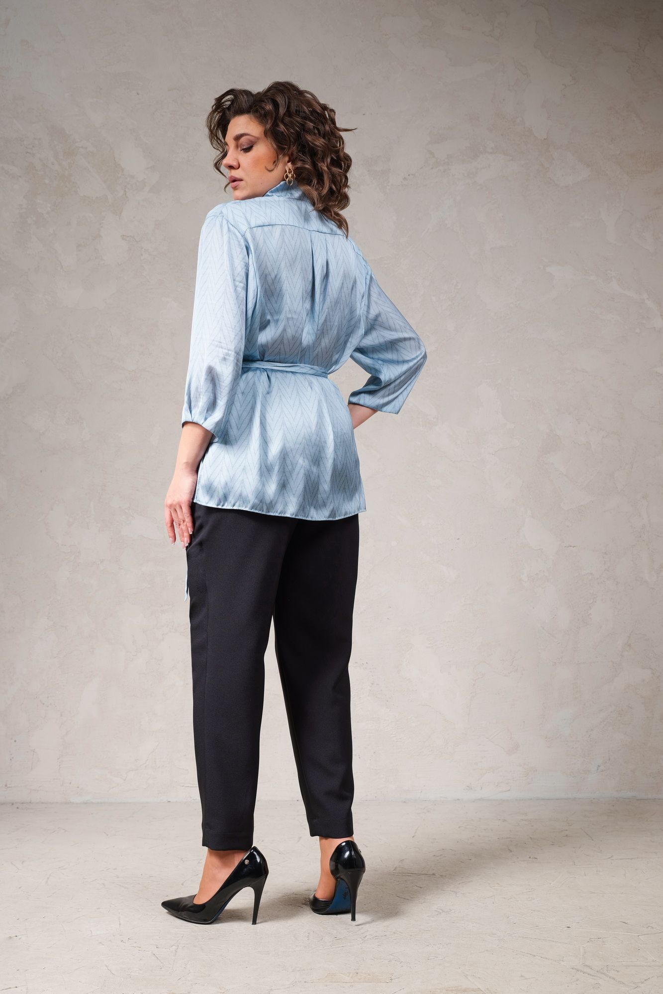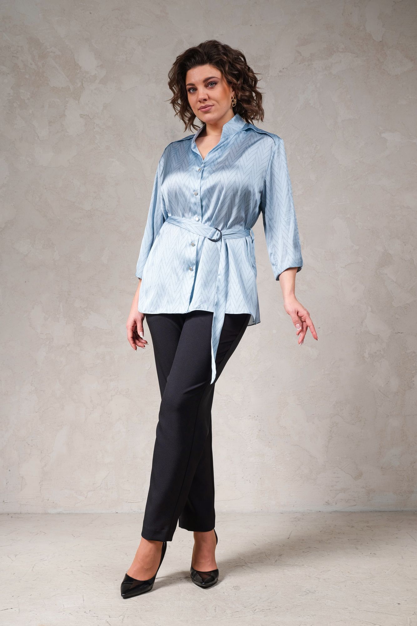 Удлиненная блузка из нежного атласа с V-образным вырезом и воротником-стойкой. Впереди выполнены отлетные кокетки. Также на спинке имеется кокетка. Рукава втачные 3/4 с мягкими складками по низу. Застежка вперелди на петли и пуговицы. Блуза комплектуется съемным поясом с пряжкой-полукольцами. По низу блузки выполнены разрезы.
