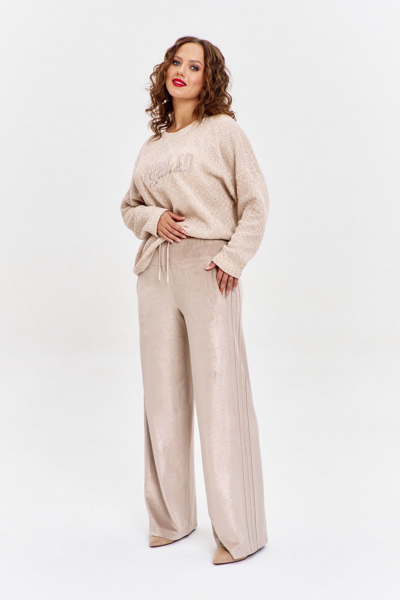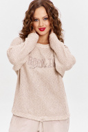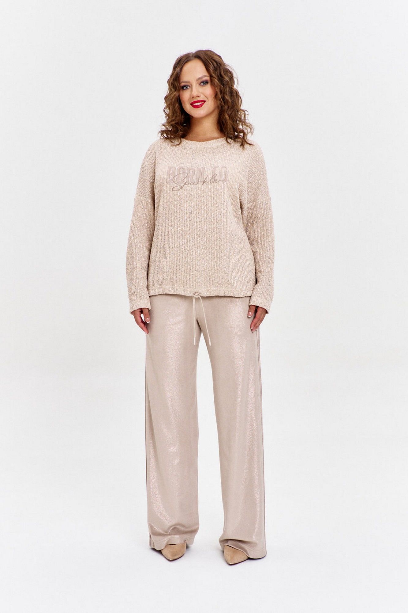 Джемпер из фактурного трикотажа с мерцающими пайетками, свободного силуэта, с длинным рукавом и круглой горловиной. По низу изделия кулиса со шнуром. На переде авторская вышивка.