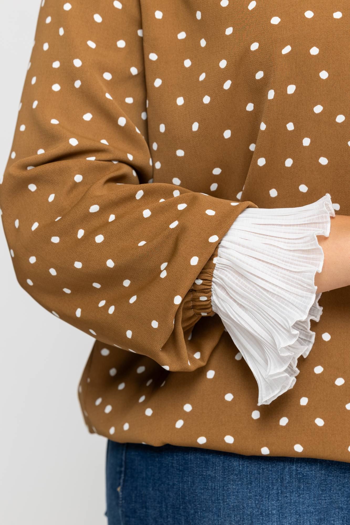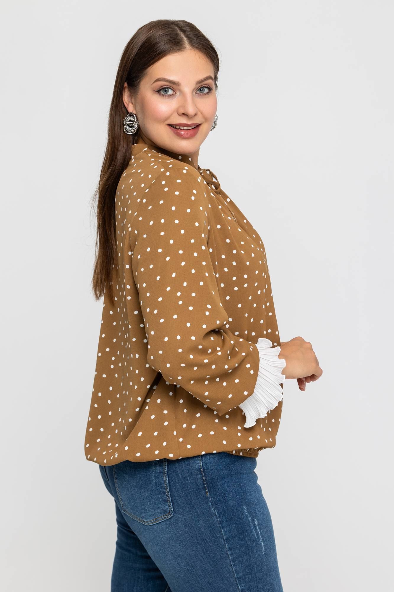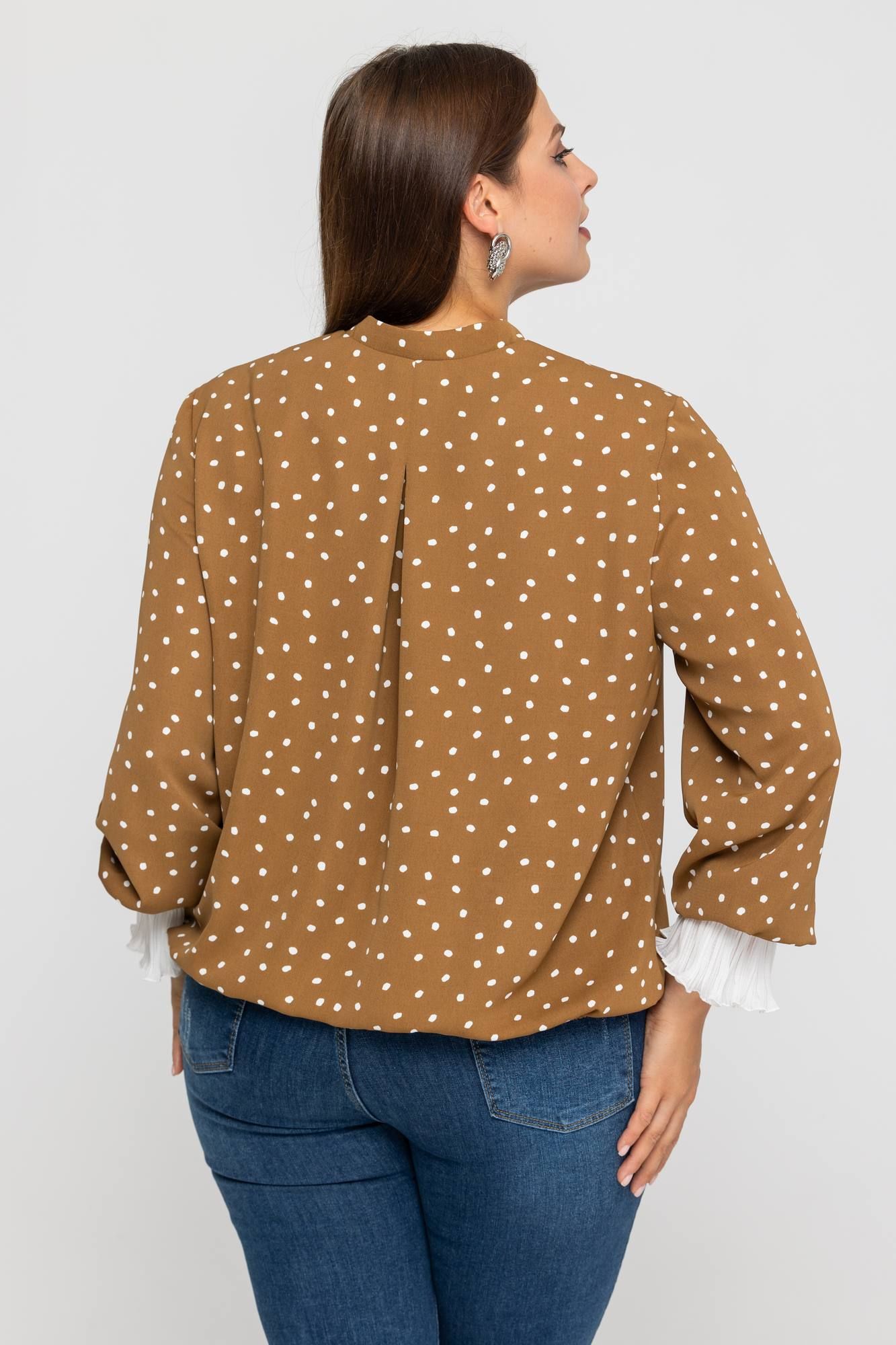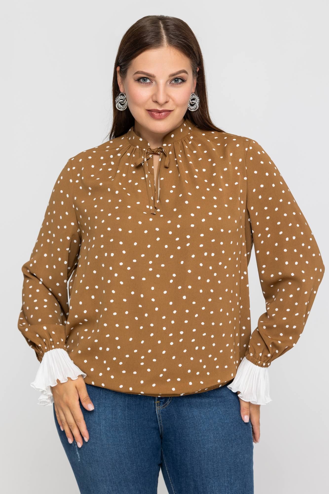 Нежная блузка в принт горошек из вискозы приятная тактильно к телу. Модель с длинным рукавом, манжета выполнена из гофре, горловина оформлена в виде стойки с завязкой. Блузка универсальная, хорошо смотрится с брюками и юбками.