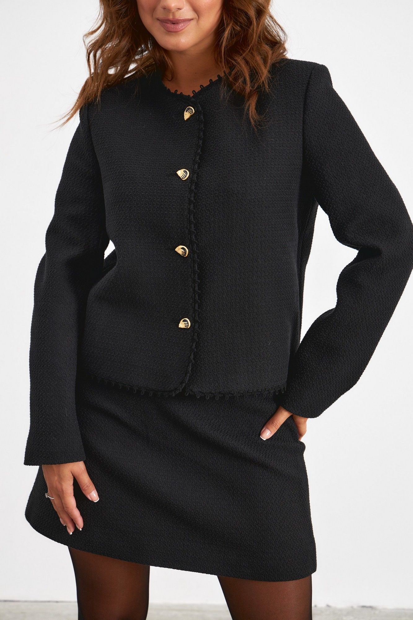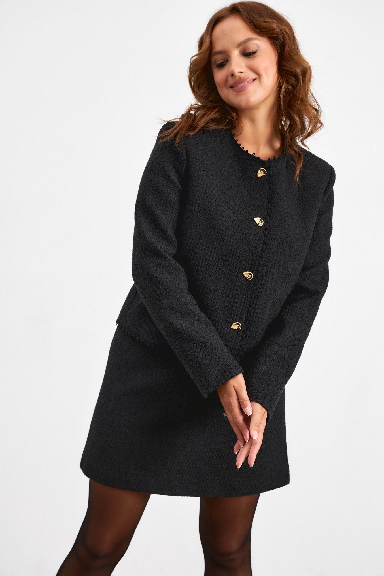 Комплект из жакета и юбки, выполнен из фактурной ткани. Жакет прямого кроя, выполнен из фактурной ткани в черном цвете. По переду застежка на стильные дизайнерские пуговицы. Рукав втачной. Юбка А-образного силуэта, выполнена из фактурной ткани, черного цвета, юбка с потайной молнией.