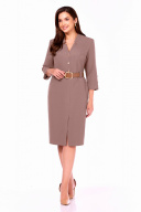 Женское платье полуприлегающего силуэта выполнено из однотонной плательно-костюмной ткани. Платье с центральной застёжкой на 3 петли и пуговицы . Перед со средним швом заканчивающимся шлицей, рельефами из пройм до боковых швов,в швах выполнены карманы,и нагрудными вытачками.Спинка цельная.По переду и спинке в области талии выполнены шлевки для ремня. Рукава втачные , двухшовные, длиной 3/ 4. Внизу верхнего шва рукава декоративные пуговицы и разрез. Вырез горловины фигурный со стойкой. Платье укомплектовано поясом из экокожи . Пояс может быть отличаться от фото.