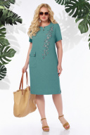 Платье женское полуприлегающего силуэта выполнено из плательно-костюмной ткани.Перед с нагрудными вытачками и дизайнерской вышивкой слева и накладным карманом с клапаном и декоративными пуговицами справа.Круглый вырез горловины с планками и декоративными пуговицами.Спинка цельная.Левый боковой шов заканчивается шлицей. Рукава втачные двухшовные короткие.Верхний шов рукава заканчивается разрезом.