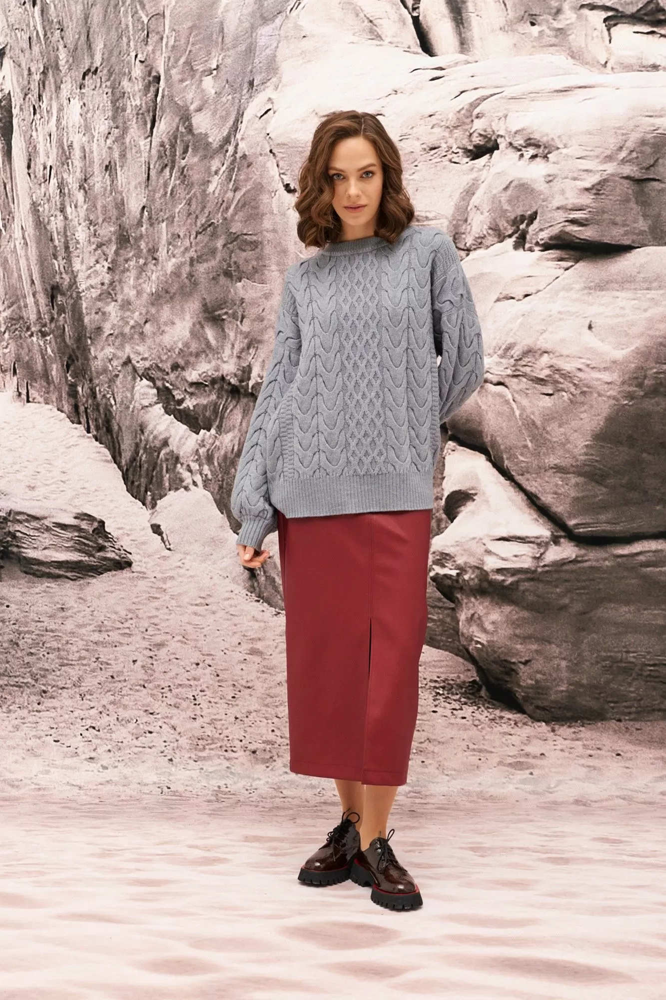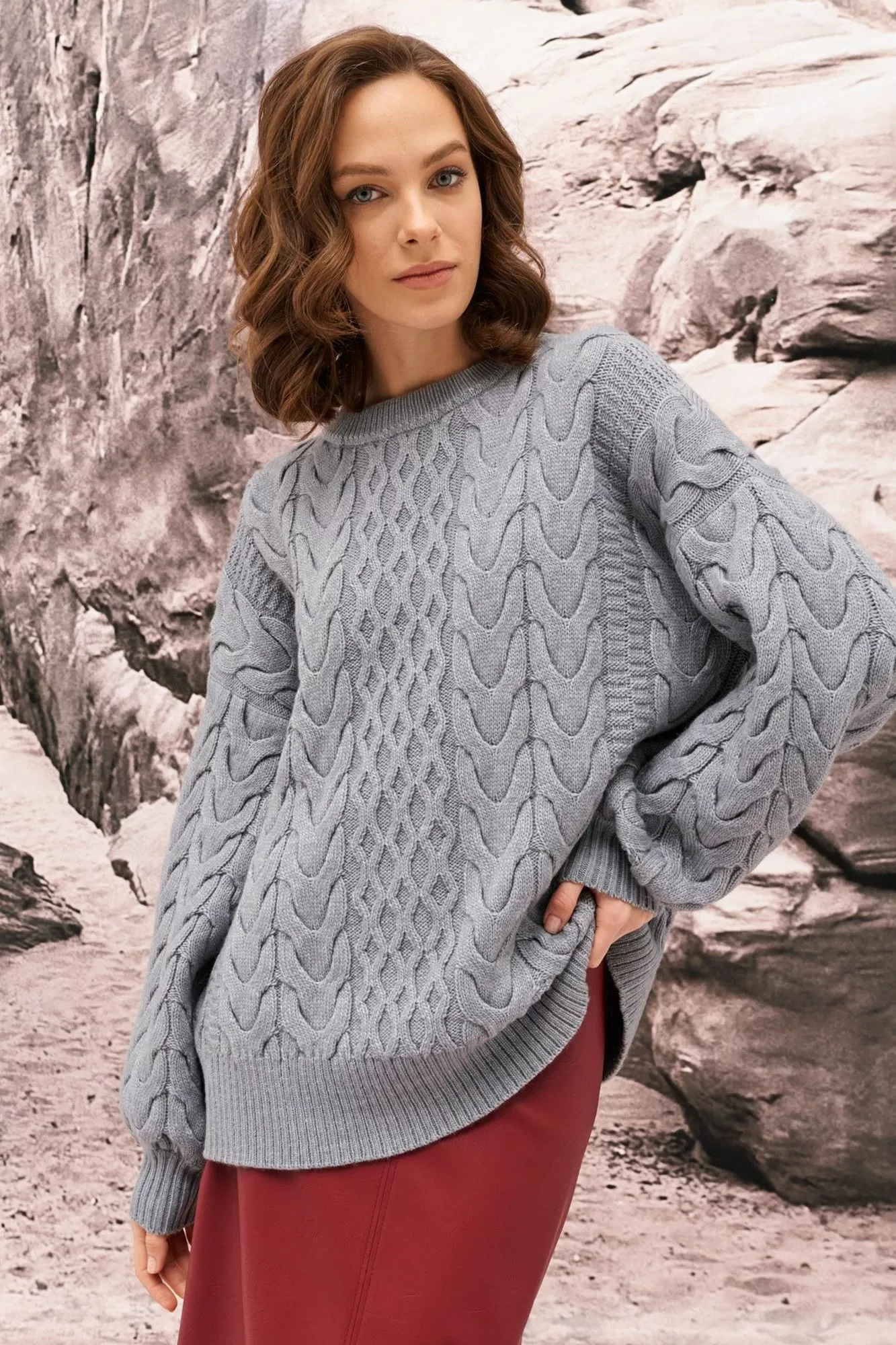 Джемпер выполнен в объемном переплетении с элементами косы.