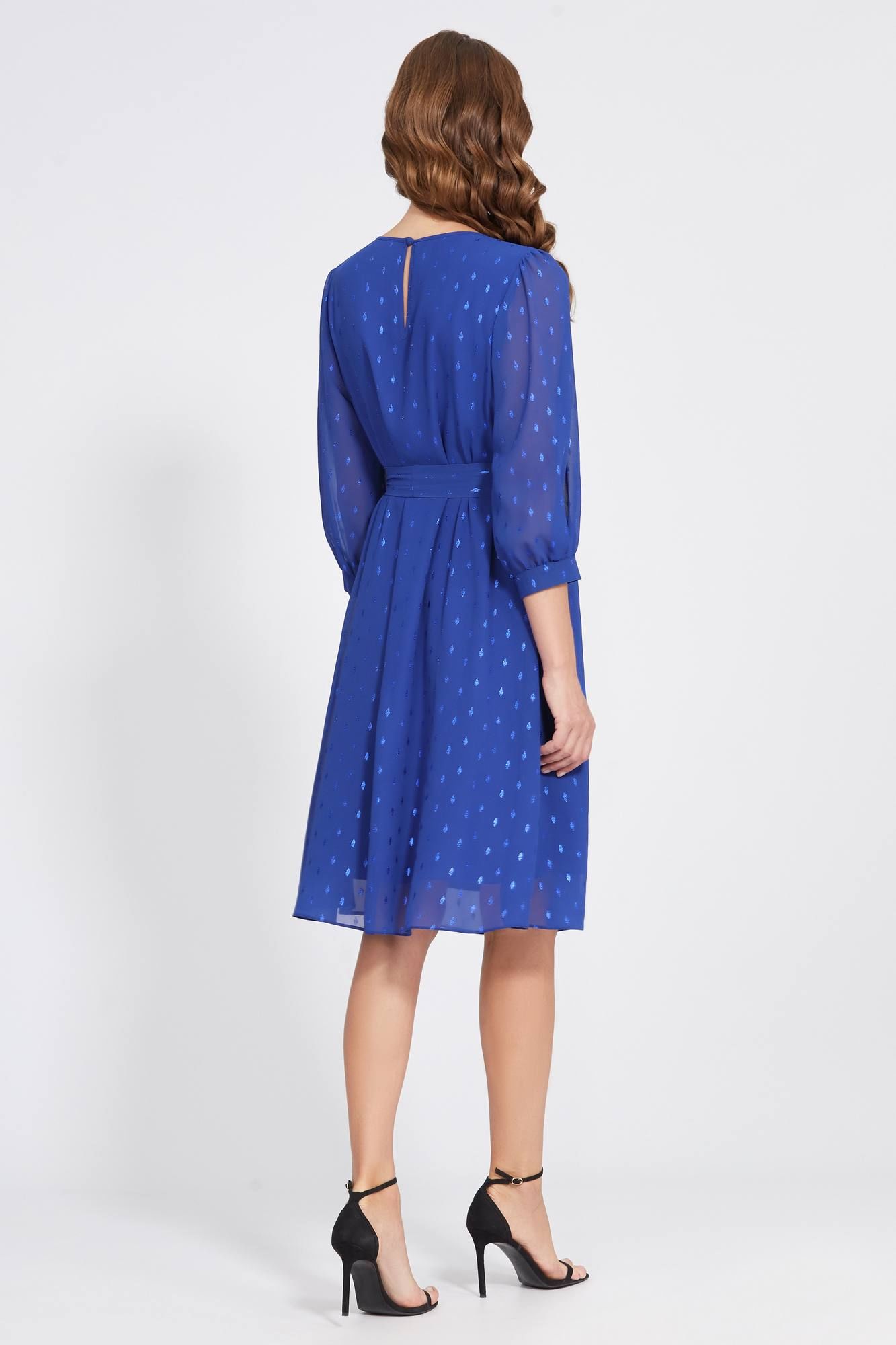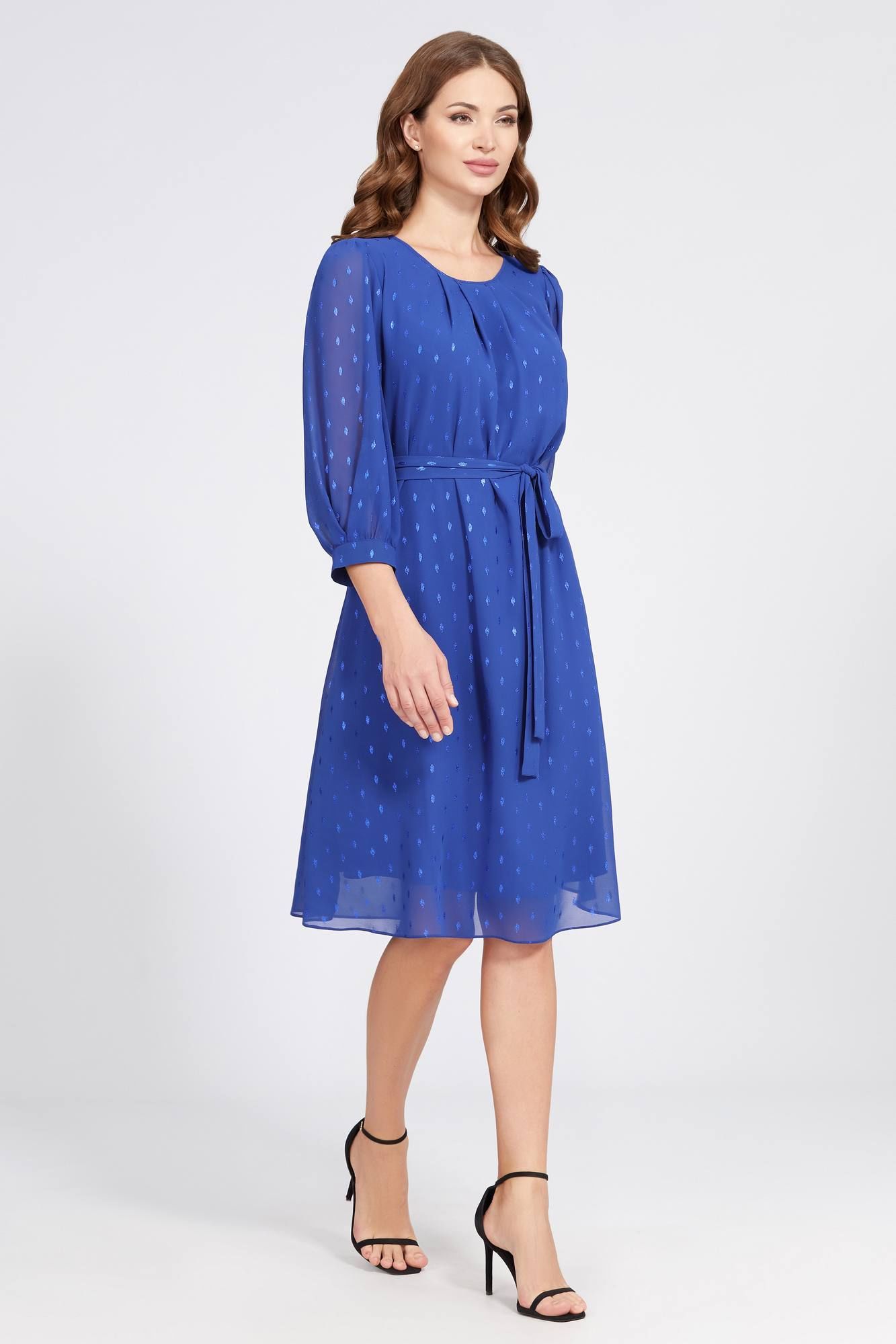 Чрезвычайно нежное платье А-образного силуэта выполнено из красивого шифона с мерцающим дизайном в тон. Привлечь особое внимание к себе также помогает интересный крой со складками по горловине переда платья и интересное сочетание сборки и встречной складки по рукавам. Модель с округлой формой горловины и с втачными укороченными рукавами с притачными манжетами. Для удобства в эксплуатации, по спинке обработана каплевидная застёжка на навесную петлю и пуговицу, а также нижний слой платья выполнен из мягкой приятной 100% вискозной ткани. Завершает модель пояс-завязка из основной ткани.