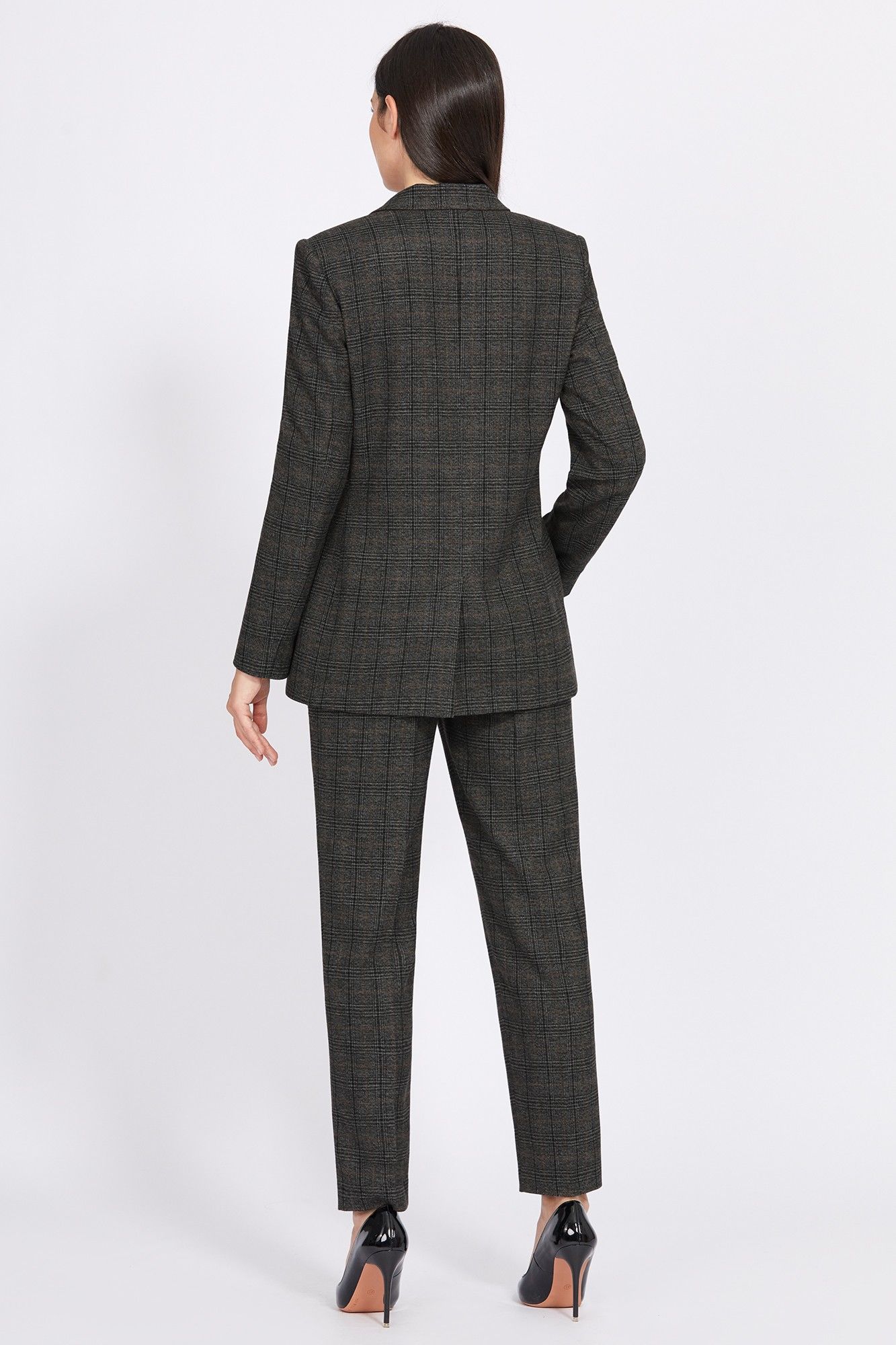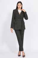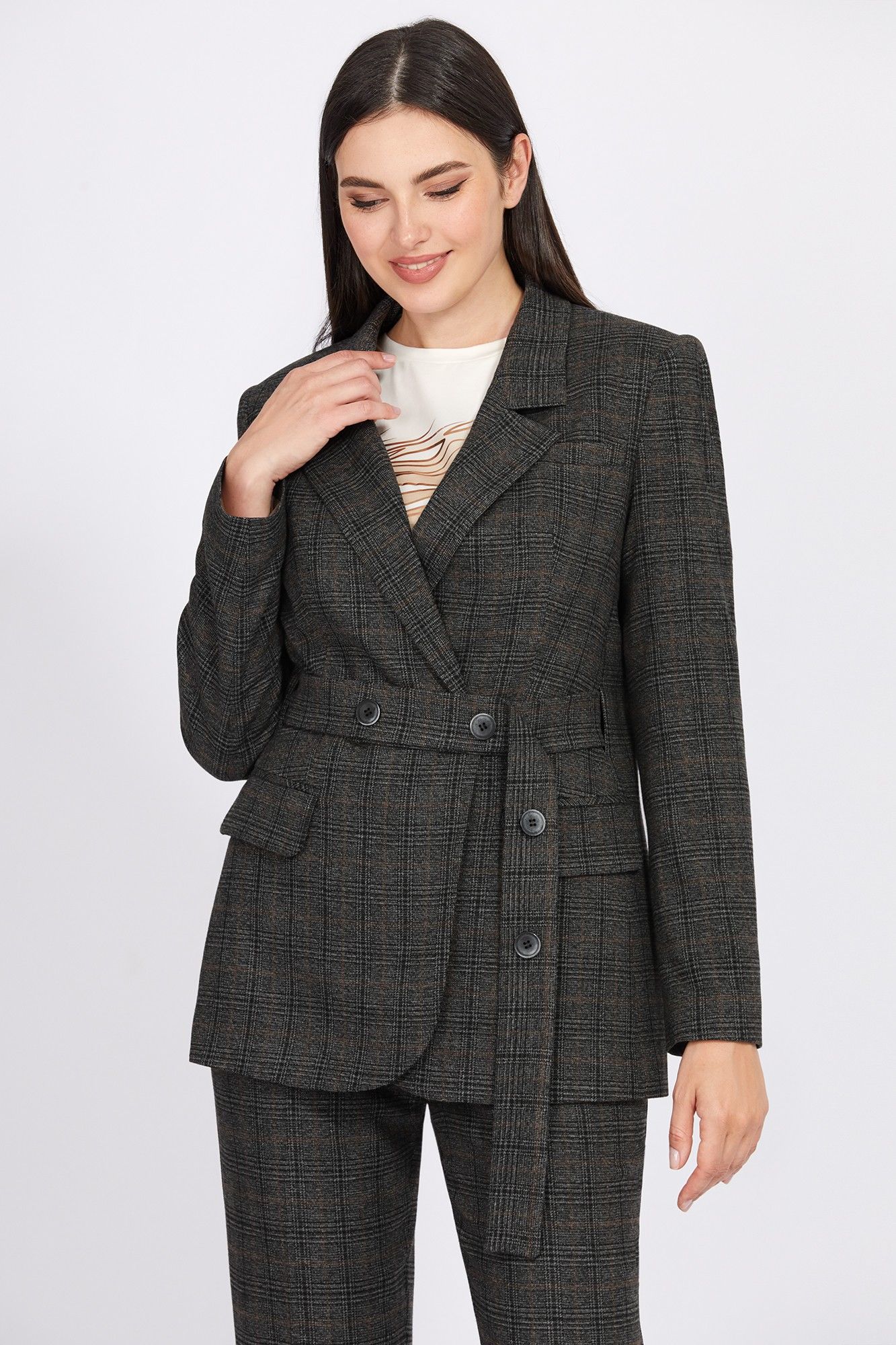 Это двубортный жакет прямого силуэта - сочетание функциональности и стиля. Интересный дизайн имеет классический вид с лацканами и отложным воротником, карманами с клапанами и карманом-обманкой с листочкой, со щлицей в среднем шве спинки и двухшовными втачными рукавами. Новинка- это интересное решение пояса. Модель выполнена из приятной ткани с добавлением вискозы и ненавязчивым клетчатым рисунком. От утренних встреч до вечерних мероприятий, этот жакет предлагает шик и комфорт для любого случая.