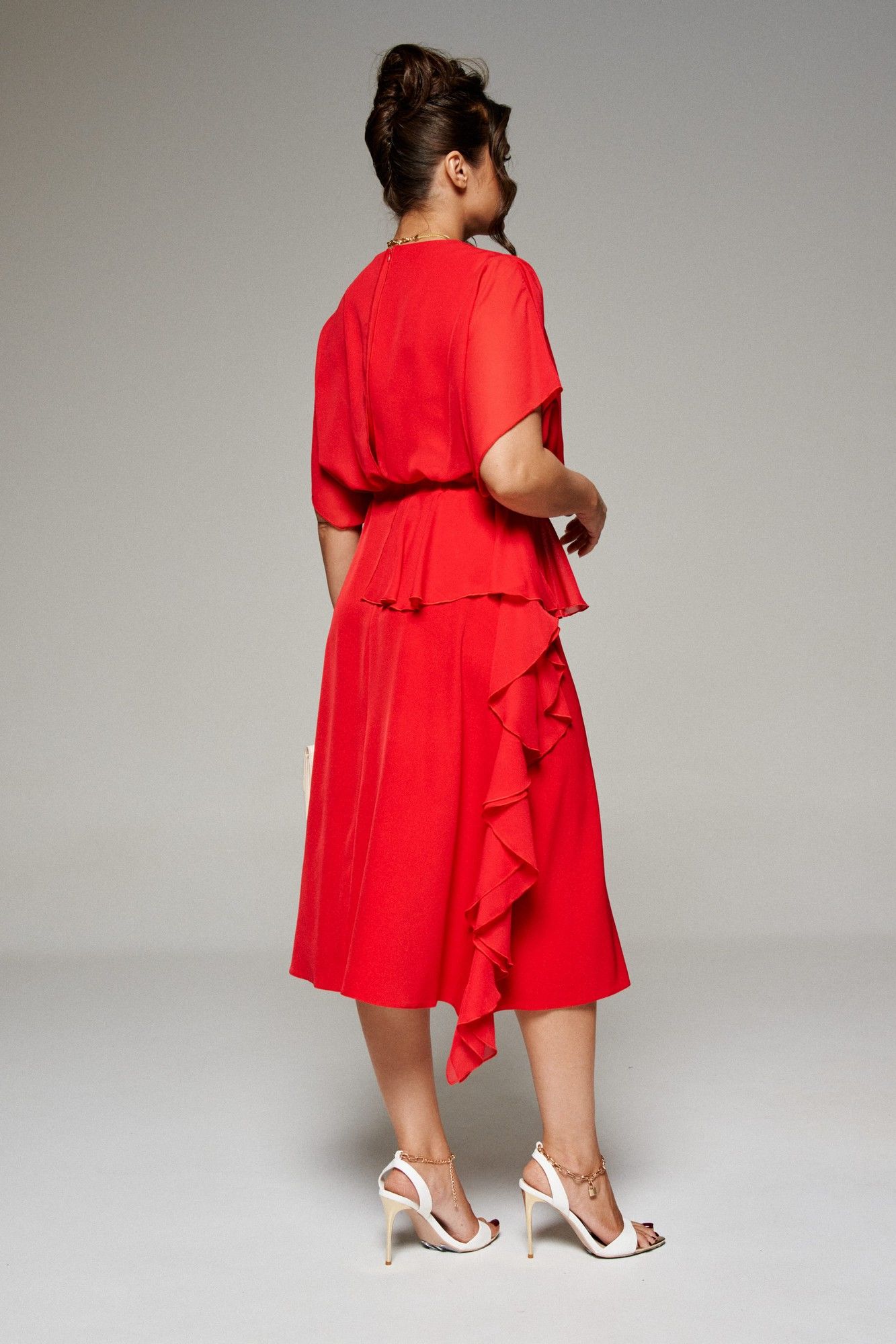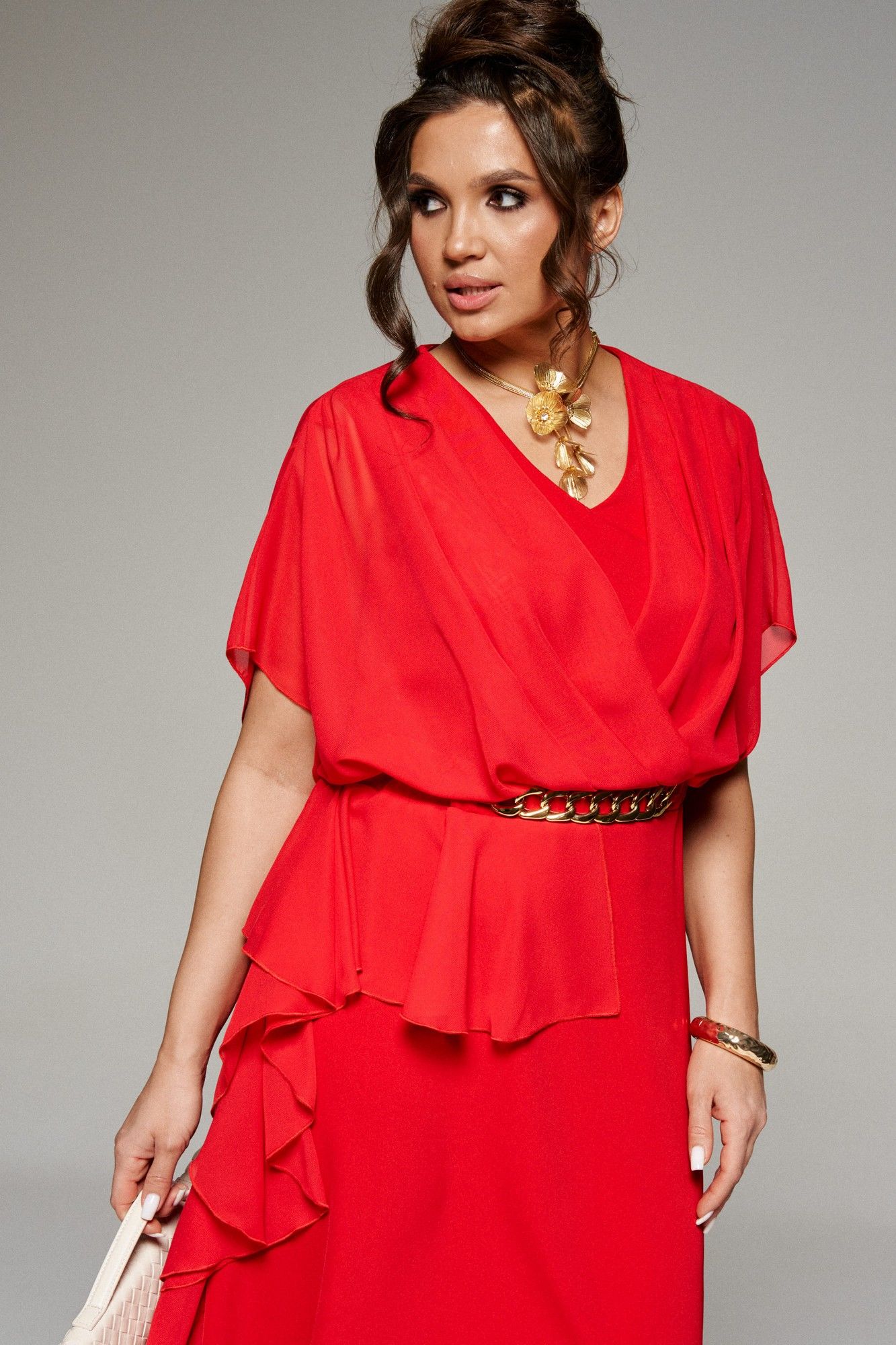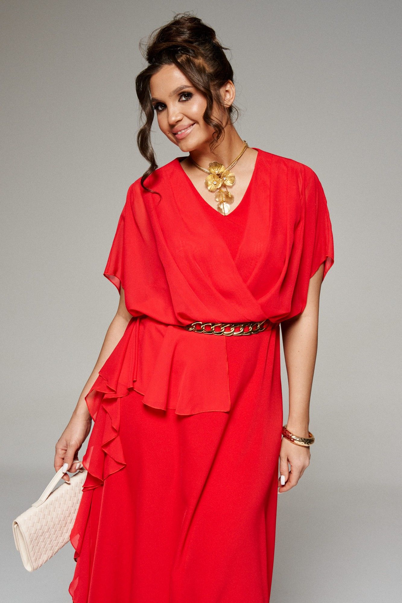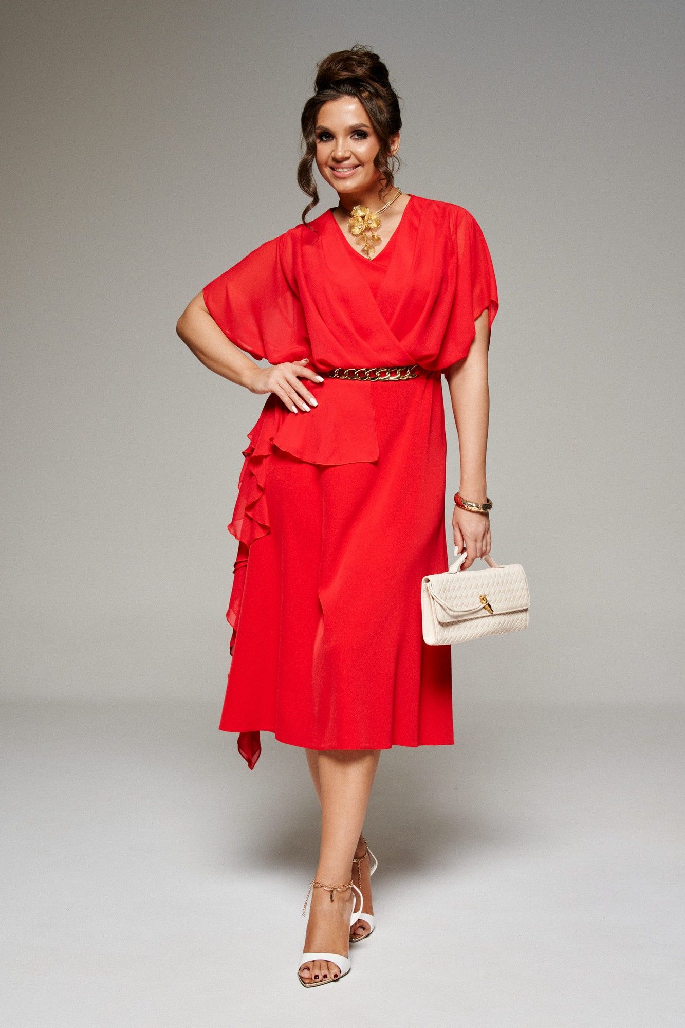 Платье! Нежное и воздушное. Идеальный вариант на каждый день и на деловую встречу. Платье женское в нарядно-романтическом стиле, отрезное по линии талии и декорированное отделочным элементом «под золото», выполнено из комбинации двух тканей: лёгкого струящегося шифона и смесового полотна. У этой ткани нежная, гладко-бархатистая фактура, приятная на ощупь и матовая поверхность, она легко драпируется и очень выгодно и дорого подчеркивает неповторимость образа, а шифон дополняет изысканностью и придаёт индивидуальность. Передняя верхняя часть платья двухслойная. Внутренняя часть, прилегающая к телу, с боковыми рельефами от проймы. Наружная часть из воздушного шифона выполнена на запах, на талии и на плече заложены глубокие складки. Верхняя часть спинки также двухслойная, разрезная по середине. На внутренней спинке для прилегания по талии застрочены вытачки, в средний шов вставлена длинная потайная молния. Средний шов наружной части оформлен в виде щелевидного разреза. По талии заложены мягкие складки. Конструкция верхней части платья выполнена в свободном стиле, нижняя часть платья А-силуэта (передняя цельная, задняя состоит из 2-х частей). На талии расположен пояс, который спереди декорирован отделочным элементом «цепь», а на боковых участках вставлена эластичная тесьма. Справа на юбке спереди и сзади располагаются асимметричные воланы, которые переходят в боковой шов. Рукав цельнокроеный, объёмный, свободный. Горловина округлой формы.