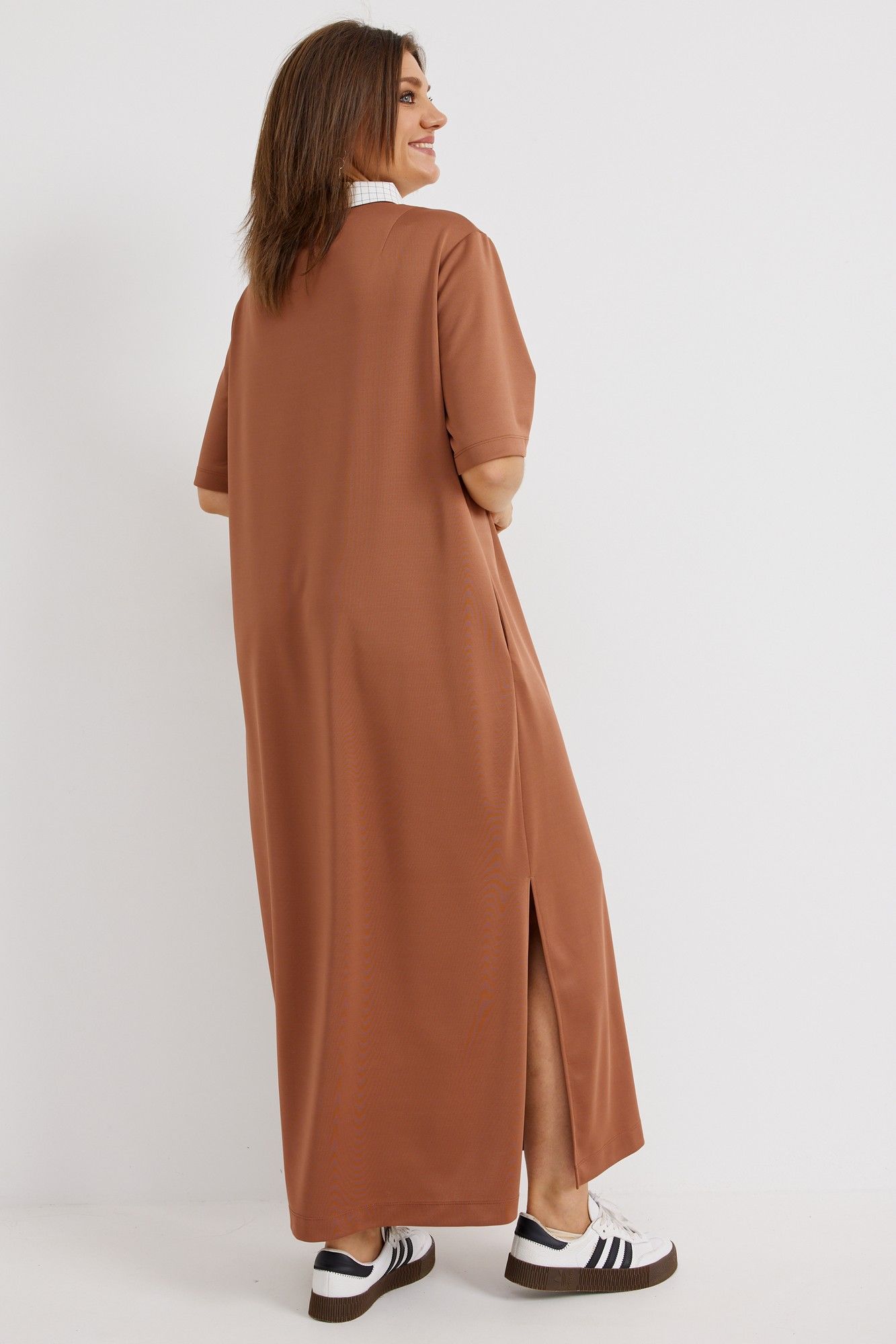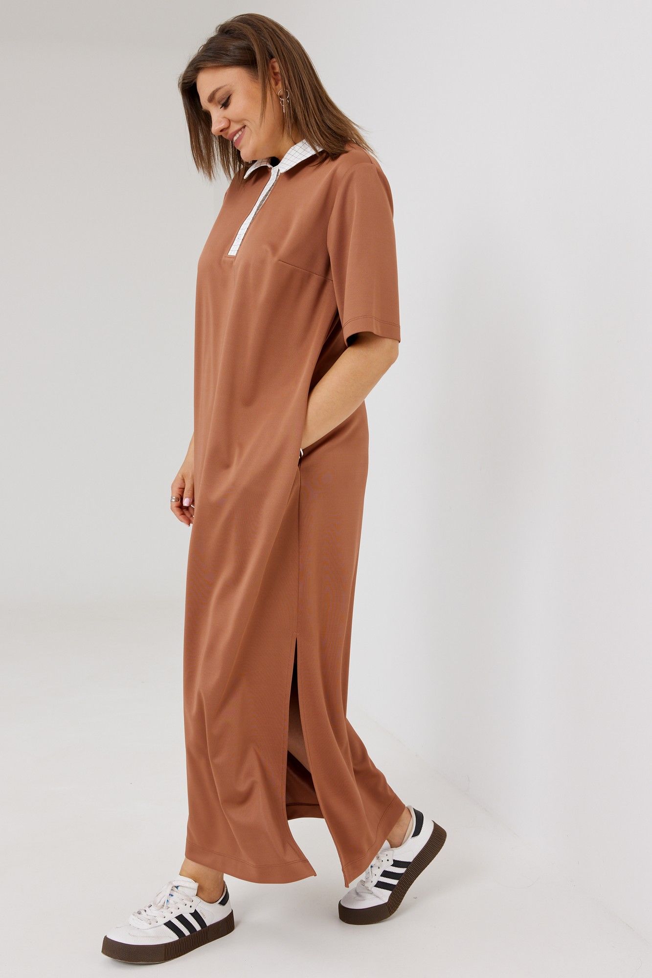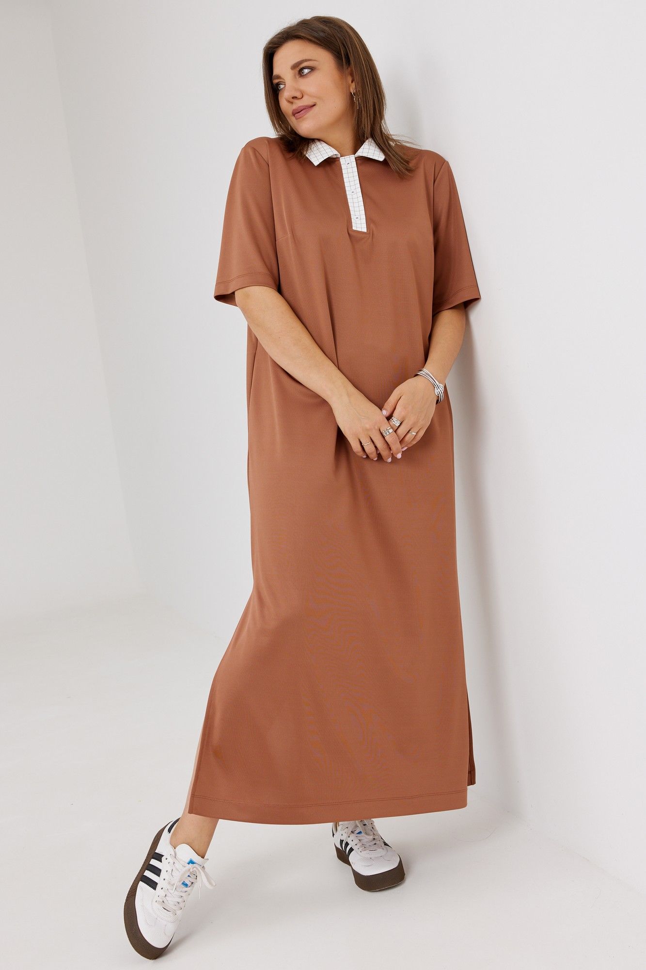 Трикотажное платье поло – это универсальный предмет гардероба, который сочетает в себе спортивный шик и женственность. Оно идеально подходит для созда¬ния множества образов, как повседневных, так и наряд¬ных, и подарит Вам ощущение комфорта на протяжении всего дня. Платье в шикарном терракотовом оттенке позволит создать стильный летний образ. Модель свободного кроя с отложным воротником на планке, выполненной из текстильной ткани в клетку, визуально удлиняет линию шеи. Рукав втачной с подгибкой по линии низа. На груди, а также на спинке расположены вытачки. В боковых швах – карманы и разрезы для Вашего удобства. Ощутите комфорт и свободу, нарядившись в платье на работе, шопинге, во время прогулок по парку и встреч с друзьями. Для того, чтобы правильно подобрать свой размер, необходимо ваш замер объёма груди разделить на 2. (например, объём груди 104:2=52 размер). Замеры в готовом изделии: Длина по спинке от плеча: 142см Длина рукава от проймы: 27см Обхват груди: 120см/48р; 124см/50р; 128см/52р; 132см/54р; 136см/56р; 140см/58р; 144см/60р; 148см/62р. Рост фотомодели 174 см, размер одежды на фото 52. Допуск расхождения в замерах +-2 см.