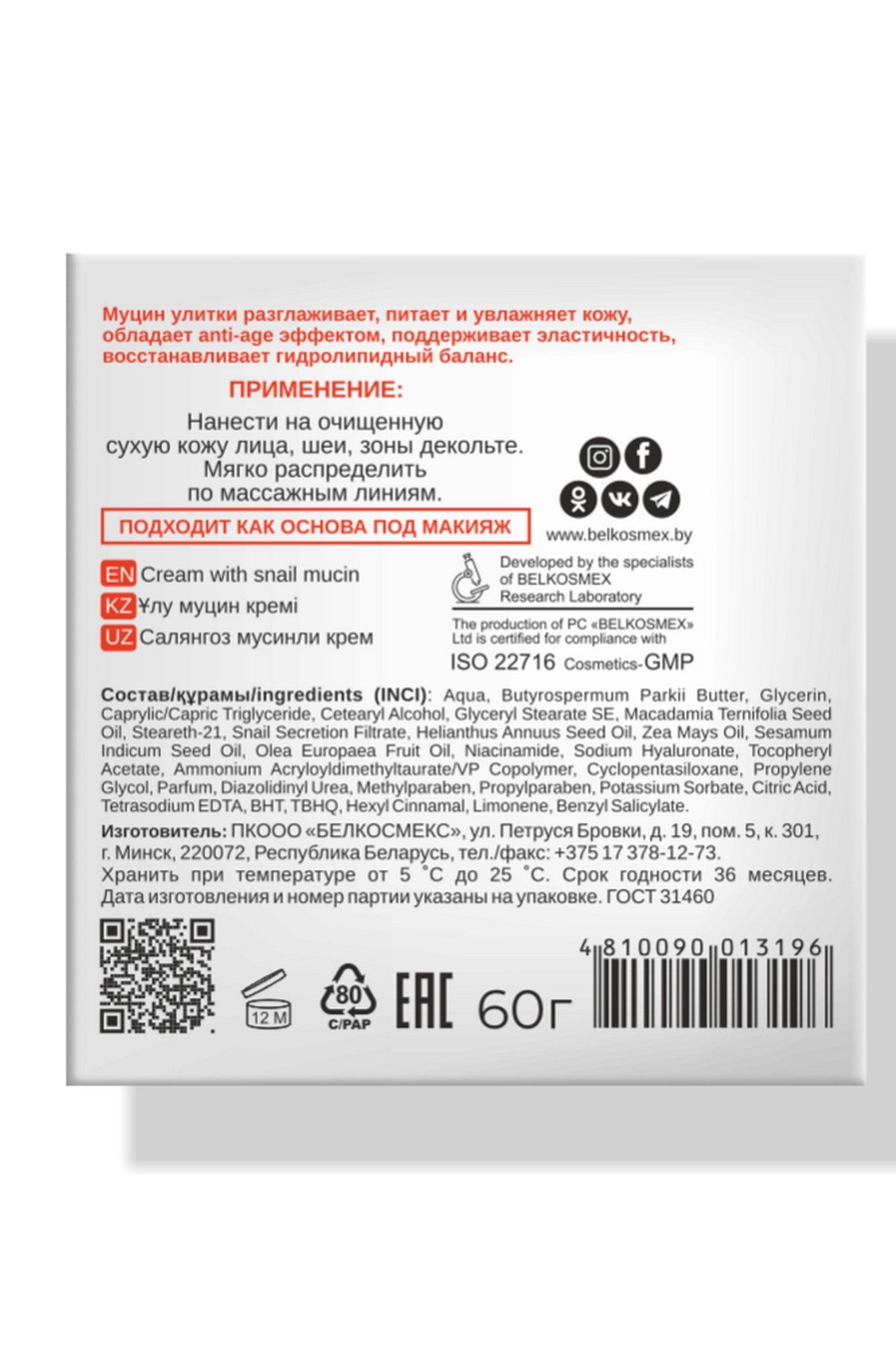 Муцин улитки разглаживает, питает и увлажняет кожу, обладает anti-age эффектом, поддерживает эластичность, восстанавливает гидролипидный баланс. Подходит как основа под макияж. Нанести на очищенную сухую кожу лица, шеи, зоны декольте. Мягко распределить по массажным линиям.