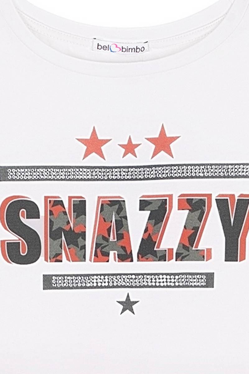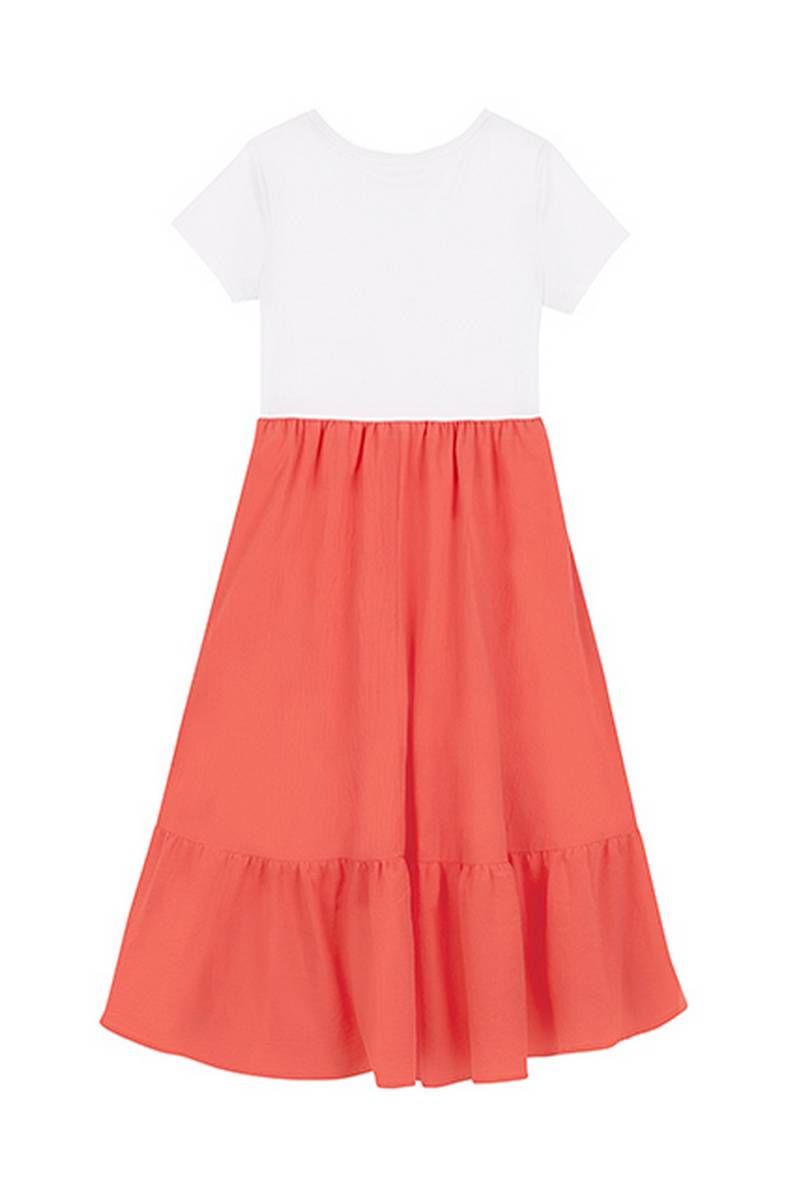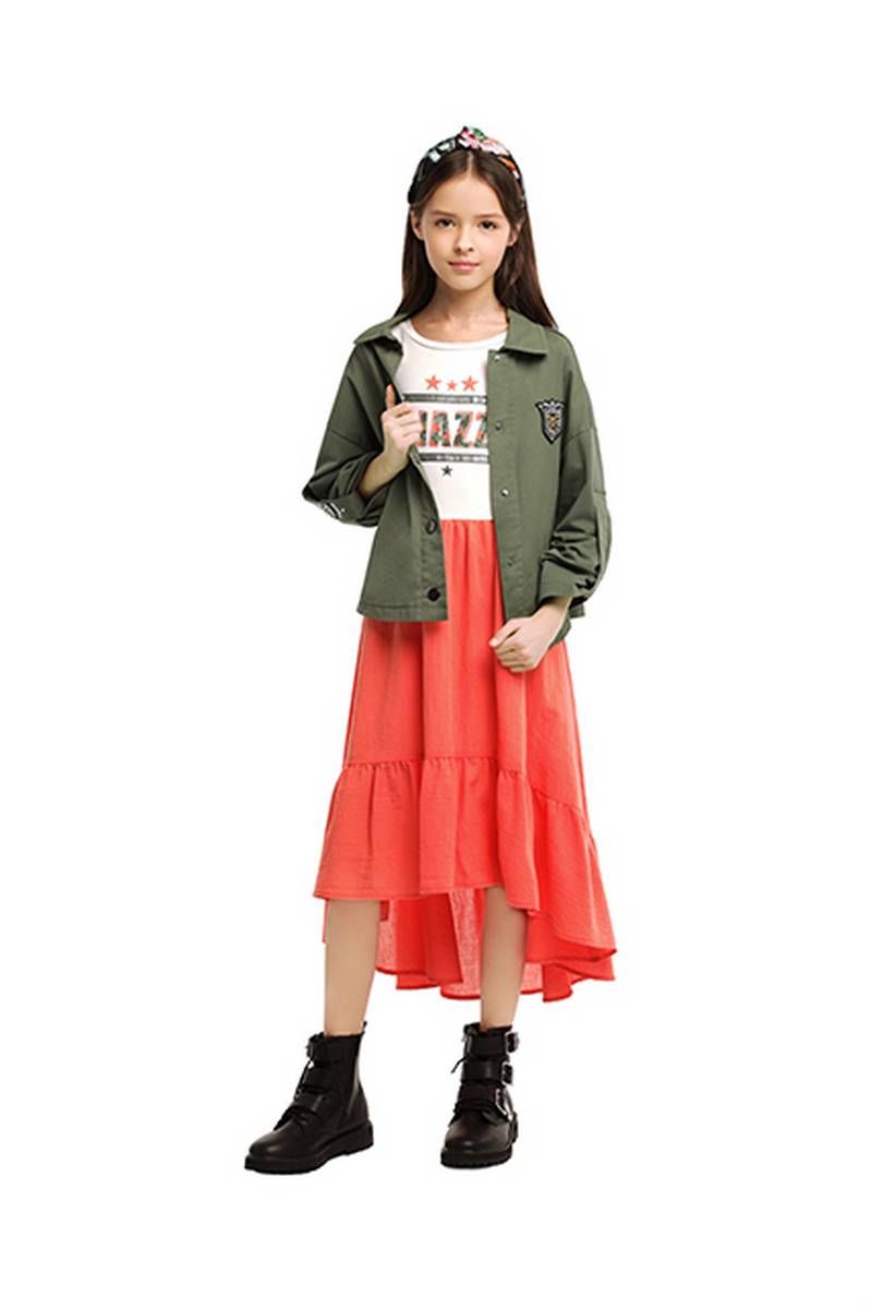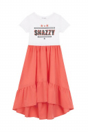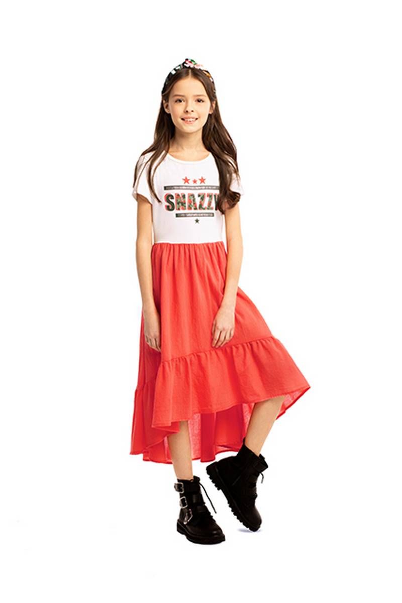 Коралловое платье для девочки с коротким рукавом и круглым вырезом горловины. Принт и стразы в стилистике капсулы "Армия стиля". Юбка с оборками.