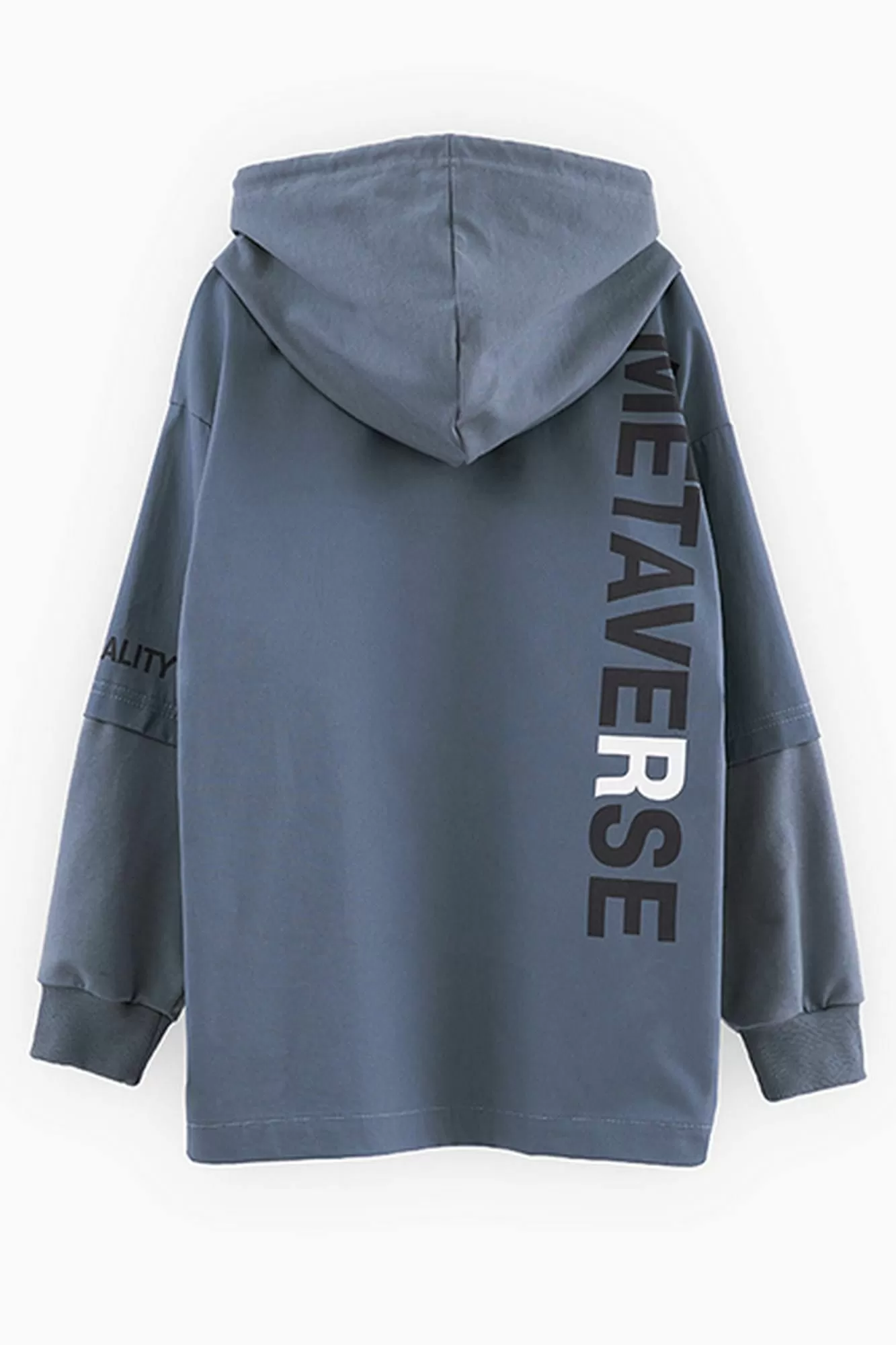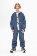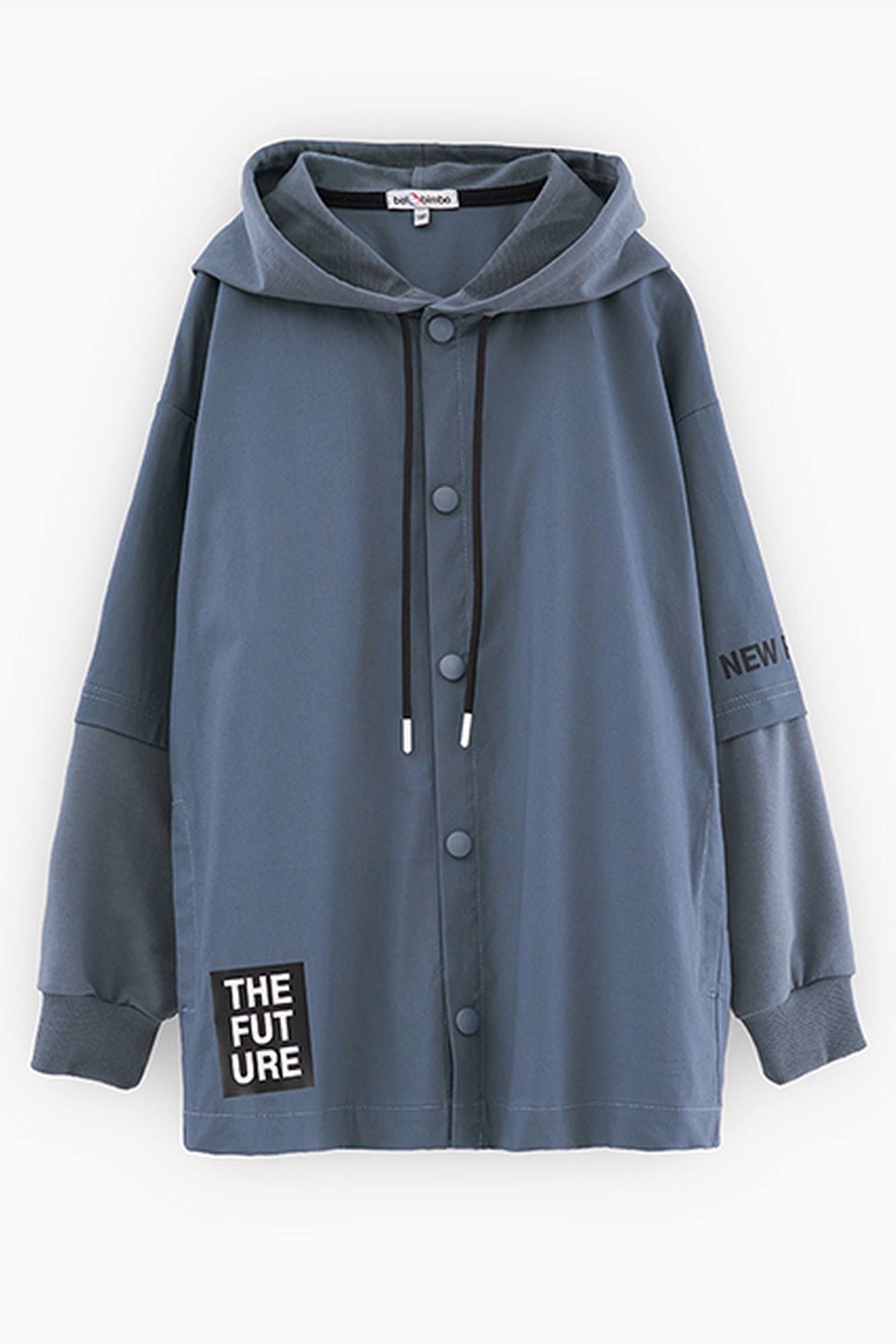 Трендовый жакет-рубашка с капюшоном в оттенке деним. Модель прямого объёмного силуэта с эффектом многослойности. Спущенная линия плеча. Манжеты из рибаны. Комфортная застёжка на кнопки. Комбинация материалов: футер и твил. Карманы в шве. Шрифтовой принт