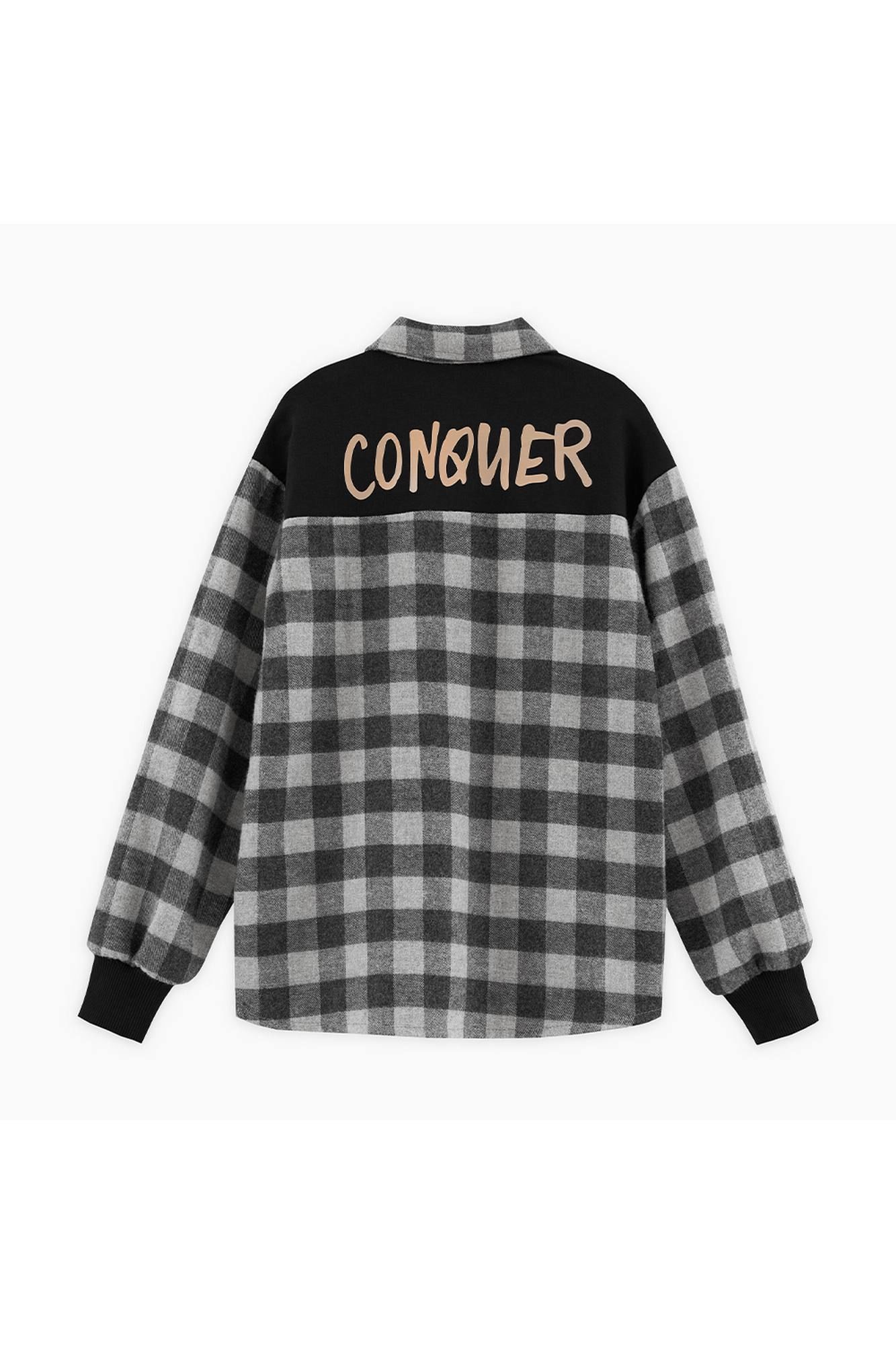 Стильная рубашка в клетку. Модель прямого силуэта. Приспущенная линия плеча. Манжеты из эластичной рибаны. Комфортная застёжка на кнопки. Рубашка из тактильно приятной фланели с контрастной кокеткой декорирована авторскими DTF и трансферными печатями.