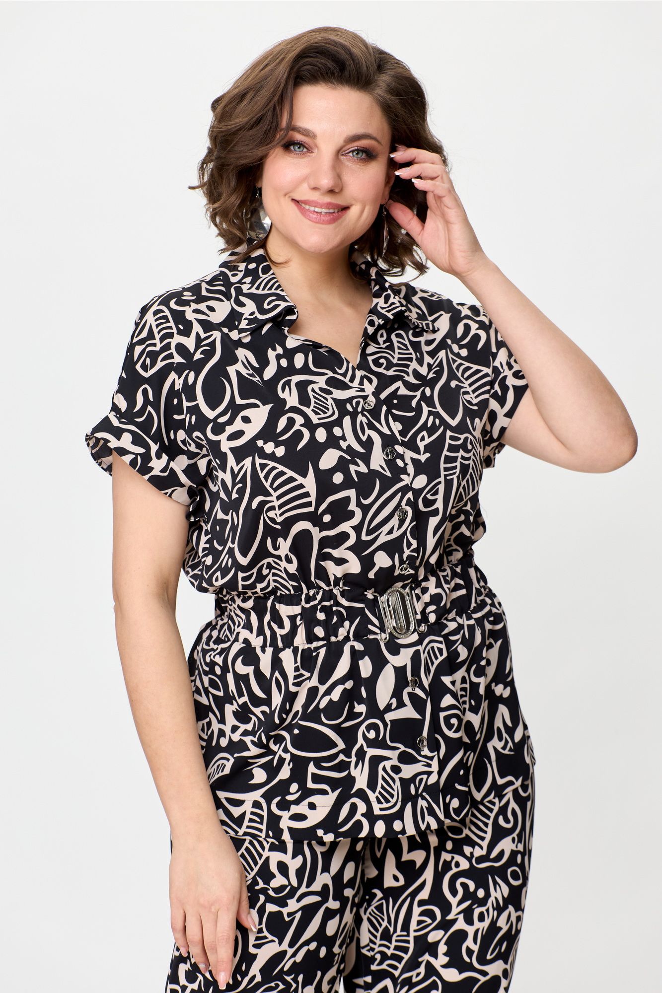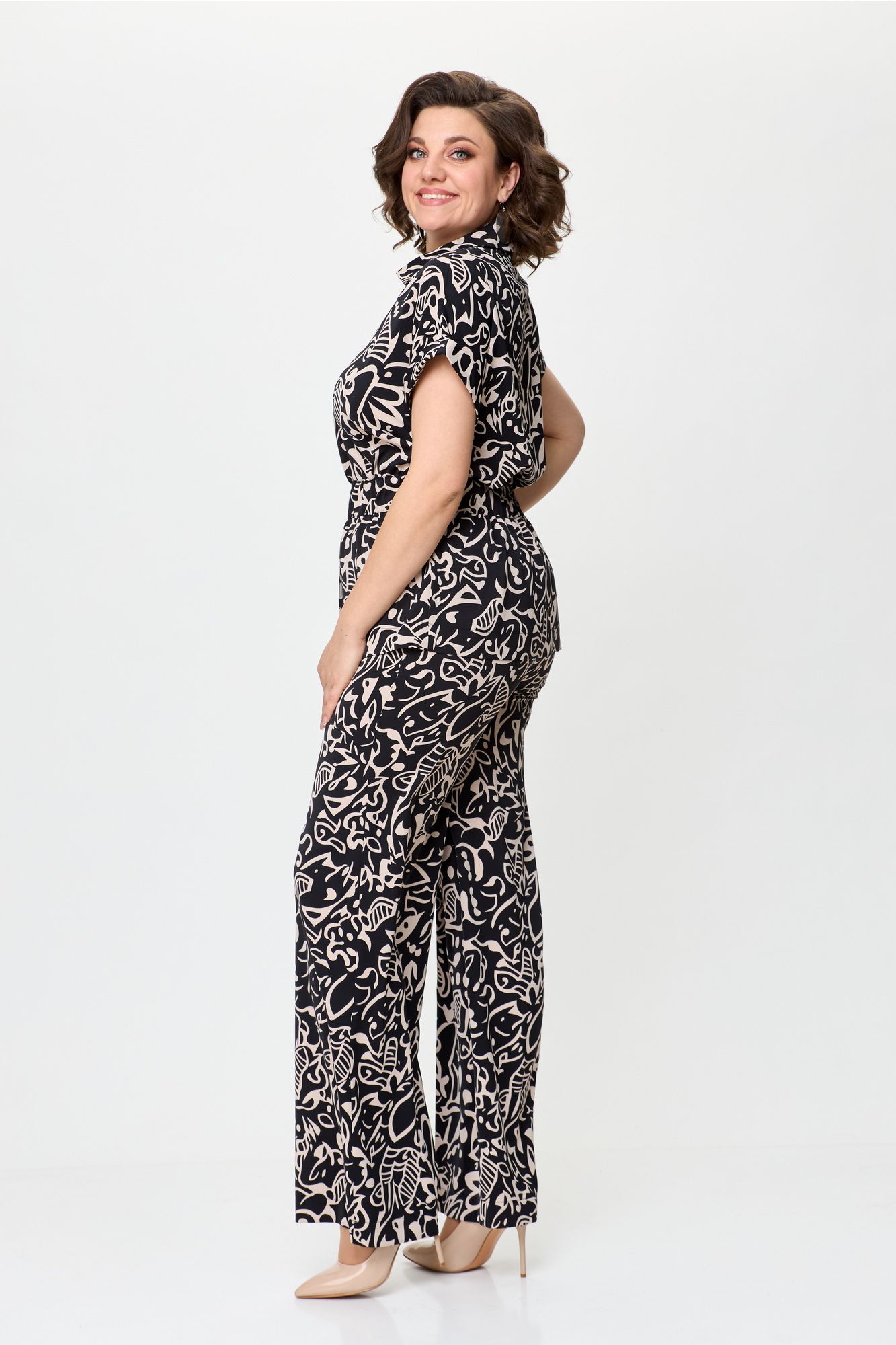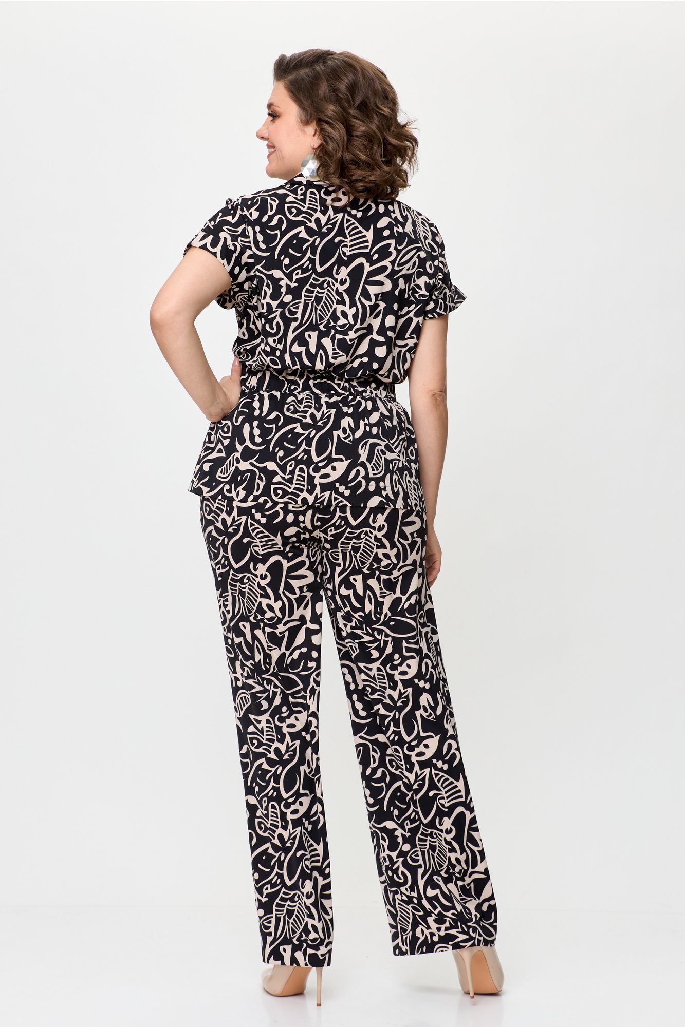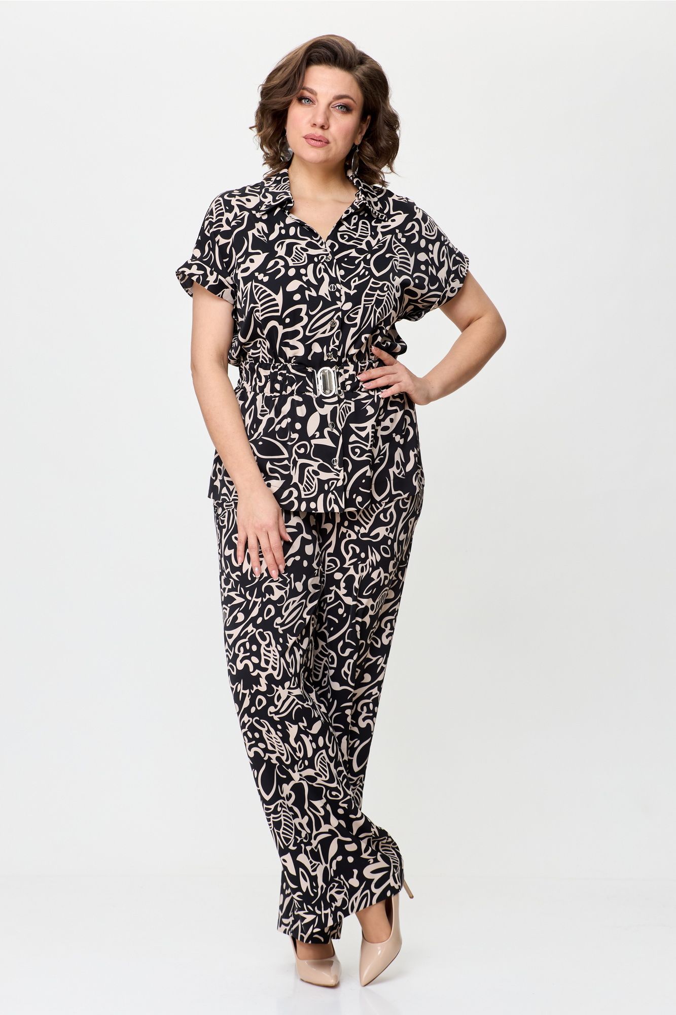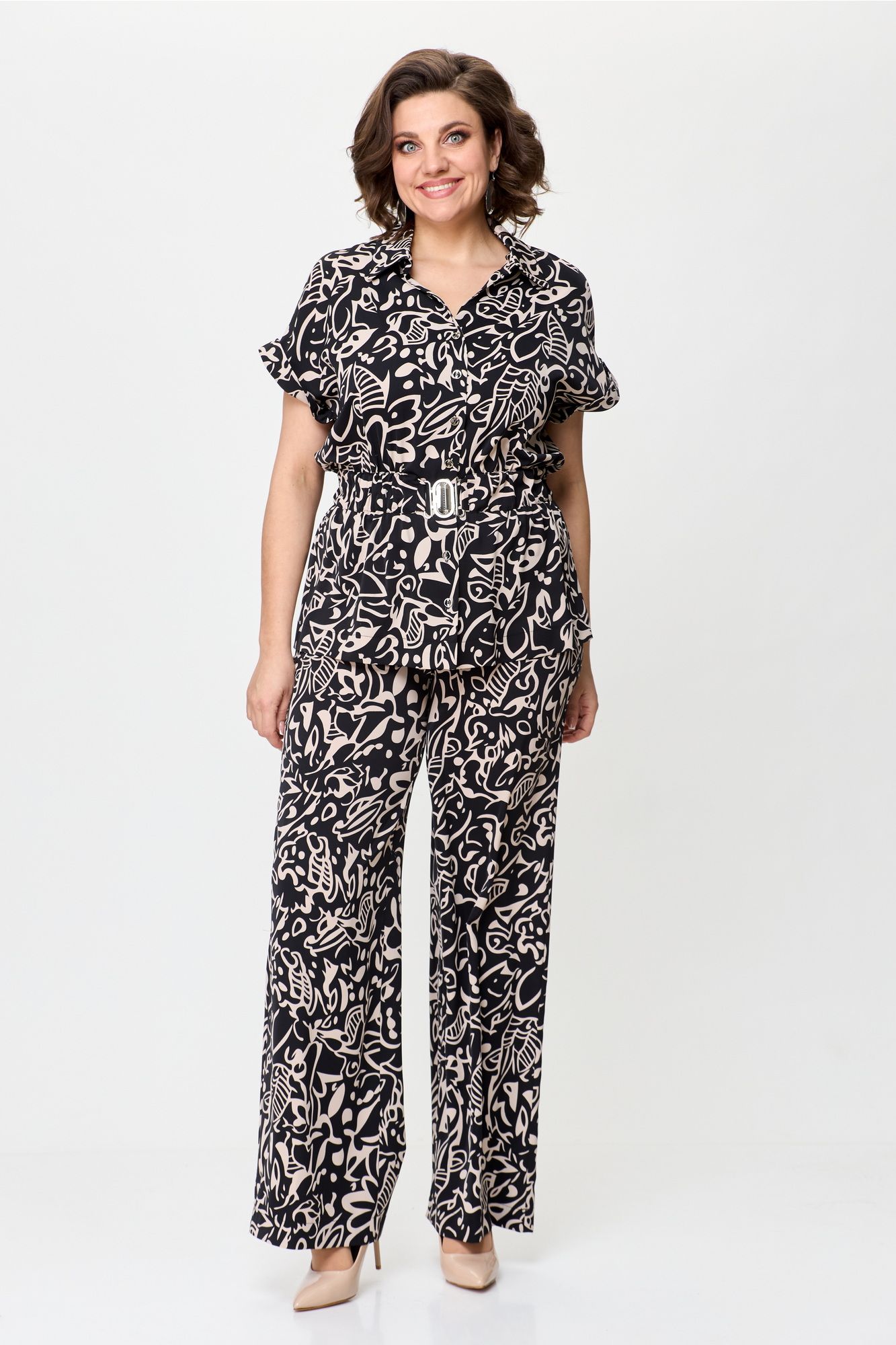 Стильный женский комплект выполнен из атласной струящейся ткани. Блузон свободного силуэта с центральной застежкой на петли пуговицы, горловина оформлена рубашечным воротником на стойке. По линии талии настрочена кулиса с резинкой и декоративной линией плеча с отложной притачной манжетой. Брюки расширенные от линии бедер. Верх брюк на резинке. Длина блузона – 71 см Ширина плеча – 32 см Длина брюк – 113 см
