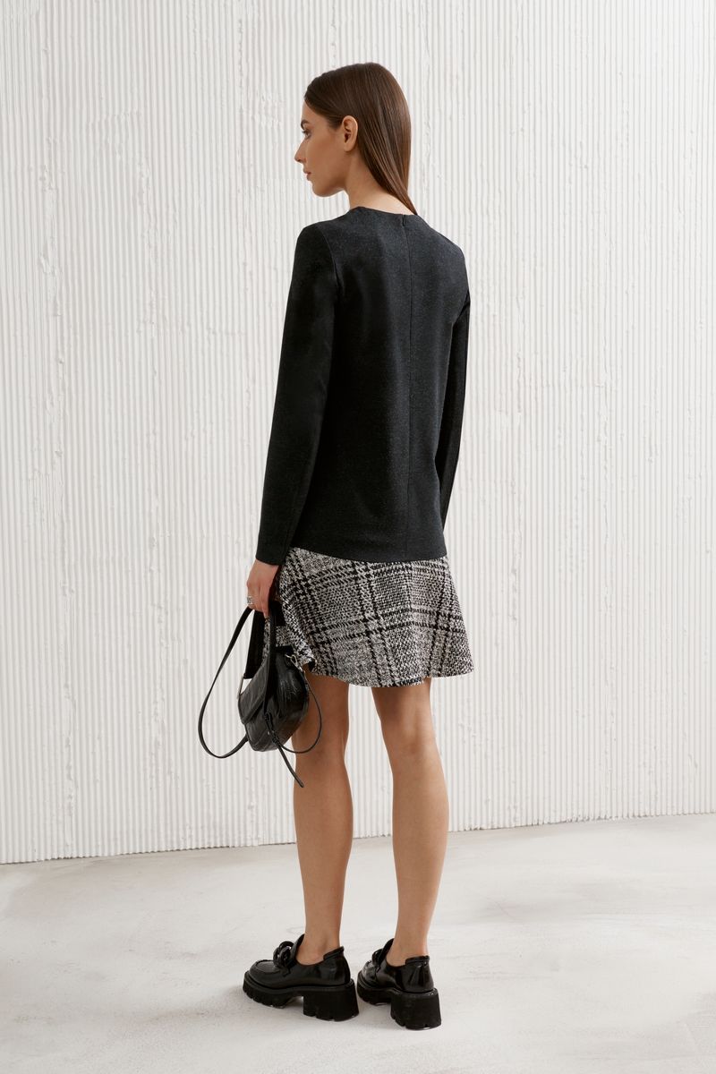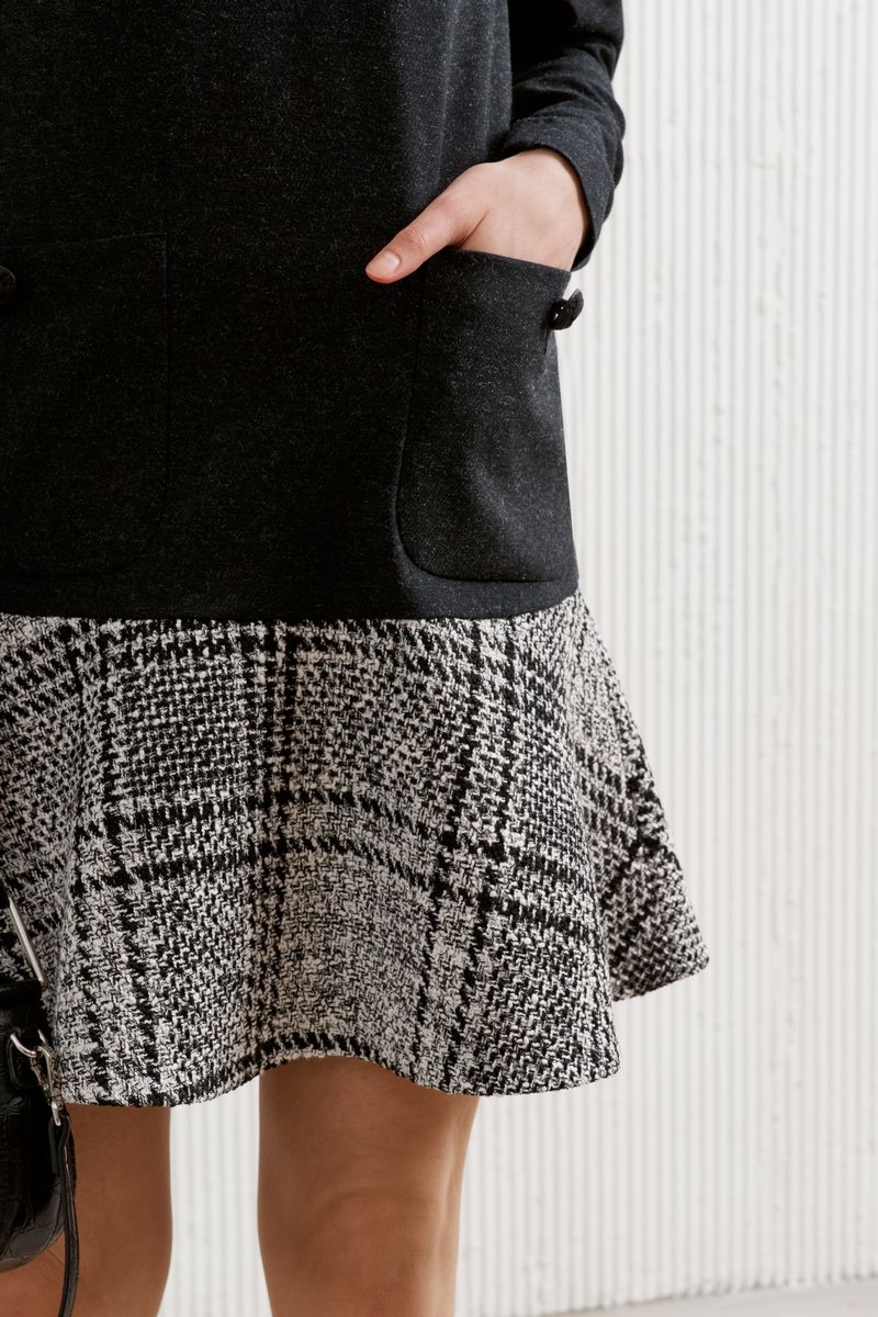 Платье женское,прямого силуэта,длиной выше линии колен,длинными втачными рукавами,круглым вырезом горловины,воланом по низу из отделочной ткани ,накладными карманами по переду и застежкой на тесьму-молнию в среднем шве спинки.