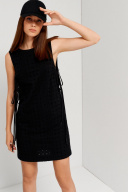 Платье женское,длиной выше линии колен,прямого силуэта,без рукавов,с круглым вырезом горловины по переду и V-образным вырезом горловины по спинке,углубленной линией проймы,завязывающимися на шнурки.Платье выполнено на комбинации двух тканей.