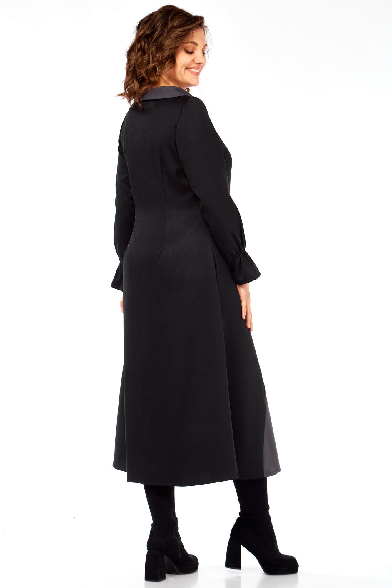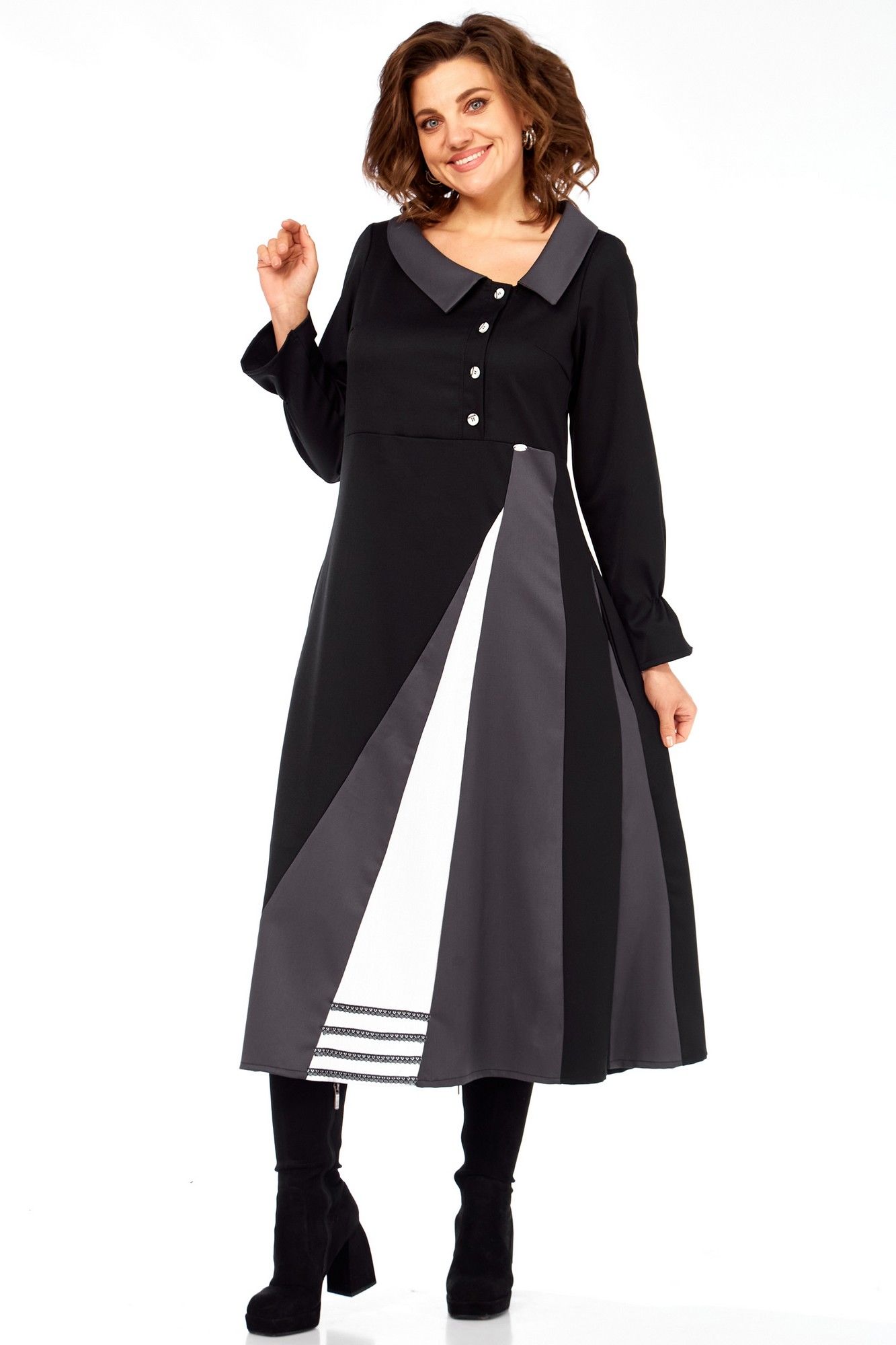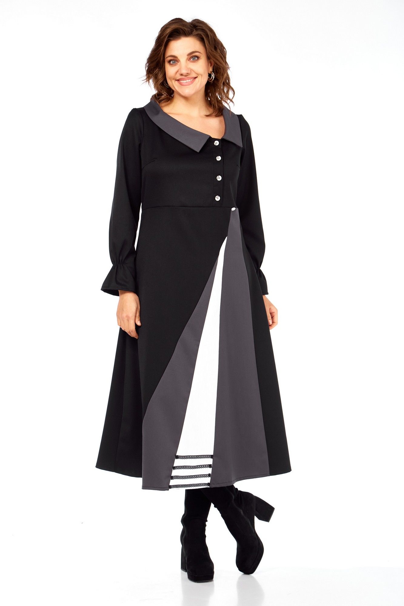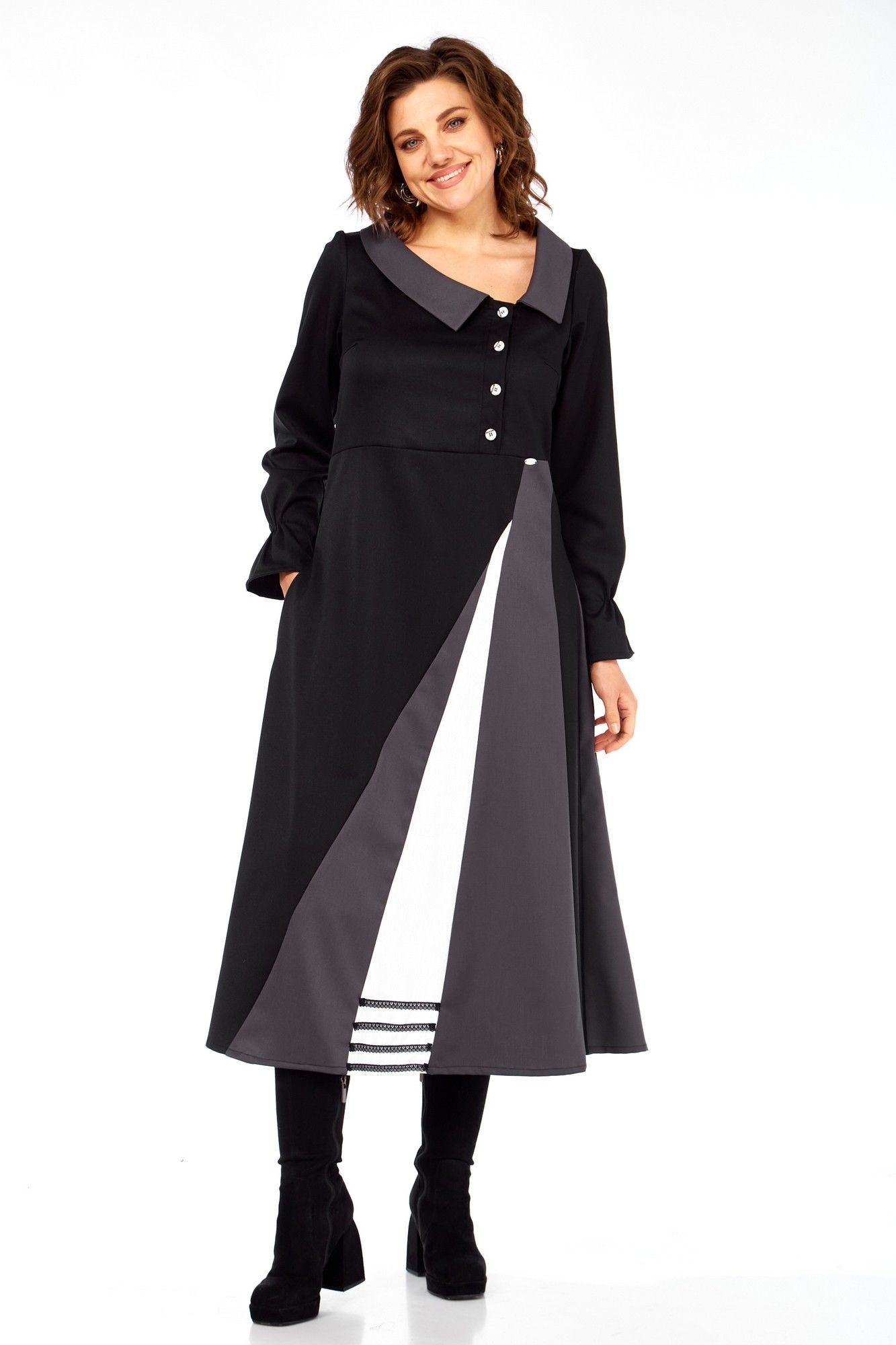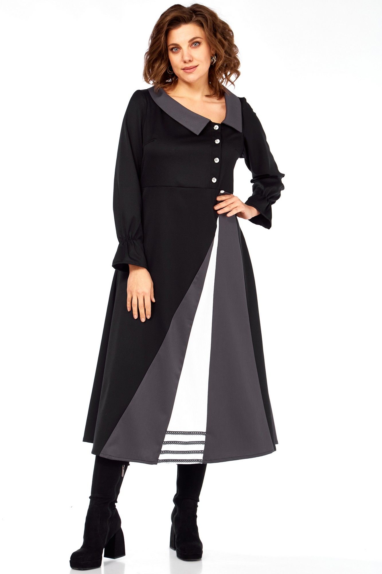 Это платье-ода элегантности движения и архитектурной точности, где каждый элемент продуман до мелочей. Асимметричные диагональные линии и расклешенный подол визуально вытягивают фигуру, делая ее стройнее и изящнее. Вы будете чувствовать себя уверенно и грациозно. Контраст черного, серого и белого создает графический, но не резкий образ, ассиметричные линии и "разрез" на юбке придают платью динамику, словно оно находится в постоянном, но контролируемом движении. Широкий воротник и декоративные пуговицы напоминают о винтажных патьях и шинелях, добавляя нотку ретро-шика и благородства. Забудьте о скучных нарядах! Это платье — произведение искусства, где каждая линия и каждый цвет продуманы, Вы будете ловить восхищенные взгляды, куда бы ни пошли. Техническое описание: Платье миди сложного асимметричного кроя, силуэт полуприлегающий в верхней части, переходящий в расклешенный А-силуэт к низу, создающий эффект удлиненной и струящейся фигуры. Воротник широкий, плоский, отложной, с закругленными краями, выполненный из темно-серой ткани, что придает ему элегантность и слегка винтажный акцент. Лиф приталенный, с застежкой на петли пуговицы. Декоративный ряд контрастных пуговиц, расположенных асимметрично, подчеркивает V-образный вырез и утончает силуэт. Рукава длинные, втачные, с легкой сборкой на манжетах, что добавляет мягкости и женственности. Основная часть низа выполнена из плотной черной ткани. Главная изюминка — асимметричный крой с вертикальными контрастными вставками, создающими эффект интригующего запаха или разреза. Контрастные вставки из черного основания юбки вырываются две широкие клиновидные вставки: одна темно-серая, другая — ярко-белая. Они расположены диагонально, пересекаясь, и создают визуальную игру. Белая вставка имеет выраженный декор в нижней части — три горизонтальные кружевные полоски, что добавляет графичности и уникальности. Спинка цельнокроеная с двумя выточками для лучшего прилегания фигуры, выполнена из основной черной ткани, подчеркивая стройность силуэта. длинаспинки 125смлина рука6см