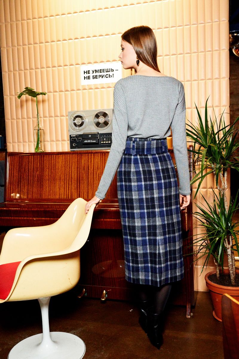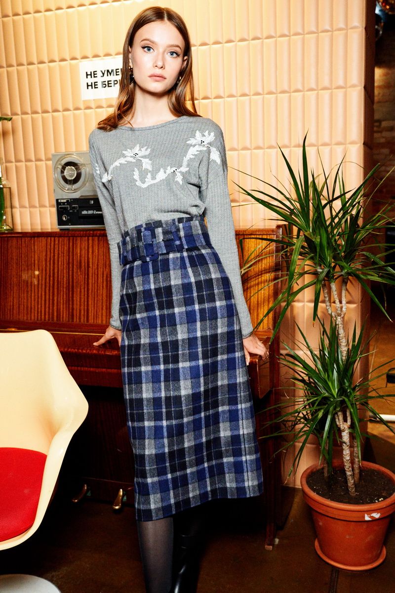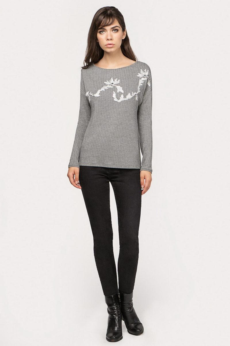 Свободный джемпер с вышивкой из итальянского трикотажа длиной 58,0 см, со спущенной линией плеч, втачным покроем рукава длиной 46,0 см. Горловина формы "лодочка". Поверхность трикотажа матовая с мелким узором "елочка".