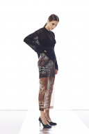 Юбка прямого силуэта выполнена из принтованной органзы . Юбка на трикотажной подкладке , по спинке разрез . Верх юбки обработан притачным поясом , застежка на потайную молнию .